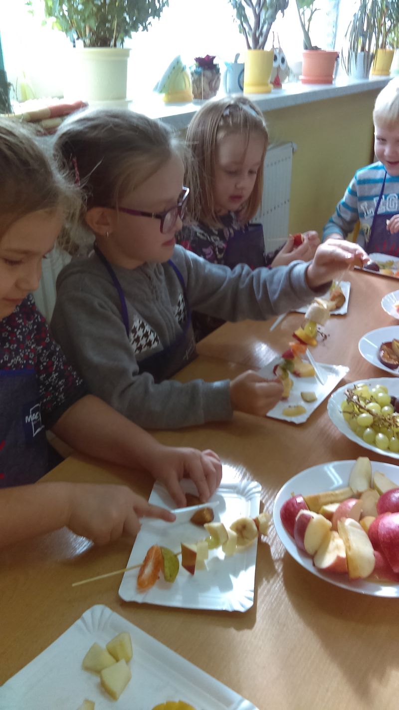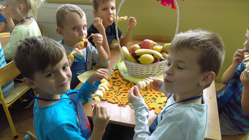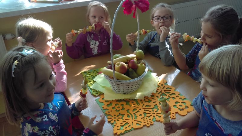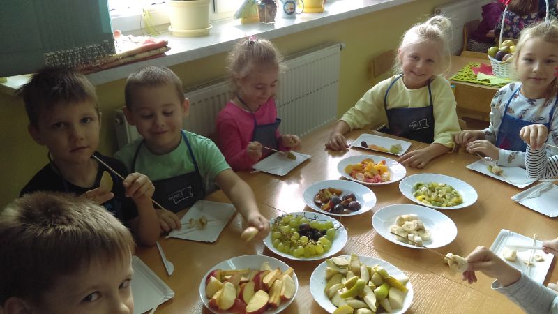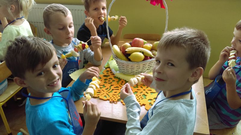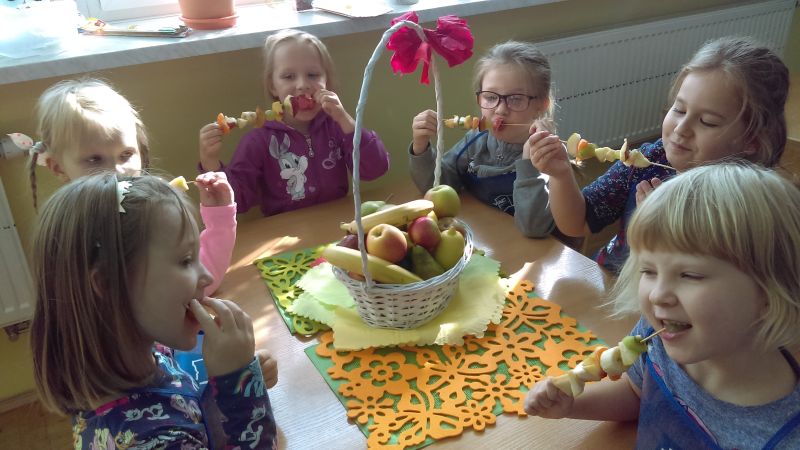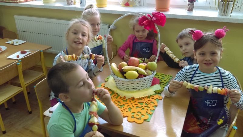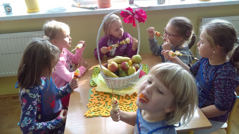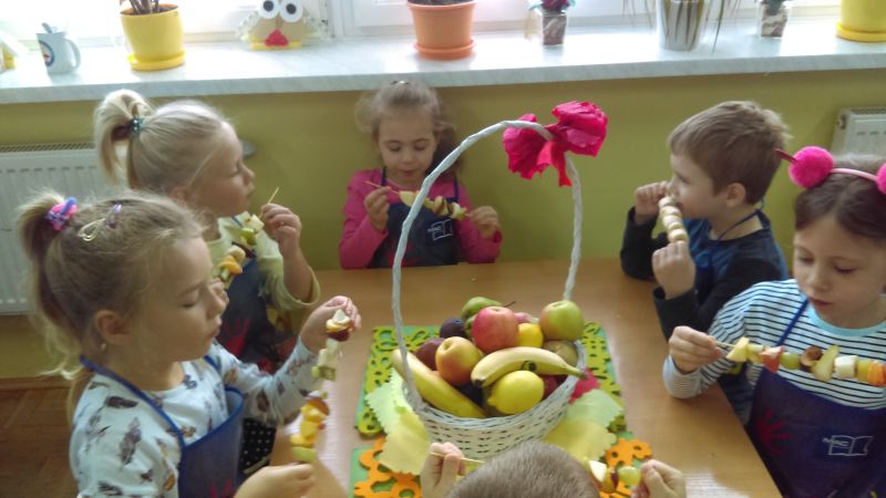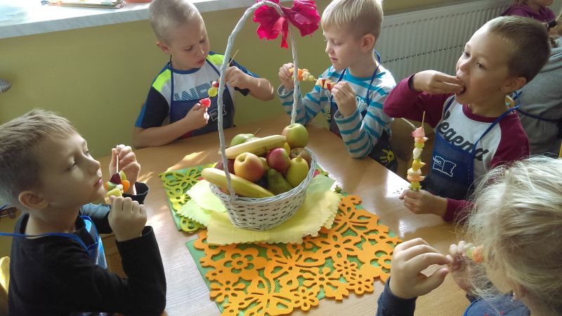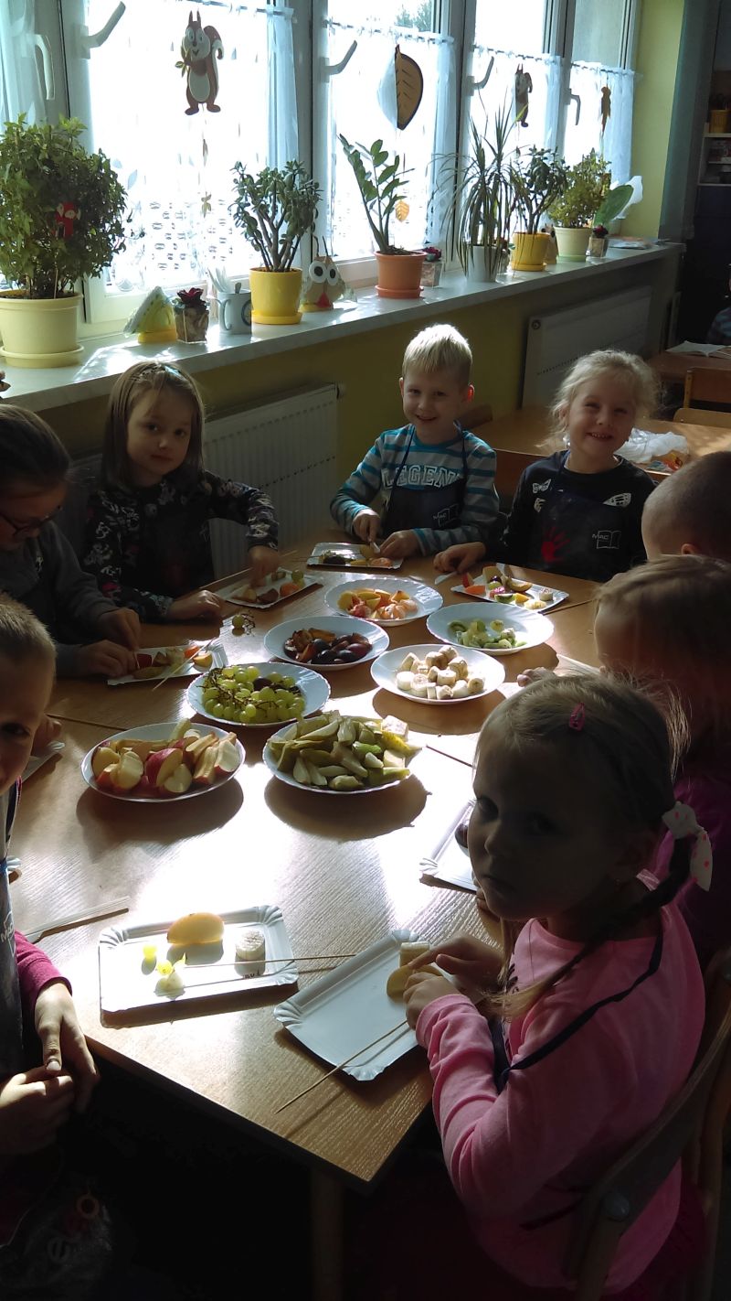 Zdrowo się odżywiamy, wszystkie owoce i warzywa znamy i bardzo chętnie w naszym przedszkolu je zjadamy.