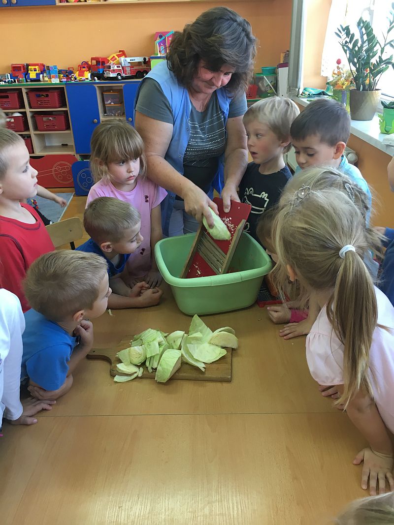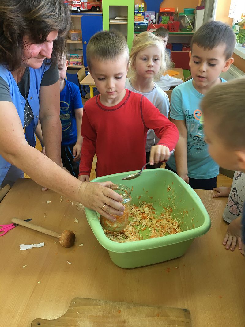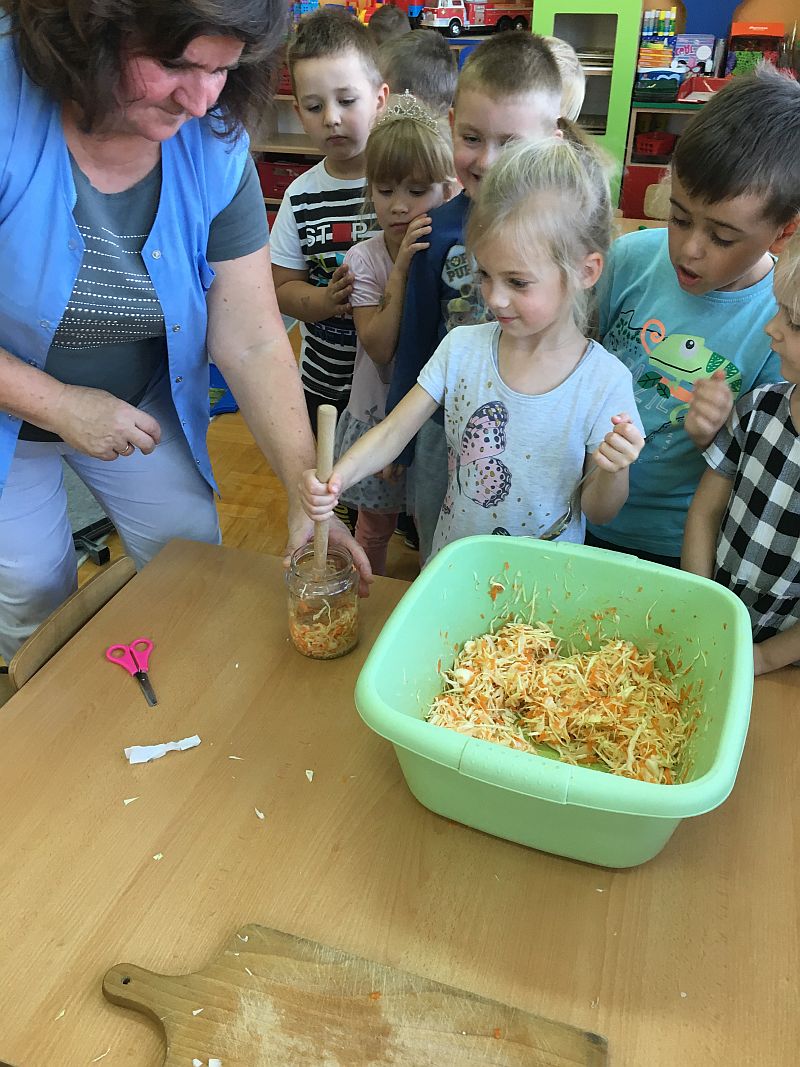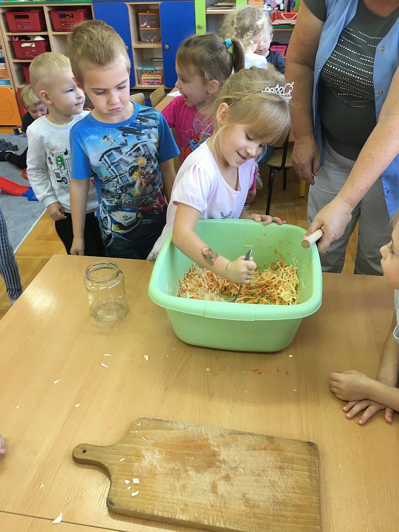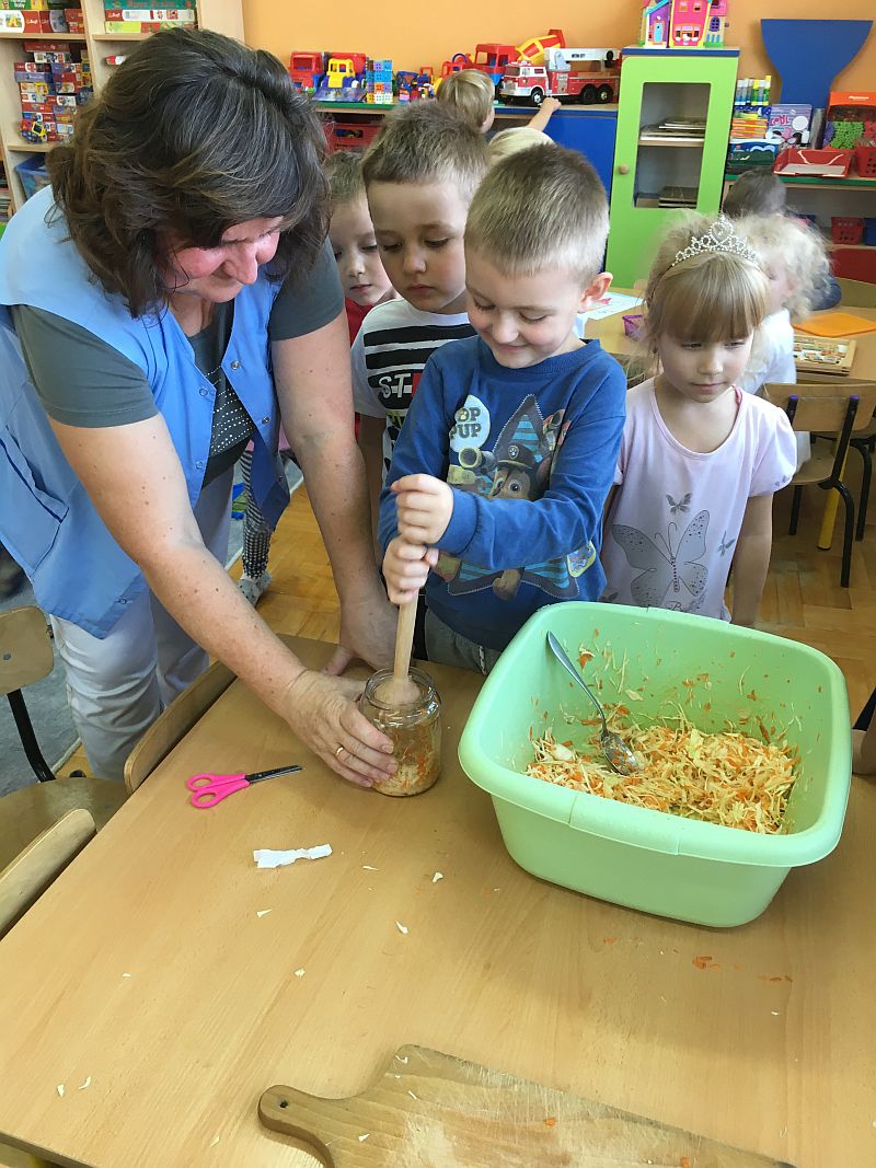W ramach realizowanego tematu „Przygotowanie ludzi do zimy” dzieci zapoznały się z procesem kiszenia kapusty poprzez praktyczne zajęcia. Dzieci z wielkim zainteresowaniem obserwowały i wykonywały niektóre czynności związane z przygotowaniem i kiszeniem kapusty. Dowiedziały się również, że domowe przetwory a zwłaszcza kiszonki są bardzo zdrowe i należy je spożywać zwłaszcza w okresie zimowym.