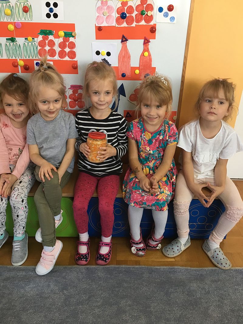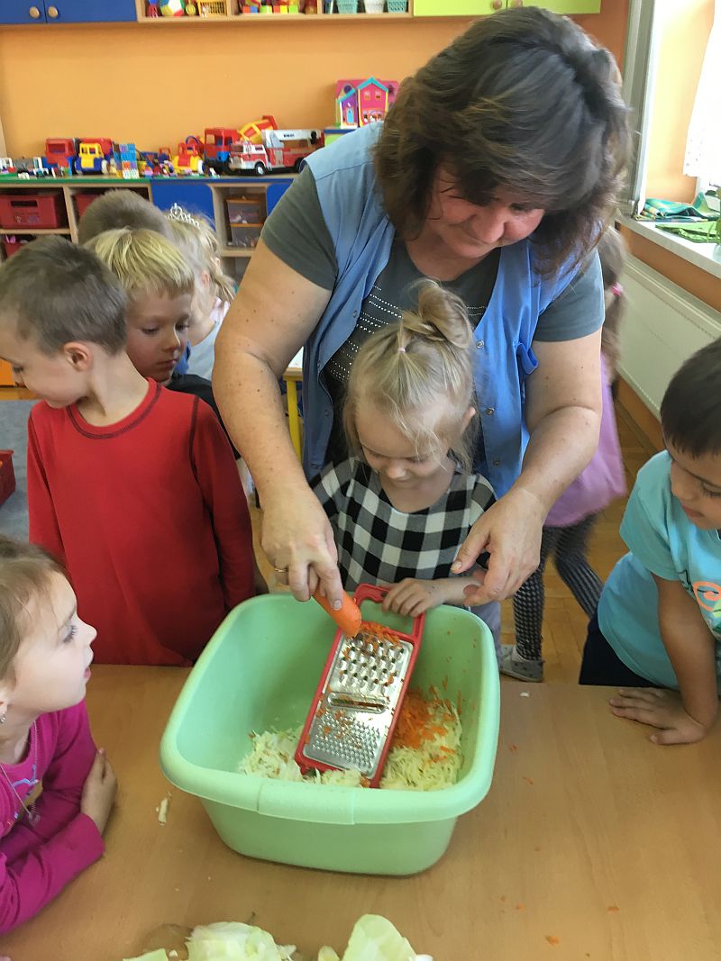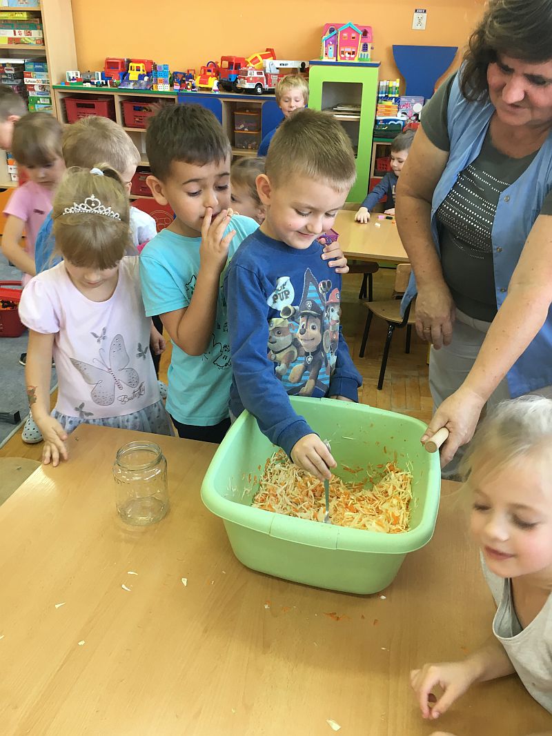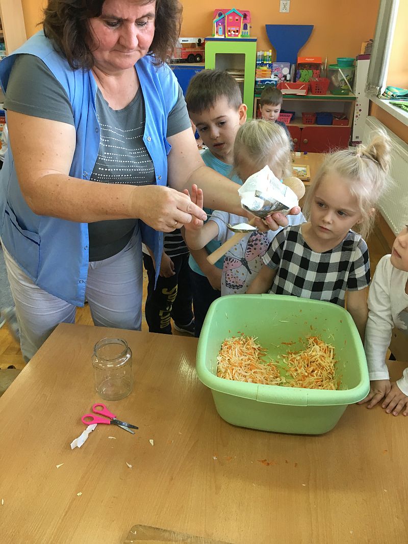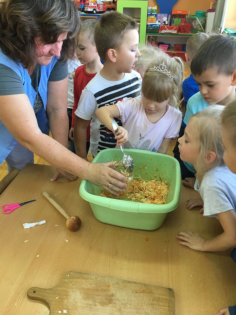 W ramach realizowanego tematu „Przygotowanie ludzi do zimy” dzieci zapoznały się z procesem kiszenia kapusty poprzez praktyczne zajęcia. Dzieci z wielkim zainteresowaniem obserwowały i wykonywały niektóre czynności związane z przygotowaniem i kiszeniem kapusty. Dowiedziały się również, że domowe przetwory a zwłaszcza kiszonki są bardzo zdrowe i należy je spożywać zwłaszcza w okresie zimowym.