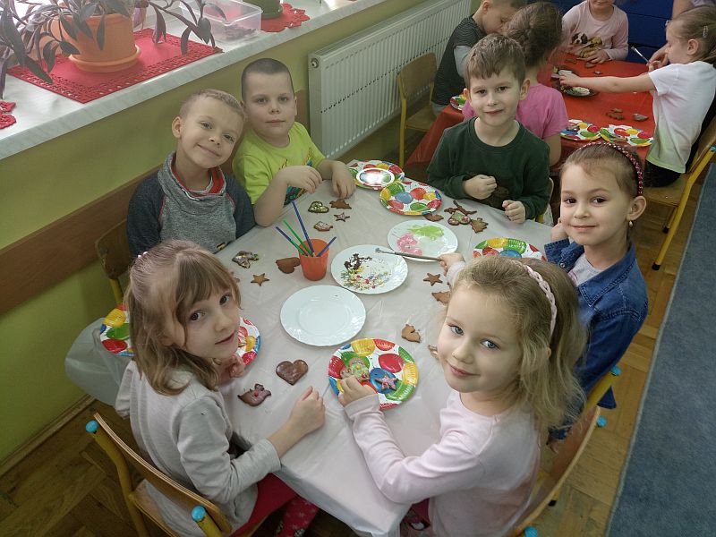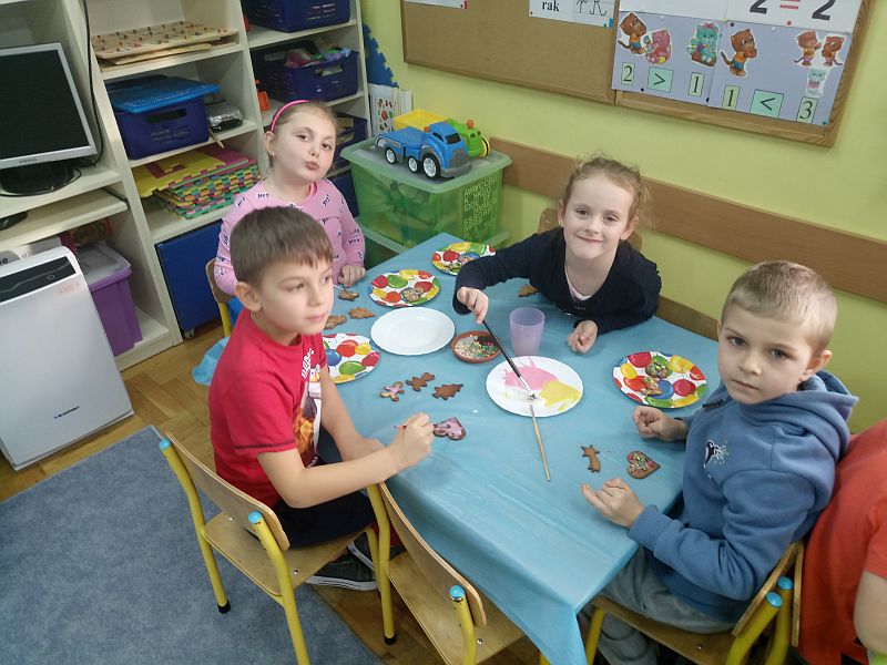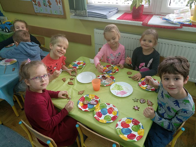 Przed świętami Bożego Narodzenia dzieci z oddziału VI dekorowały pierniczki, wcześniej przygotowane przez Panią Anię. Dzieci dowiedziały się jakich składników i przypraw używa się do produkcji ciasta. Najpierw rozpoznawały po zapachu przyprawy, a następnie nadszedł czas na ozdabianie pierniczków. Z wielkim zaangażowaniem starszaki ozdabiały swoje ciasteczka różnokolorowym lukrem, a także kolorowymi posypkami. Każdy pierniczek był wyjątkowy i bardzo kolorowy. Po skończonej pracy wypieki zostały spakowane i każde dziecko zabrało swoje słodkości do domu.