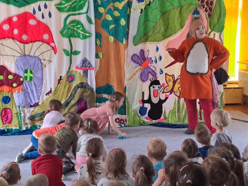 We wtorek w naszym przedszkolu odbył się spektakl teatru Canon, pt. -Wiosenna pobudka. dla dzieci ze wszystkich grup wiekowych. Podczas występu dzieci nauczyły się jak dbać o środowisko, omówiły z aktorami zmiany zachodzące w przyrodzie podczas wiosny oraz wiele innych ciekawych rzeczy. W przedstawieniu wystąpili Bociek, który wrócił z ciepłych krajów, Sójka modnisia, która jak to bywa w powiedzeniu -Wybiera się Sójka za morze, ale wybrać się nie może- , Wiewiórka Baśka, która uwielbia porządek oraz zaspany po Zimie Miś Maciek. Przy wesołym śpiewie aktorów dzieci mogły się poruszać. Radości nie było końca!