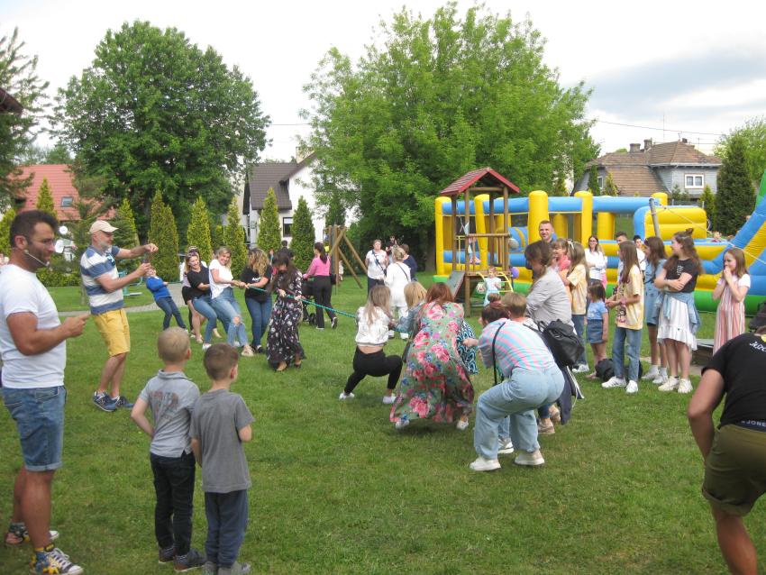 30 maja 2023r w naszym przedszkolu odbył się Piknik Rodzinny. Celem imprezy było zachęcenie rodziców do wspólnych zabaw ze swoimi dziećmi oraz do aktywnego spędzania wolnego czasu. Była to także doskonała okazja do uczczenia Dnia Mamy i Dnia Taty. Korzystając z okazji dzieci z przedszkola dały piękny pokaz swoich umiejętności wokalnych, śpiewając wzruszające piosenki ,deklamując wiersze oraz prezentując przed swoimi  rodzicami pokazy taneczne.Na pikniku wielkie zainteresowanie przedszkolaków budził kącik, w którym każde dziecko mogło zmienić swój wizerunek i pomalować swoją buzię. Nie mniejszą popularnością cieszyły się ogromne dmuchańce :zjeżdżalnia i tory przeszkód- ogromny krokodyl i gaj palmowy. Rodzice wraz z dziećmi mogli brać udział w licznych konkursach organizowanych przez  Pracownię Jaszczur &Przyjaciele. Uczestnicy pikniku mogli także skorzystać z serwowanych kiełbasek z grilla, ciast upieczonych przez rodziców, waty cukrowej ,gofrów i pysznych napojów. Mnóstwo atrakcji i piękna pogoda w tym dniu sprawiły,że na wszystkich twarzach gościł uśmiech i radość.