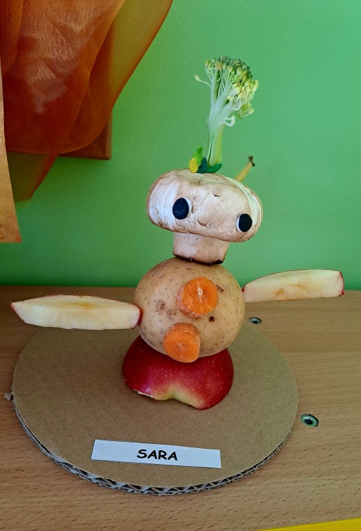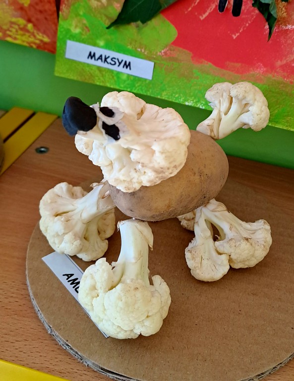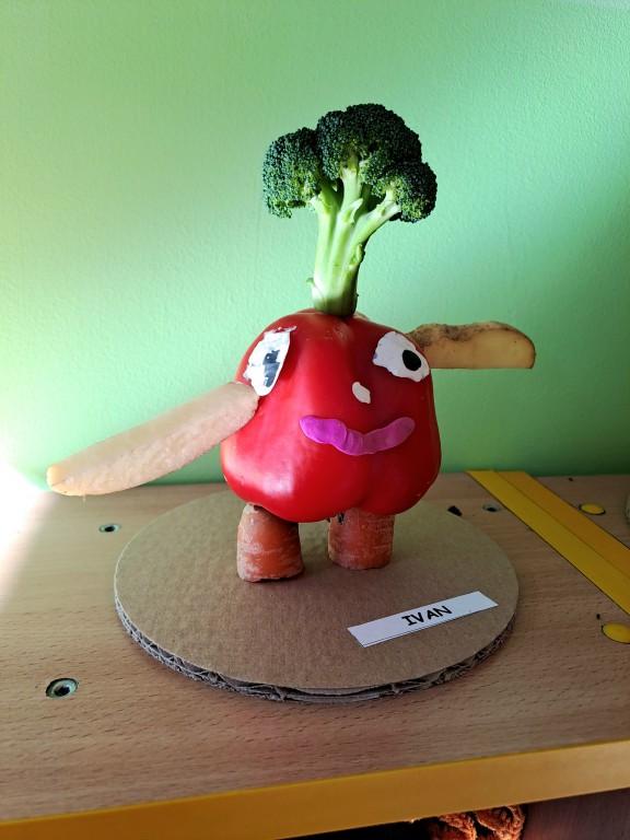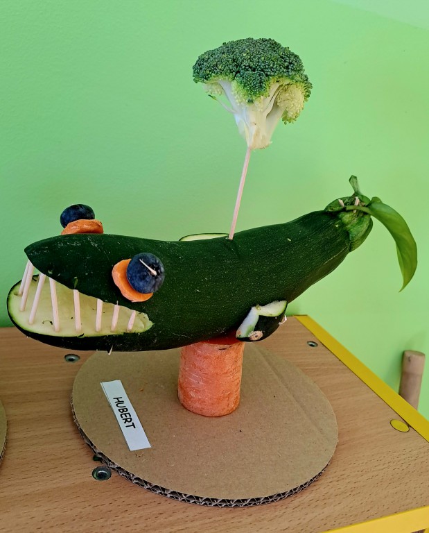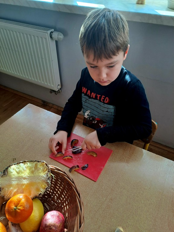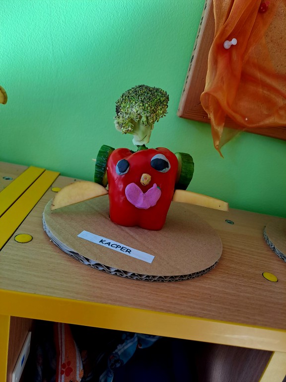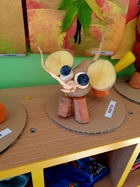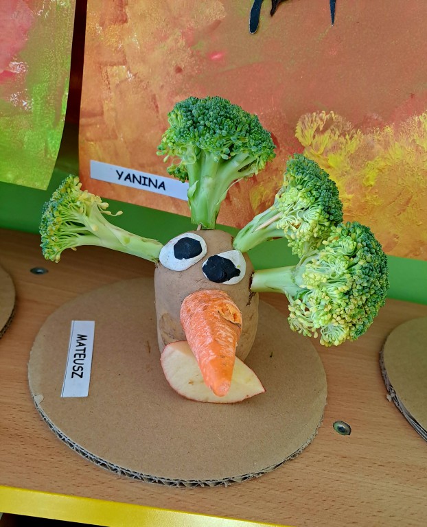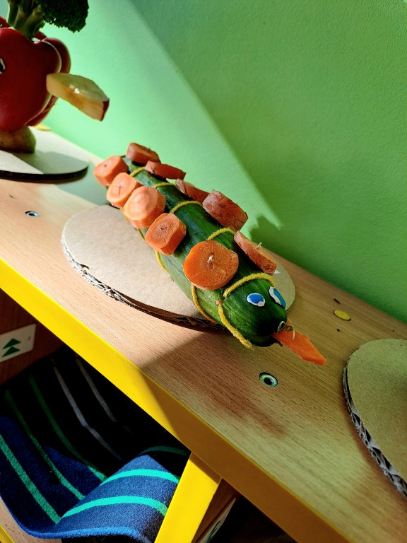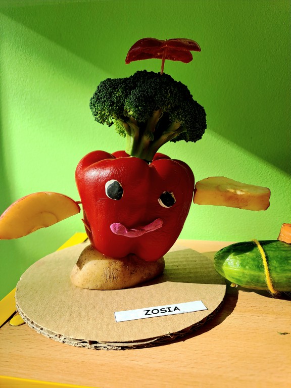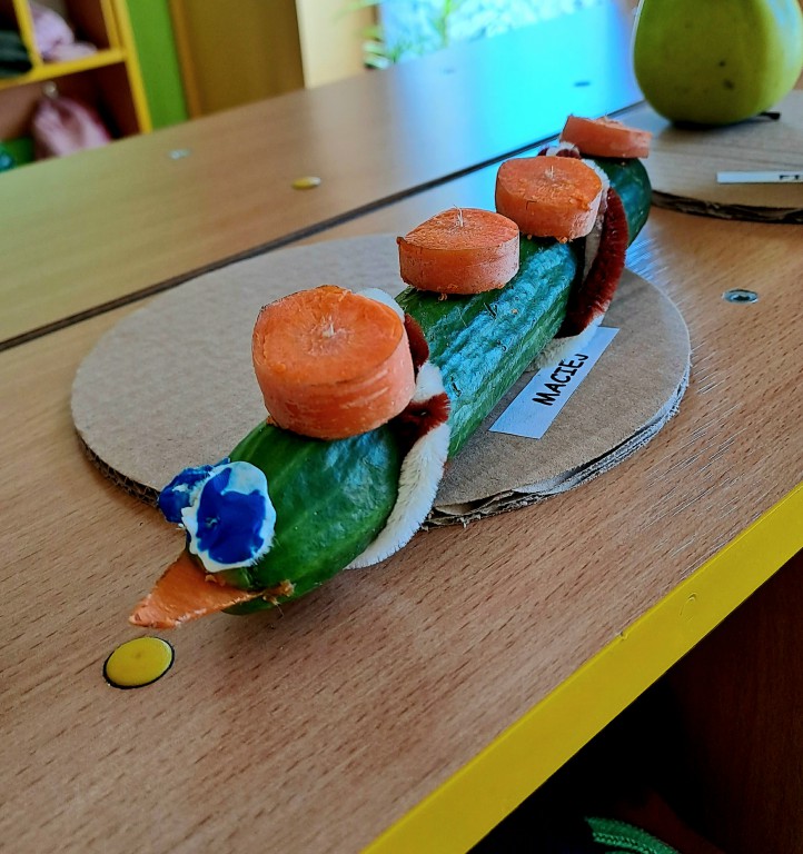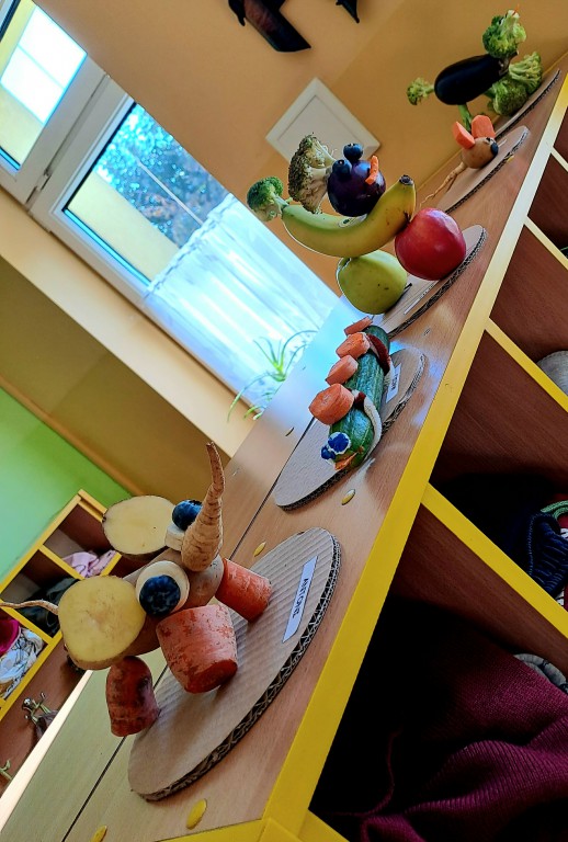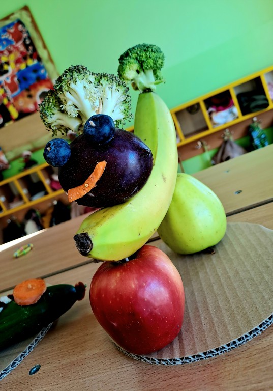 Realizując temat kompleksowy o owocach i warzywach przedszkolaki z grupy V własnoręcznie przygotowały pyszną, witaminową sałatkę. Przyniosły z domów różne świeże owoce. Były jabłka, gruszki, banany, mandarynki, kiwi, ananas a nawet granat. Wszyscy mieli soczyste minki na widok tak smakowitych owoców i każdy ochoczo zabrał się do pracy. Dokładnie umyliśmy rączki. Dzieci samodzielnie kroiły i przyrządzały sałatkę owocową przestrzegając zasad bezpieczeństwa.Własnoręcznie zrobiona sałatka wyśmienicie dzieciom smakowała.Dzieci wykonały również -Jesienne cudaki i zwierzaki z warzyw i owoców. Prace dzieci były bardzo pomysłowe i zabawne, trudno było od nich oderwać wzrok. Warzywa i owoce zmieniły się w wielobarwne postacie stworków, zwierzaków, cudaków i ludzików. Ich uśmiechnięte buzie, bystre oczka, bogate stroje i bujne fryzury zachwycały i urzekały pięknem oraz pomysłowością. Celem zajęć było zachęcenie dzieci do częstszego spożywania owoców i warzyw oraz rozwijanie ich kreatywności i inwencji.