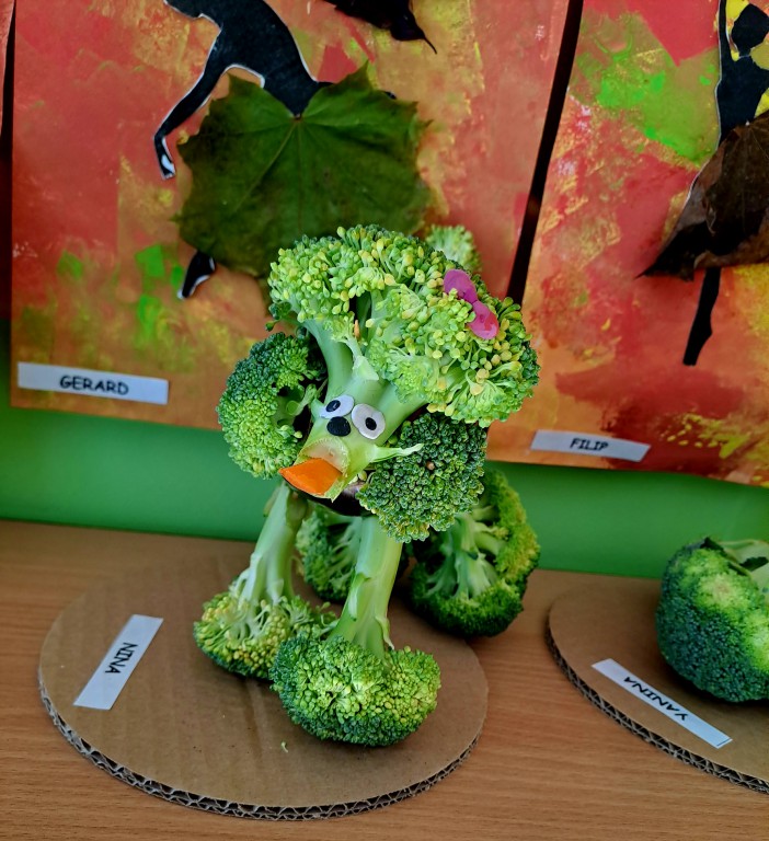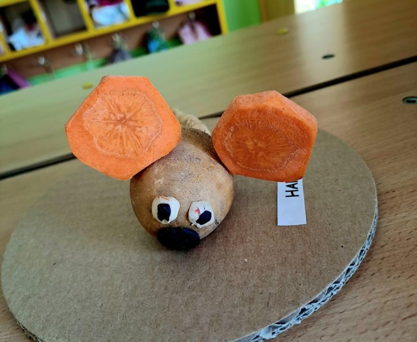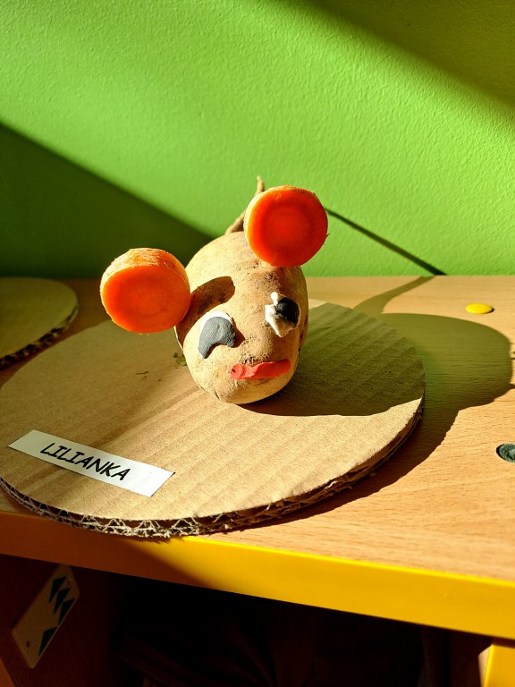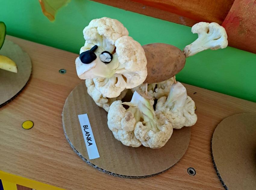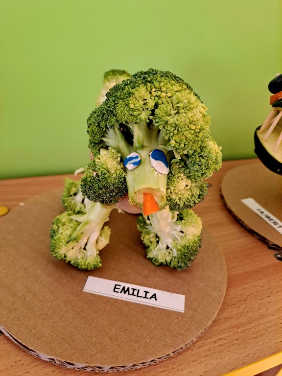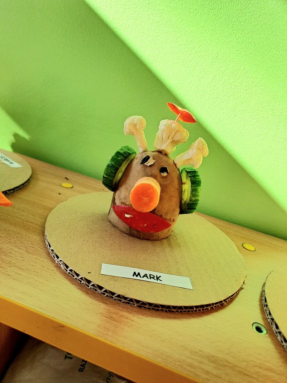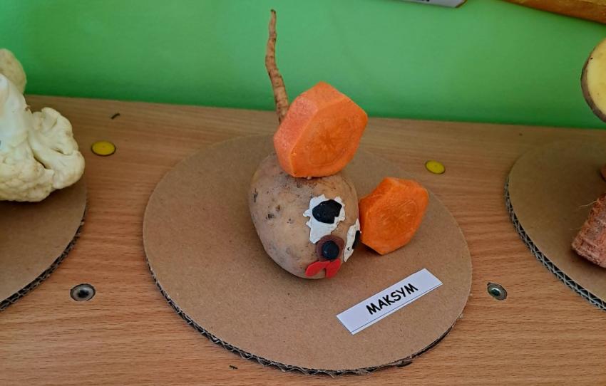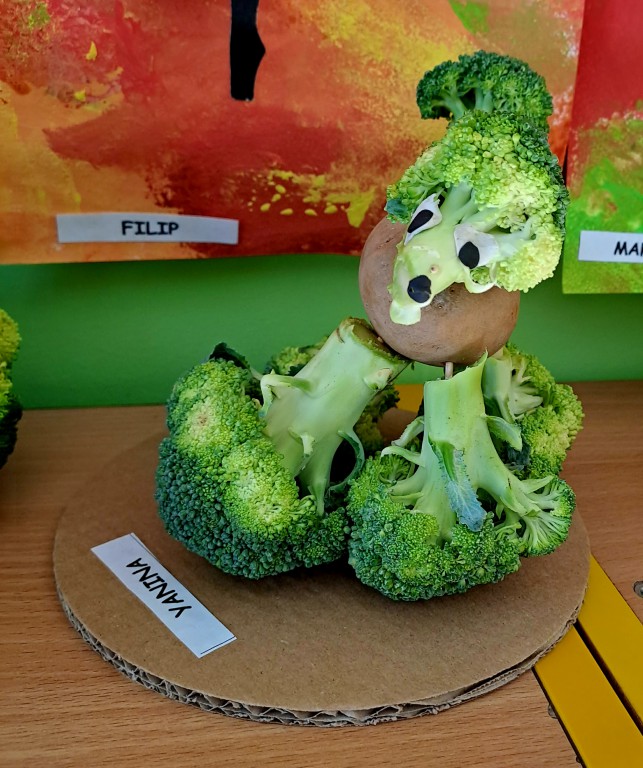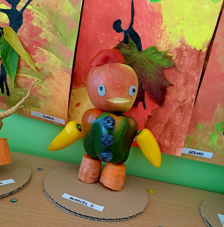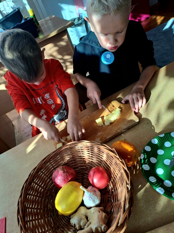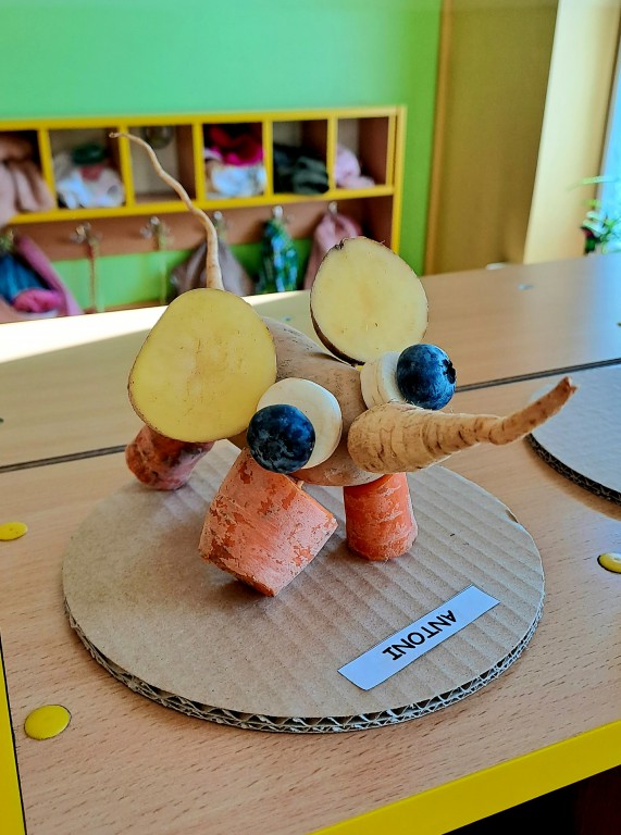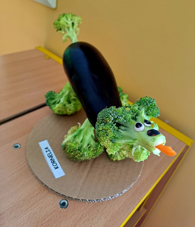 Realizując temat kompleksowy o owocach i warzywach przedszkolaki z grupy V własnoręcznie przygotowały pyszną, witaminową sałatkę. Przyniosły z domów różne świeże owoce. Były jabłka, gruszki, banany, mandarynki, kiwi, ananas a nawet granat. Wszyscy mieli soczyste minki na widok tak smakowitych owoców i każdy ochoczo zabrał się do pracy. Dokładnie umyliśmy rączki. Dzieci samodzielnie kroiły i przyrządzały sałatkę owocową przestrzegając zasad bezpieczeństwa.Własnoręcznie zrobiona sałatka wyśmienicie dzieciom smakowała.Dzieci wykonały również -Jesienne cudaki i zwierzaki z warzyw i owoców. Prace dzieci były bardzo pomysłowe i zabawne, trudno było od nich oderwać wzrok. Warzywa i owoce zmieniły się w wielobarwne postacie stworków, zwierzaków, cudaków i ludzików. Ich uśmiechnięte buzie, bystre oczka, bogate stroje i bujne fryzury zachwycały i urzekały pięknem oraz pomysłowością. Celem zajęć było zachęcenie dzieci do częstszego spożywania owoców i warzyw oraz rozwijanie ich kreatywności i inwencji.