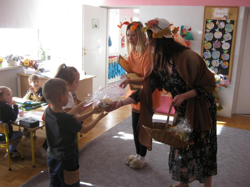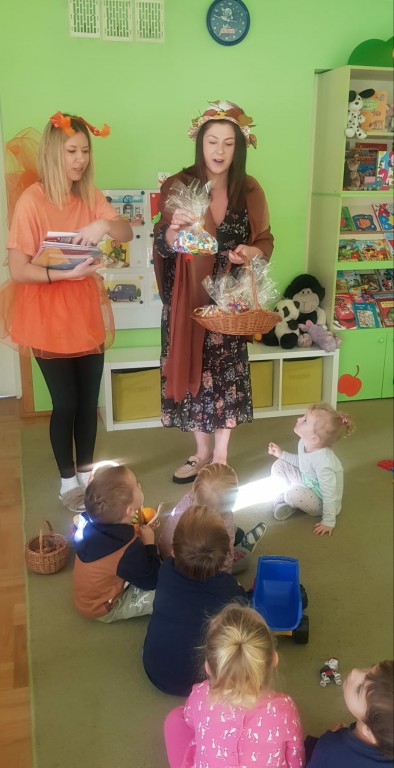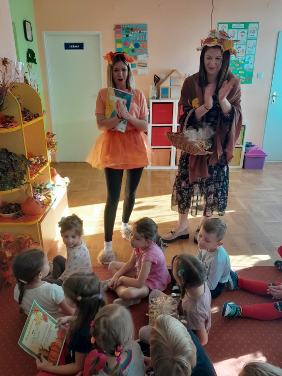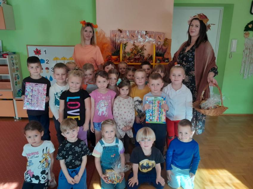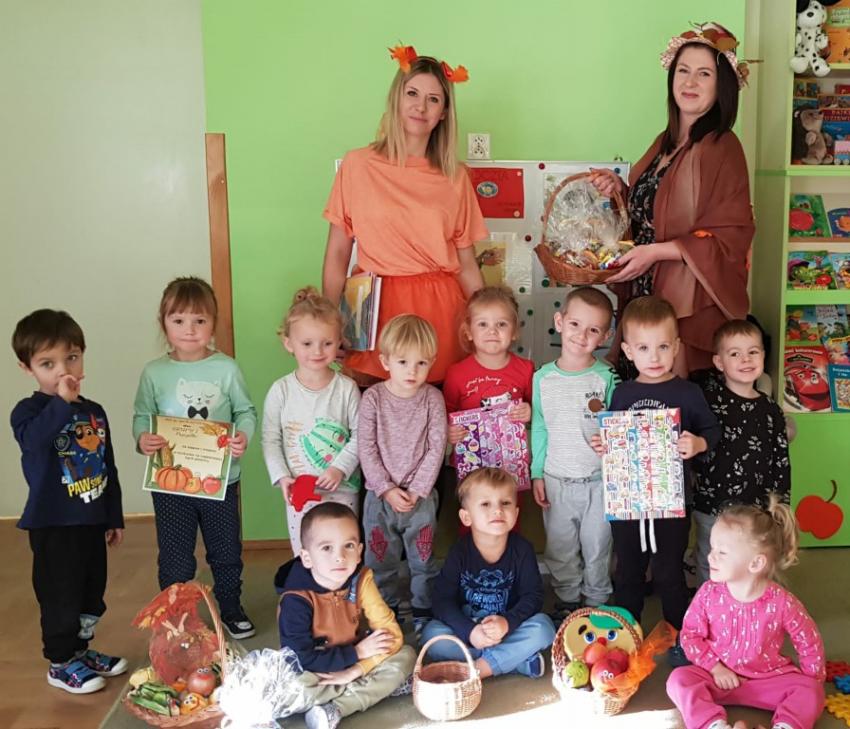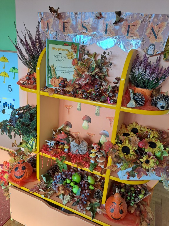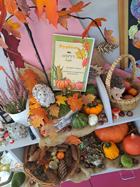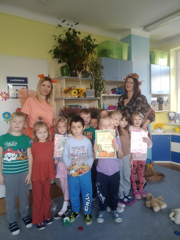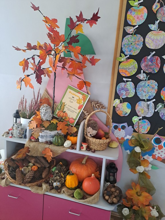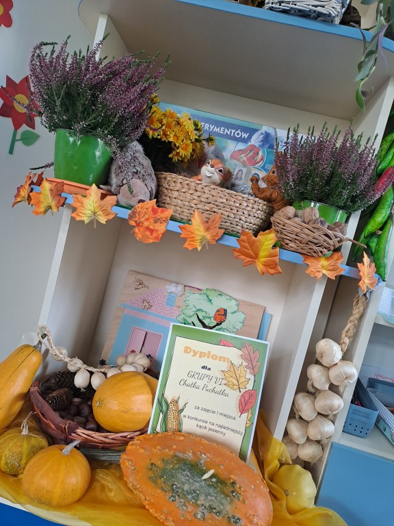 Kilka dni temu Pani Jesień kolejny raz odwiedziła nasze przedszkole. Tym razem po to, aby ogłosić wyniki konkursu na- Najpiękniejszy jesienny kącik przyrody. Przedszkolaki razem z wychowawczyniami przez cały październik przygotowywały swoje kąciki przyrody, wzbogacając je o coraz wspanialsze okazy jesiennych roślin oraz wykonanych z nich ozdób. Pani Jesień miała więc trudne zadanie, kiedy po dokładnym obejrzeniu każdej ekspozycji, musiała zdecydować, którym grupom przyznać nagrody. Wszystkie kąciki były ciekawe i każdy miał w sobie coś wyjątkowego, więc I miejsce oraz nagrody otrzymały wszystkie grupy. Zwycięzcom serdecznie gratulujemy!