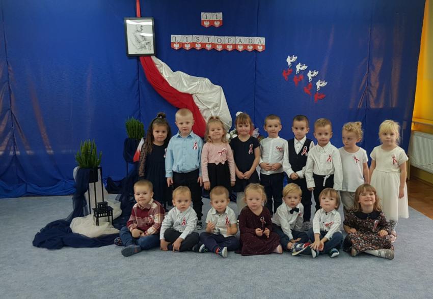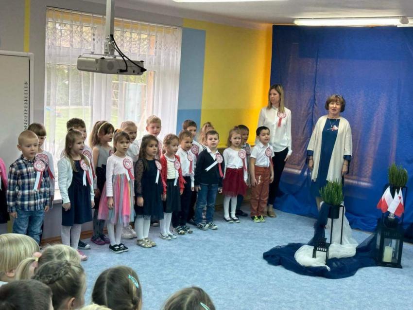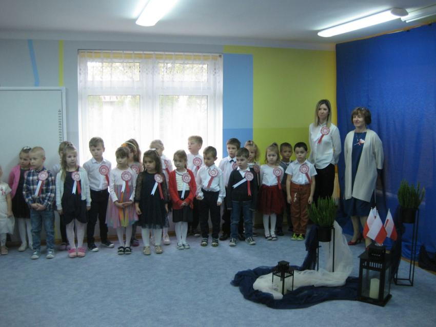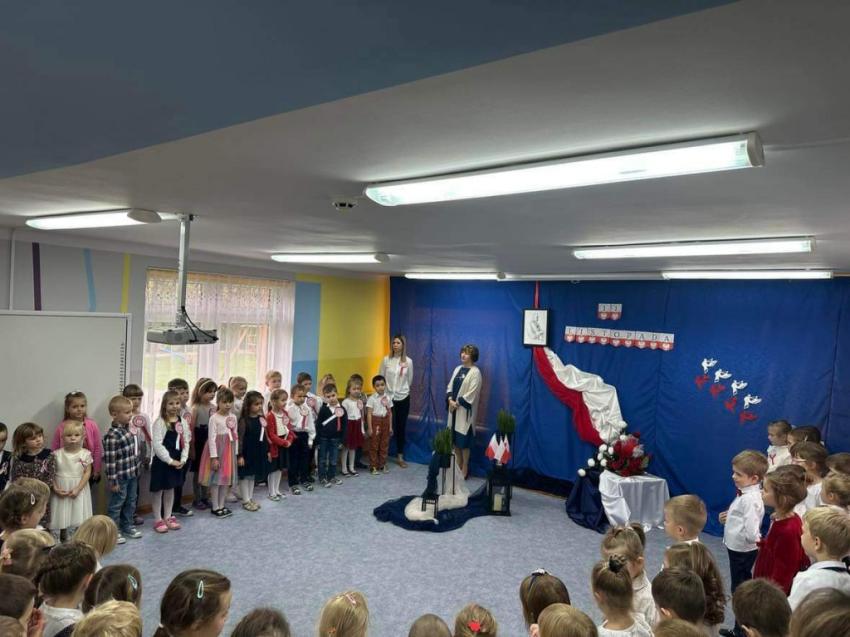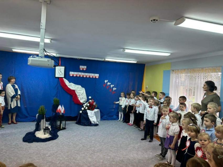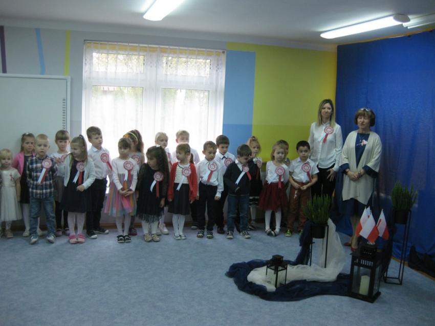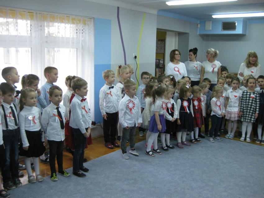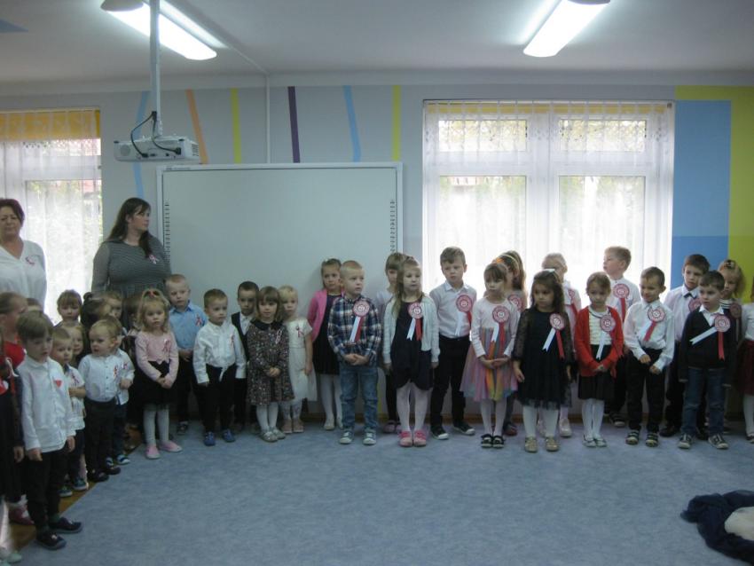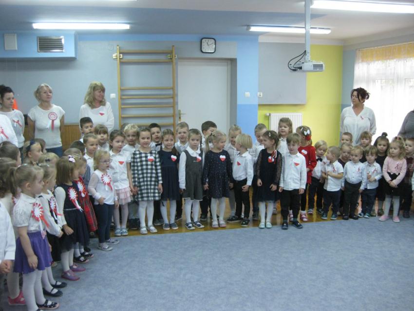 10 listopada bieżącego roku w naszym przedszkolu odbyła się uroczystość upamiętniająca rocznicę Odzyskania Niepodległości przez Polskę. Z tej okazji dzieci z wszystkich grup oraz pracownicy przedszkola zebrali się, aby uroczyście świętować ten wyjątkowy dla Polaków czas.Pielęgnując polską kulturę i tradycję dzieci z grup starszych śpiewały pieśni patriotyczne, a na zakończenie wszyscy wspólnie z należytym szacunkiem zaśpiewaliśmy Mazurek Dąbrowskiego - nasz hymn narodowy.