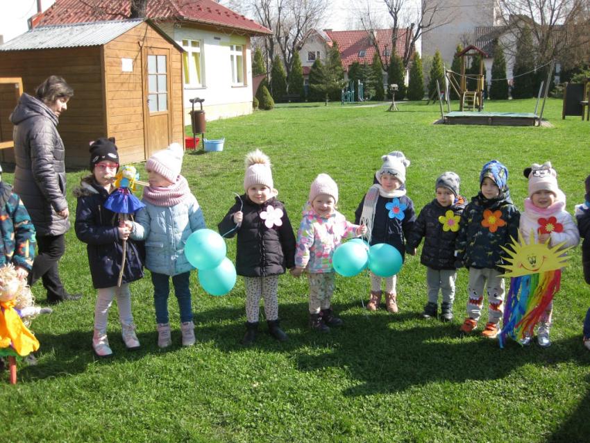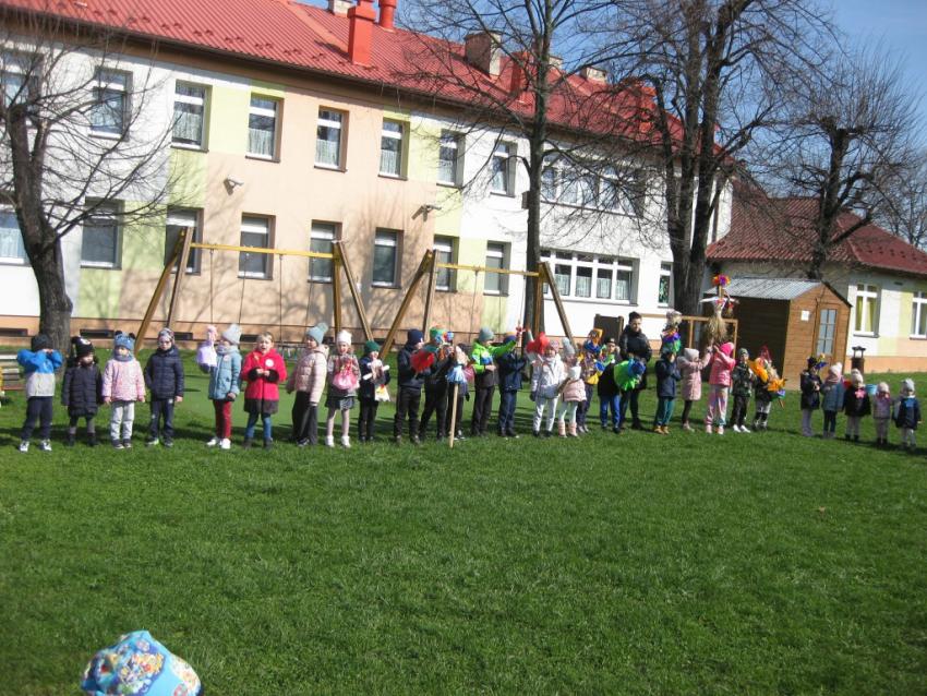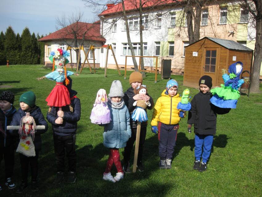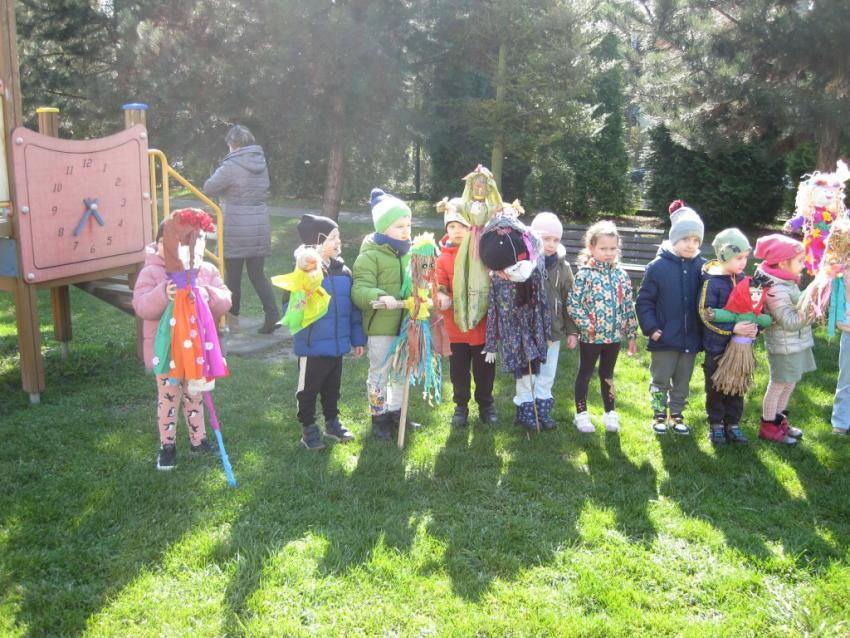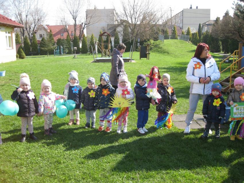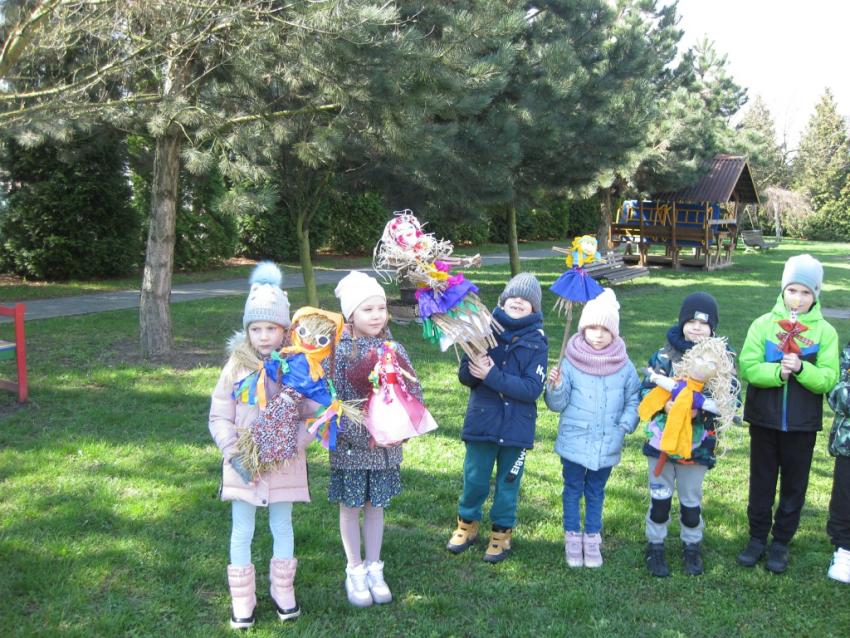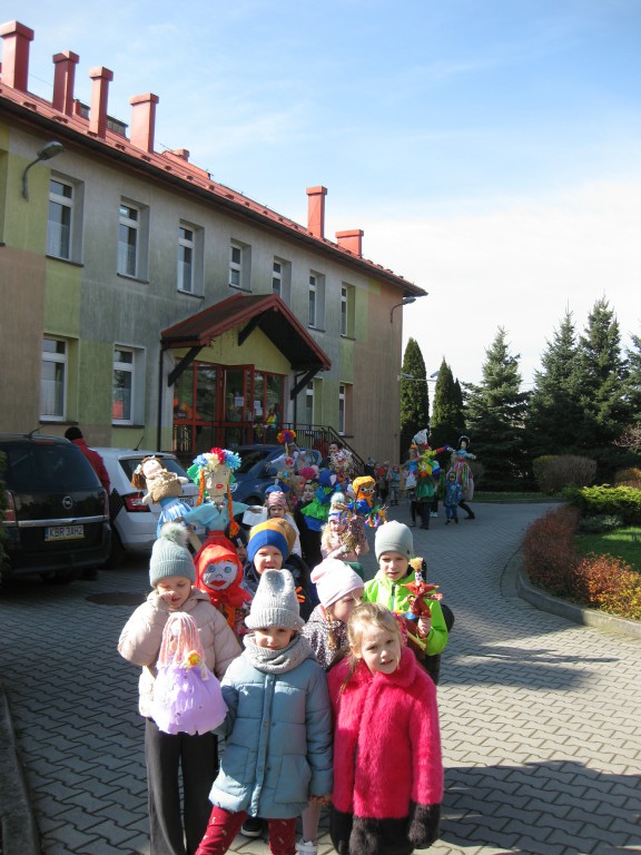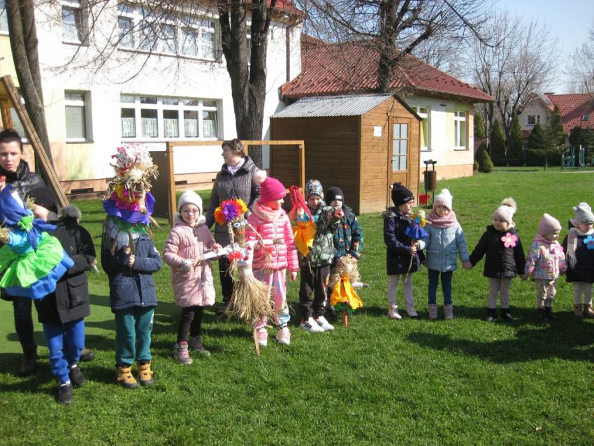 Pierwszy dzień wiosny w przedszkolu był szczególnie radosny i kolorowy. Żegnanie zimy i powitanie wiosny związane jest bowiem z miłymi przeżyciami wszystkich przedszkolaków.Nie zapominając o starym zwyczaju,przedszkolaki przygotowały swoje kukły symbolizujące porę roku zimę.Radosnym korowodem ,piosenką i okrzykami pożegnaliśmy zimę i przywitaliśmy wiosnę.