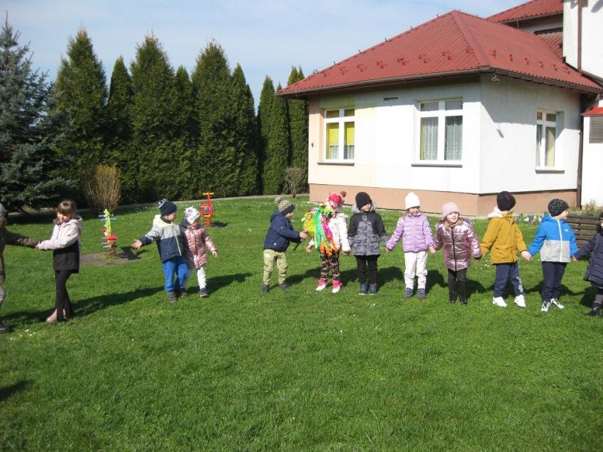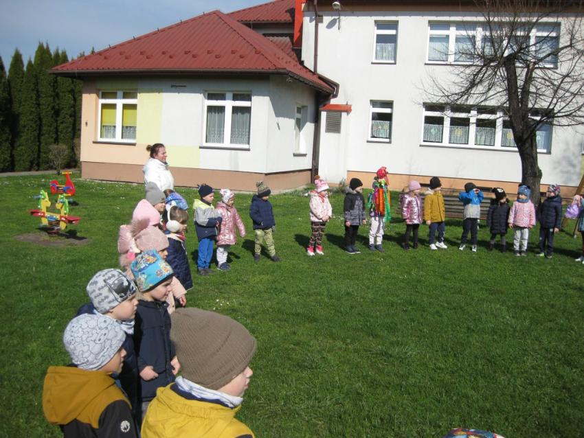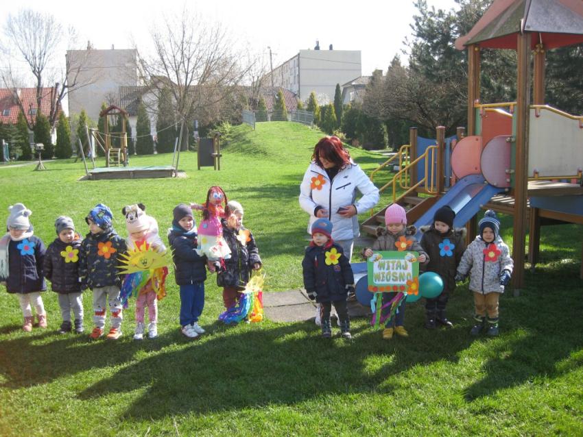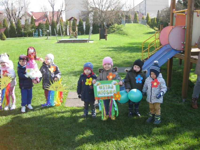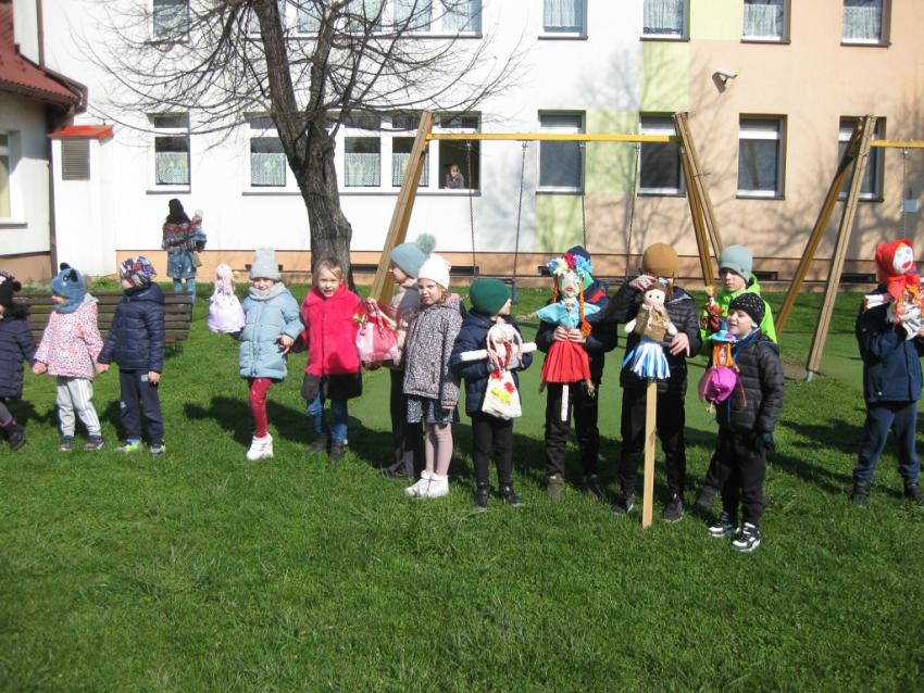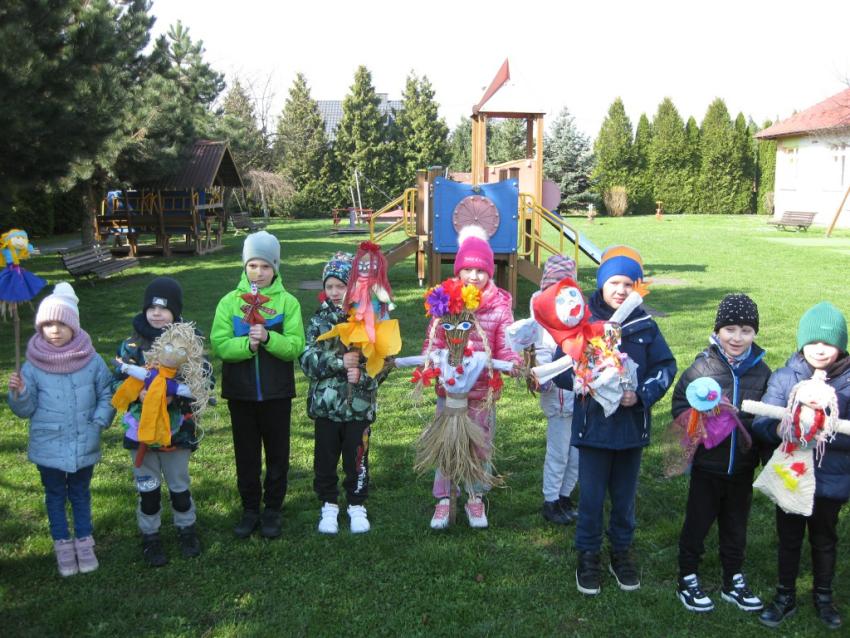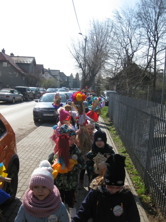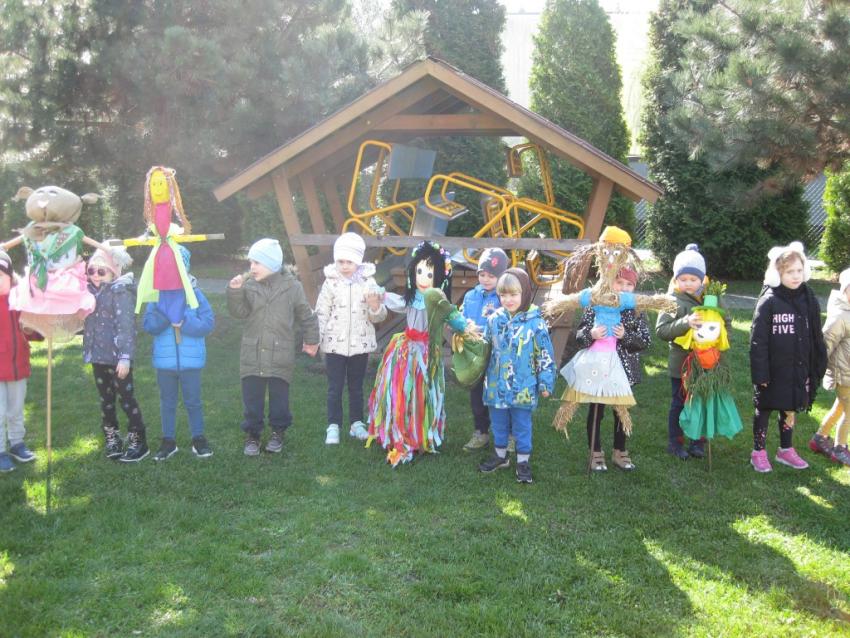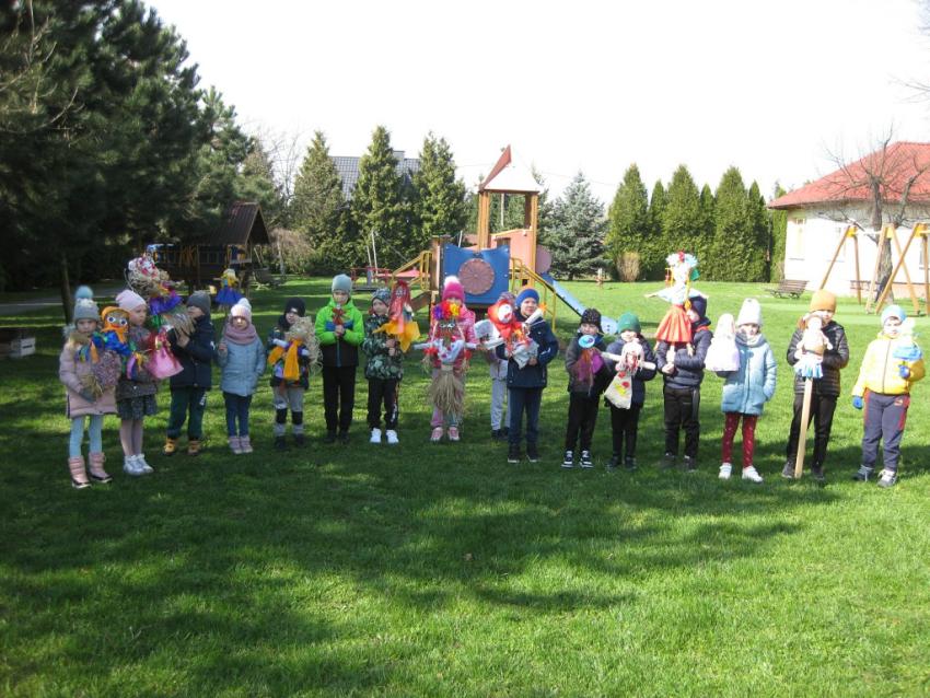 Pierwszy dzień wiosny w przedszkolu był szczególnie radosny i kolorowy. Żegnanie zimy i powitanie wiosny związane jest bowiem z miłymi przeżyciami wszystkich przedszkolaków.Nie zapominając o starym zwyczaju,przedszkolaki przygotowały swoje kukły symbolizujące porę roku zimę.Radosnym korowodem ,piosenką i okrzykami pożegnaliśmy zimę i przywitaliśmy wiosnę.