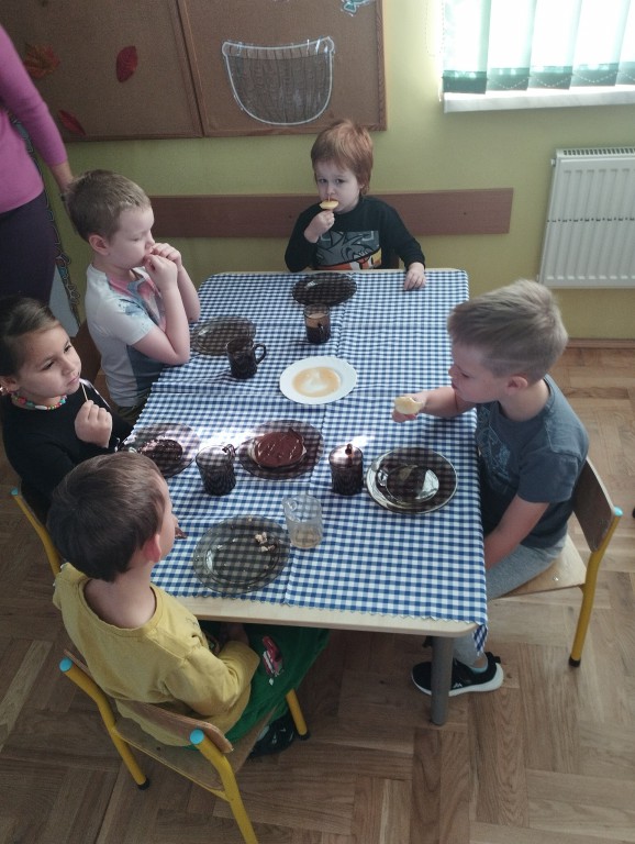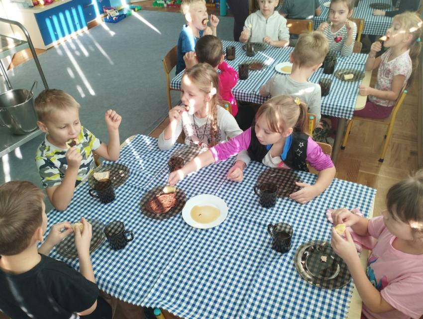 Realizując temat kompleksowy -Co w sadzie dojrzewa?- grupa V rozmawiała o zdrowym odżywianiu oraz kosztowała smacznych i zdrowych przekąsek, którymi były jabłka w czekoladzie i miodzie.