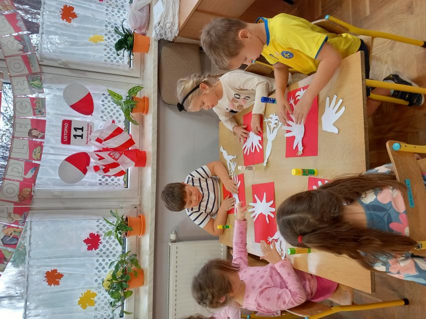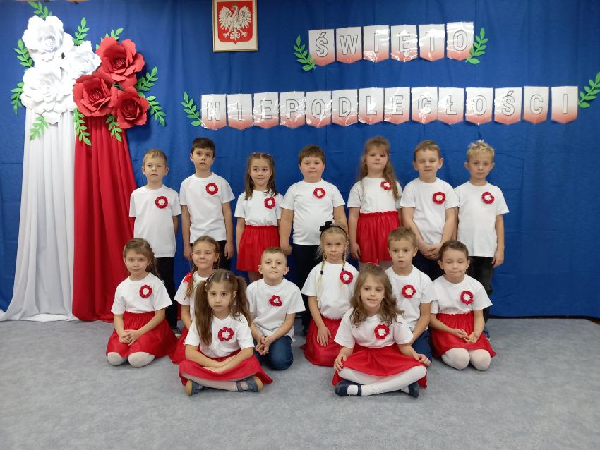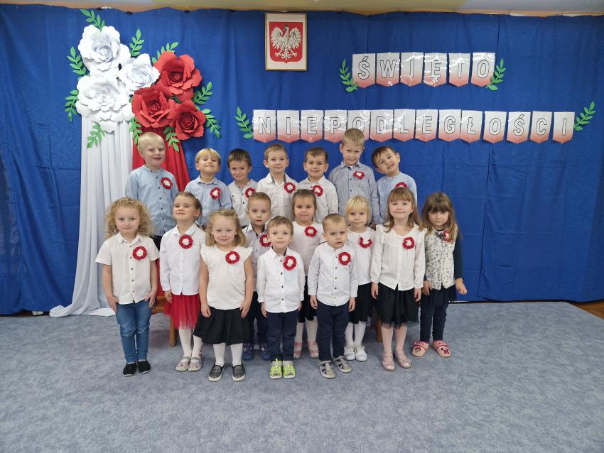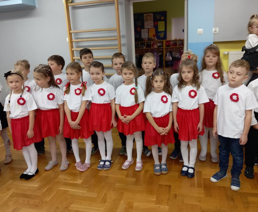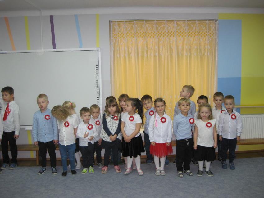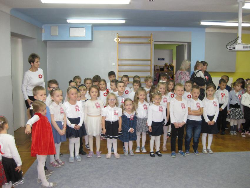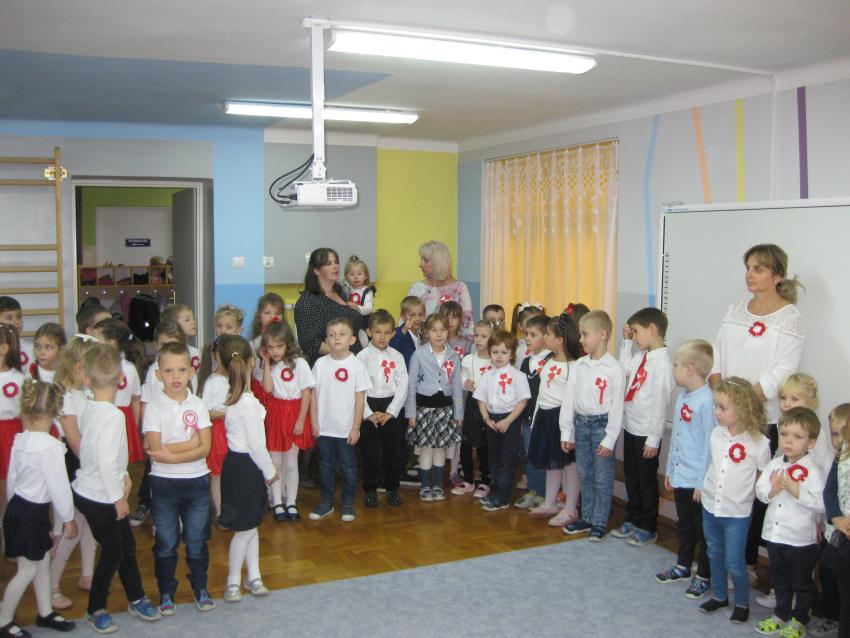 Dnia 8 listopada obchodziliśmy w naszym przedszkolu Święto Niepodległości.Przedszkolaki utrwaliły wiadomości na temat polskich symboli narodowych.Na uroczystej akademii ,przyjmując właściwą postawę -na baczność, odśpiewały hymn Polski -Mazurek Dąbrowskiego.Dzieci z grup starszych śpiewały piosenki patriotyczne.Dzięki udziałowi w tego typu uroczystościach  przedszkolaki od najmłodszych lat uczą się patriotyzmu i przywiązania do kraju ojczystego, jego kultury i tradycji oraz kształtują pozytywne postawy i uczucia patriotyczne.