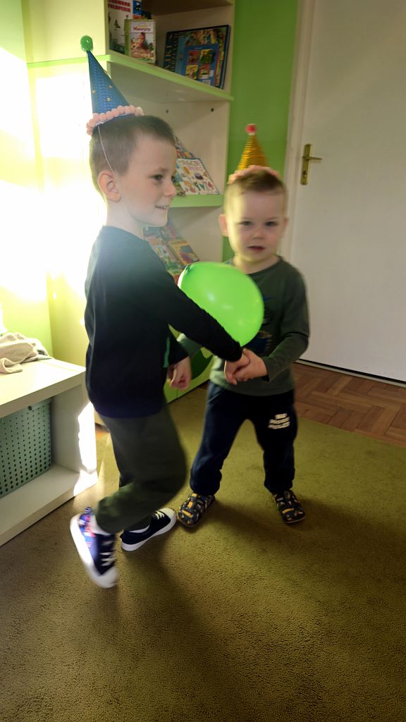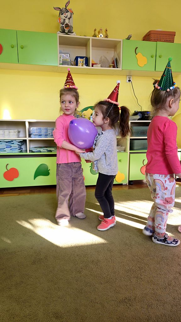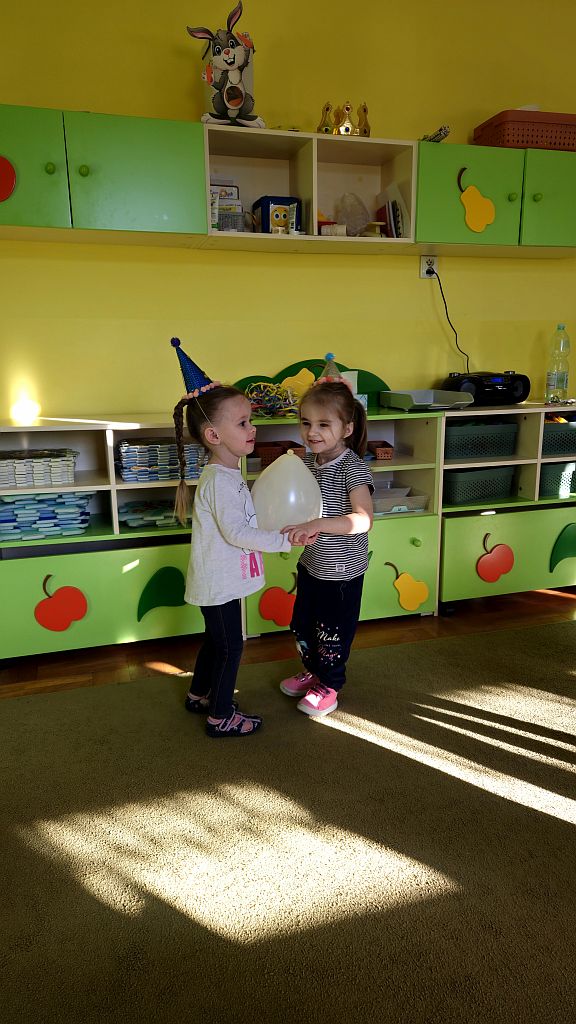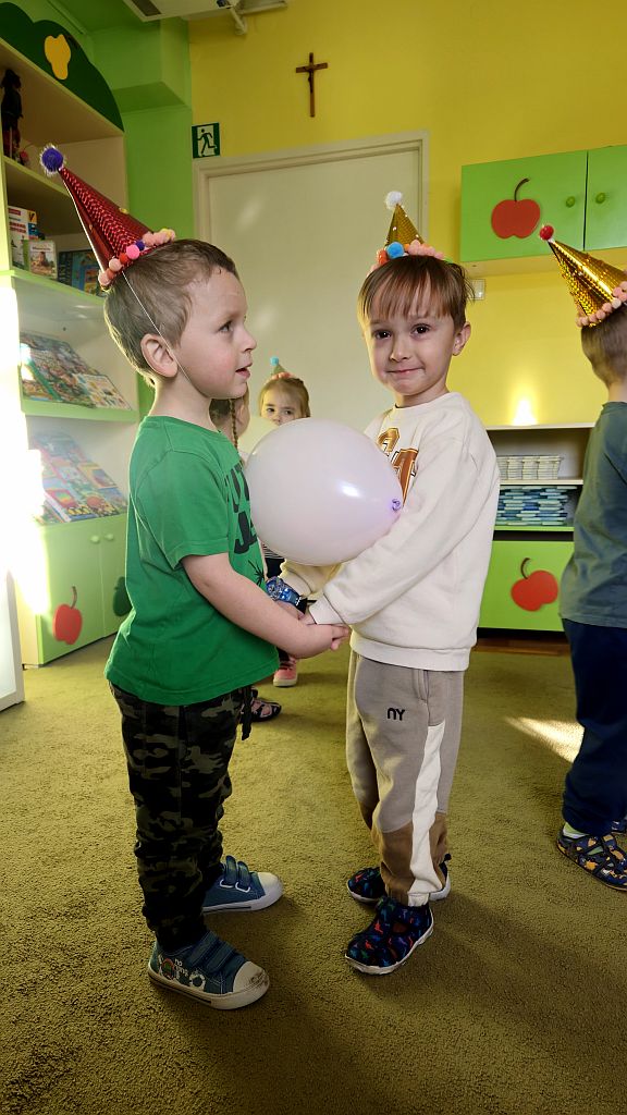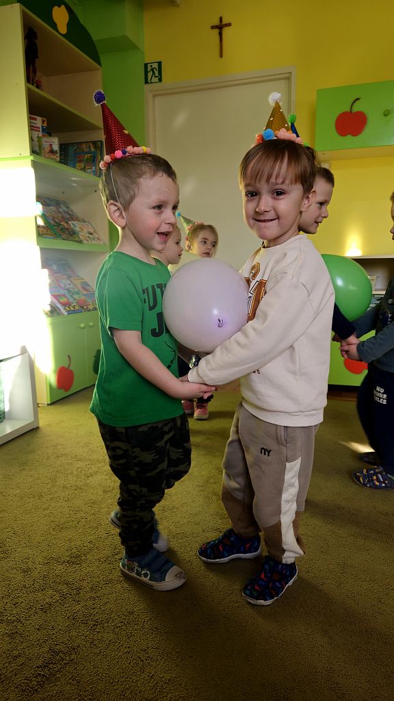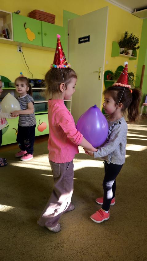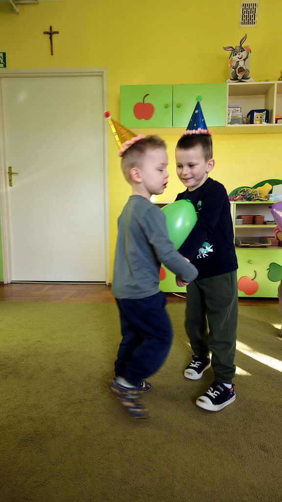 Karnawał to czas zabaw i tańców. W Grupie Jeżyków do tańców dzieci we własnoręcznie ozdobionych czapeczkach ,dołączyły się baloniki.