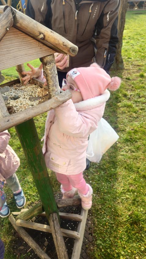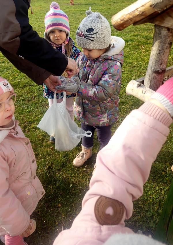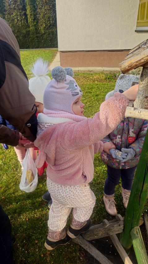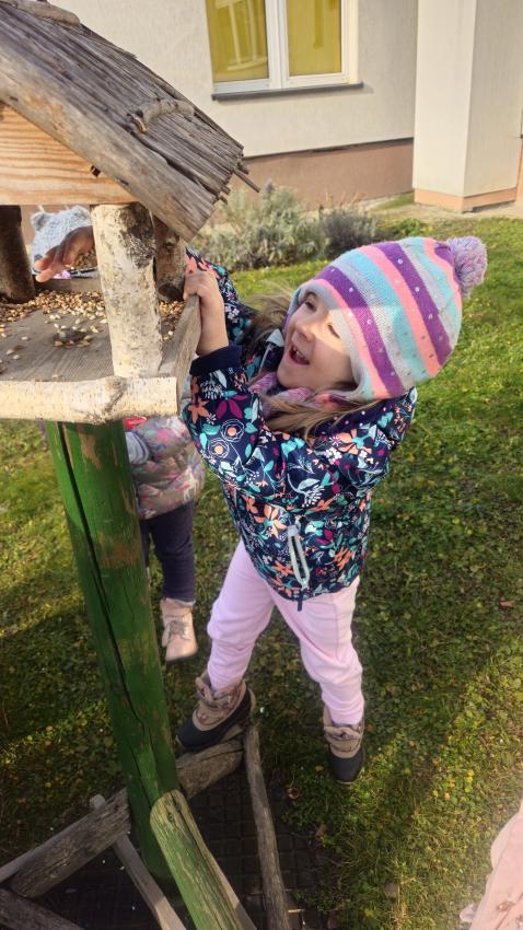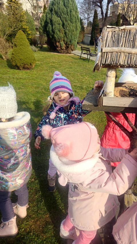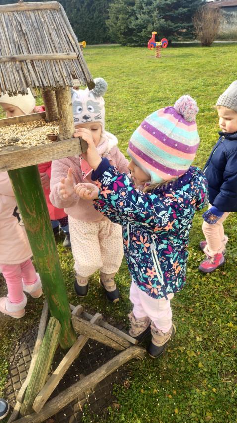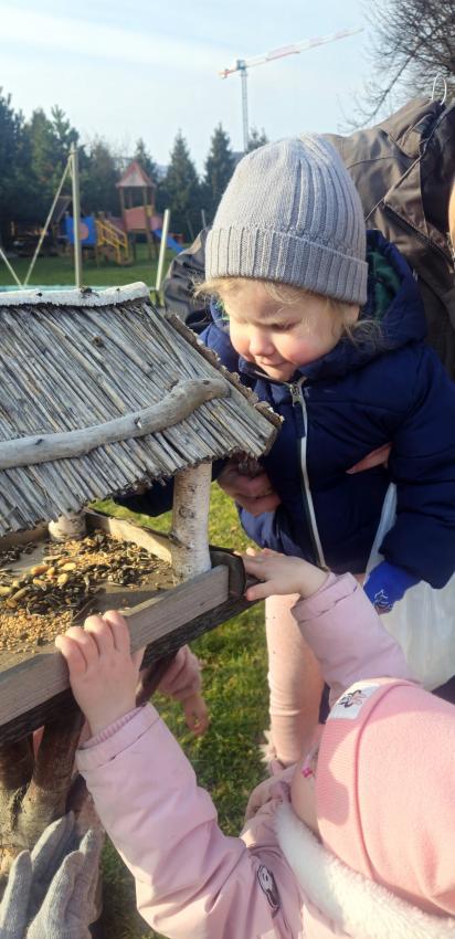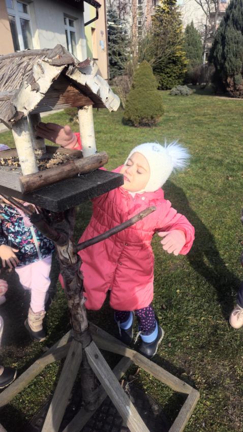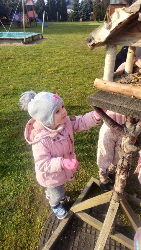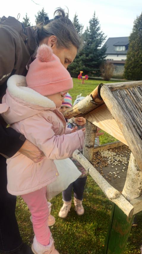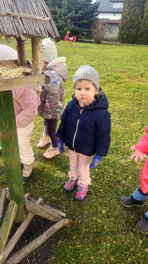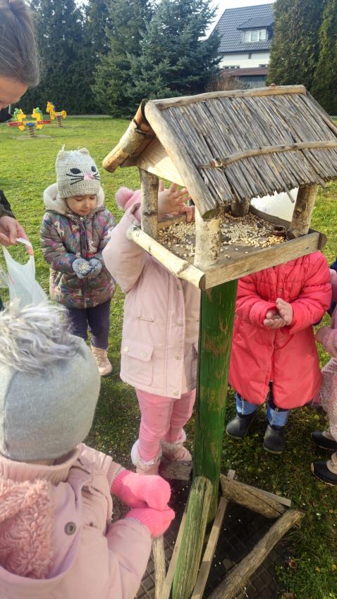 Zima,zima,zima,śniegu nie ma ,ale idzie wielki mróz!Dzieci z grupy JEŻYKÓW pamiętając o ptaszkach,które zostają w naszym kraju na zimę, wsypały do karmnika kilka garści ulubionych ziaren małych przyjaciół.
