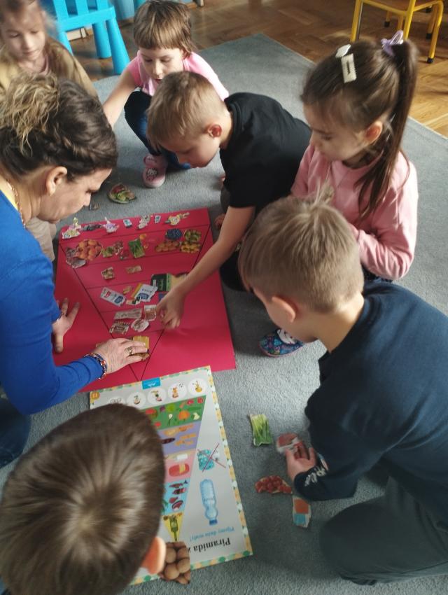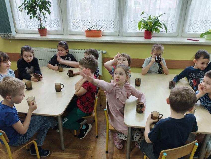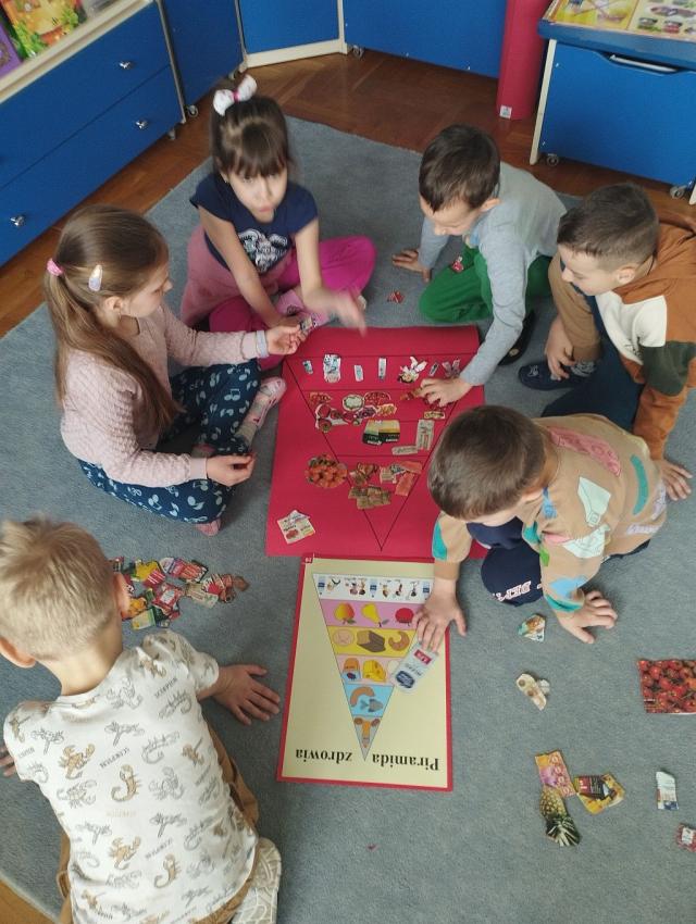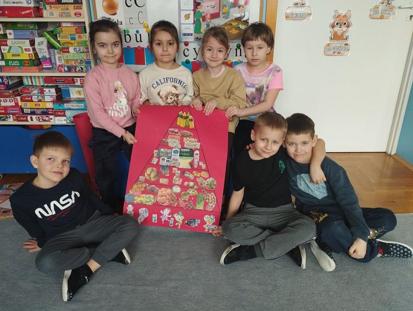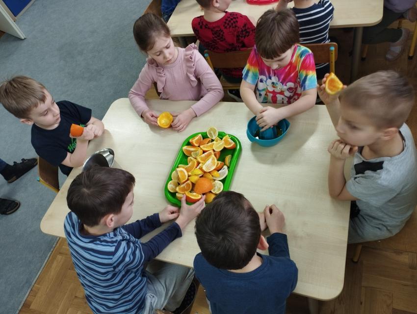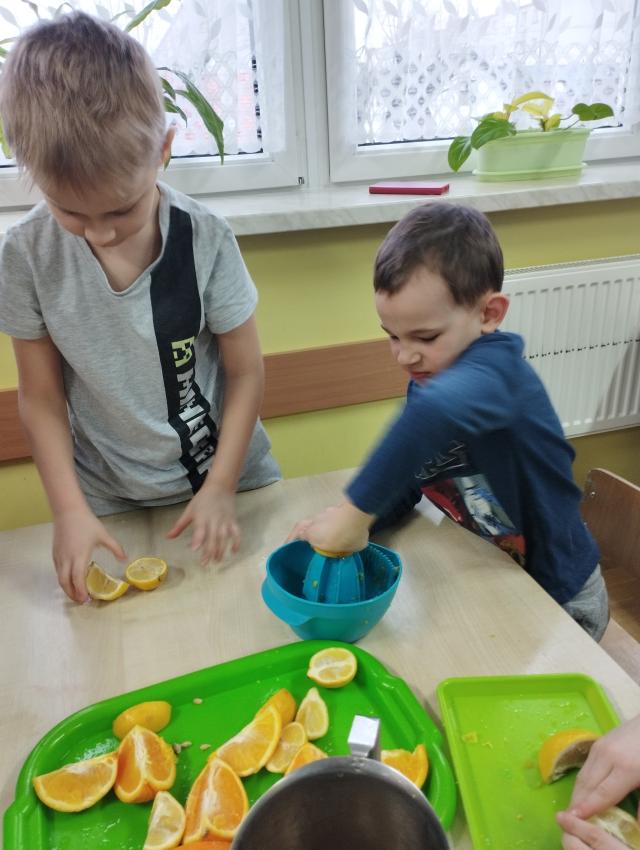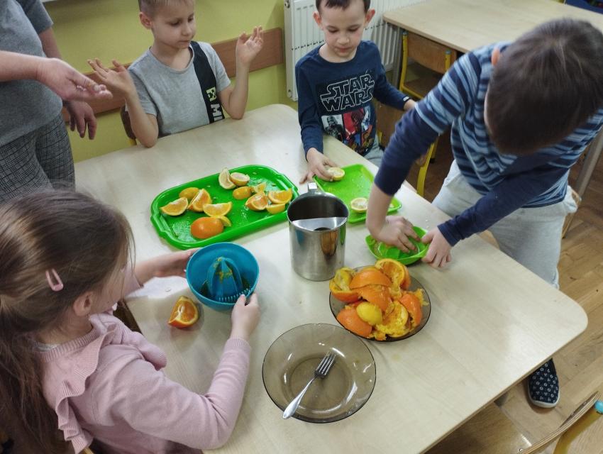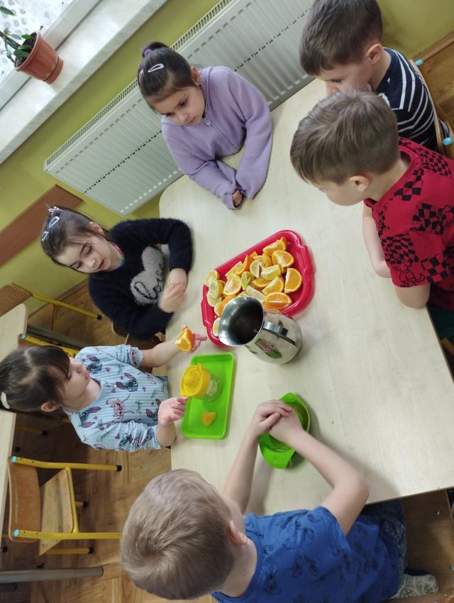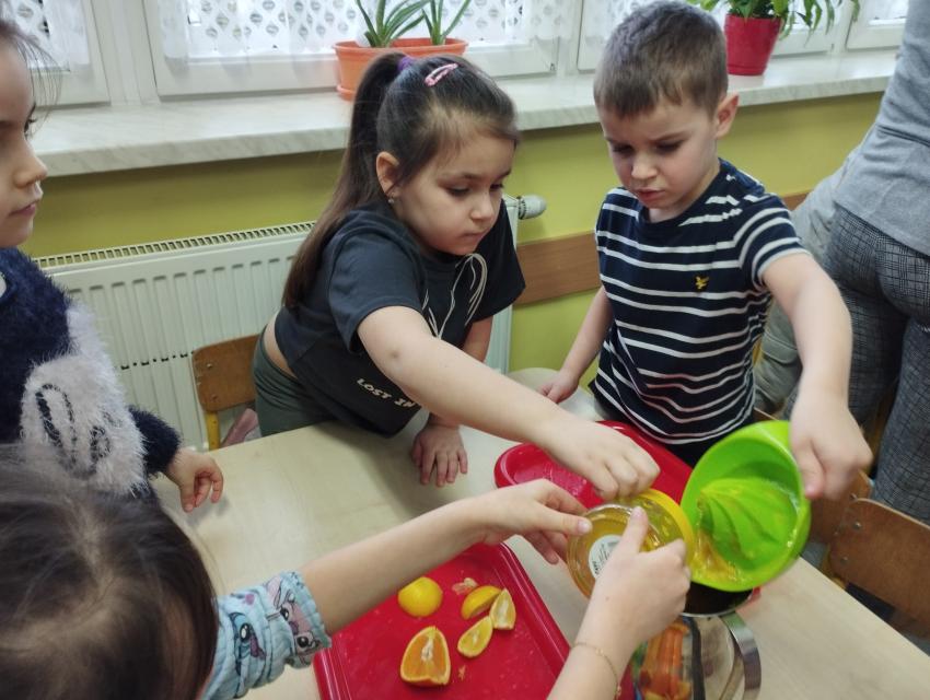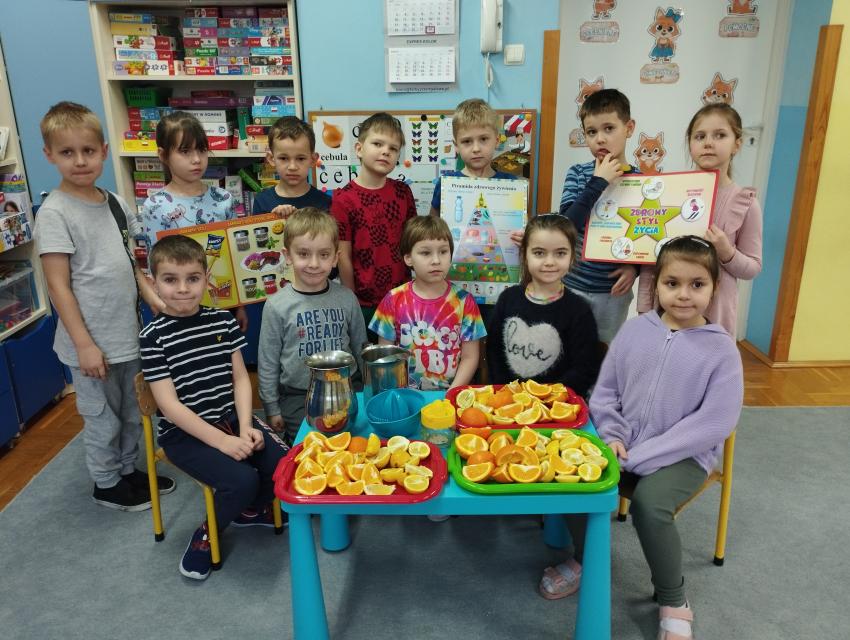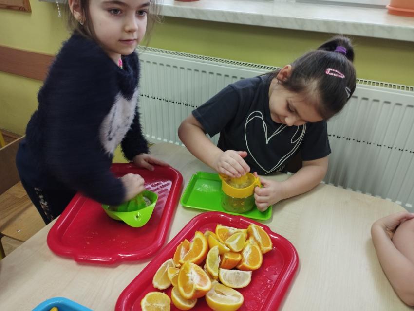 Realizując temat "Dbam o zdrowie", grupa V przypomniała sobie zasady zdrowego odżywiania.Dzieci aktywnie wykonywały piramidę żywienia oraz przygotowywały pyszny i zdrowy sok cytrynowo-pomarańczowy.