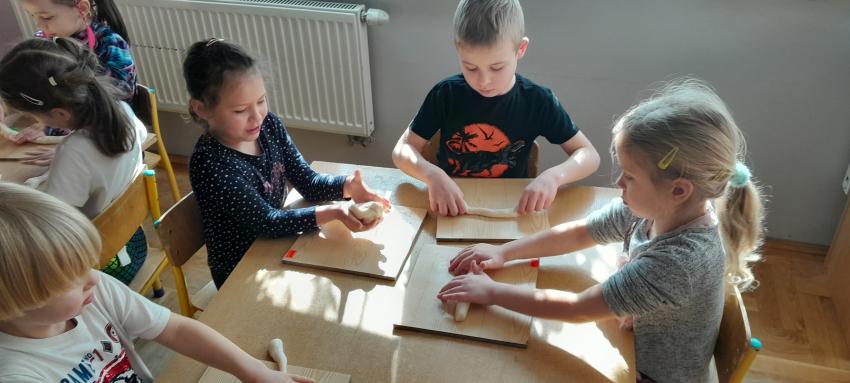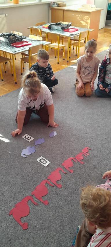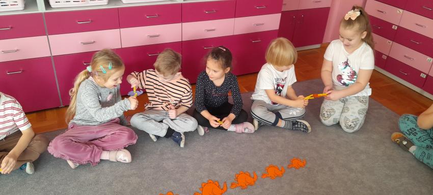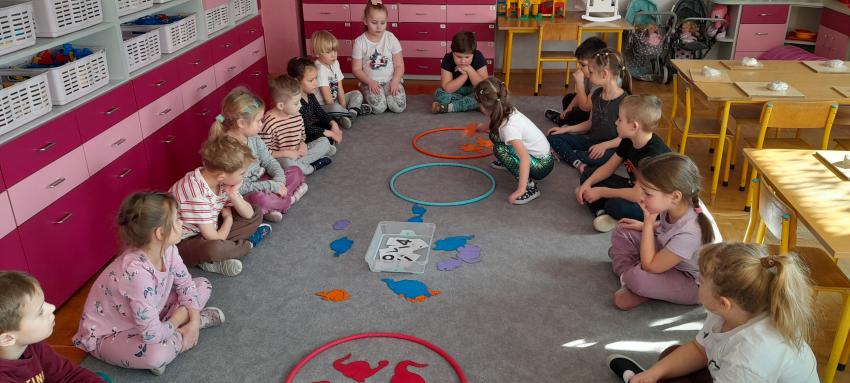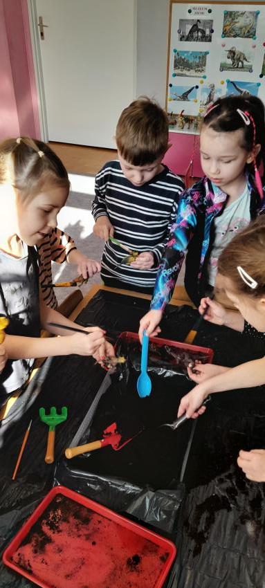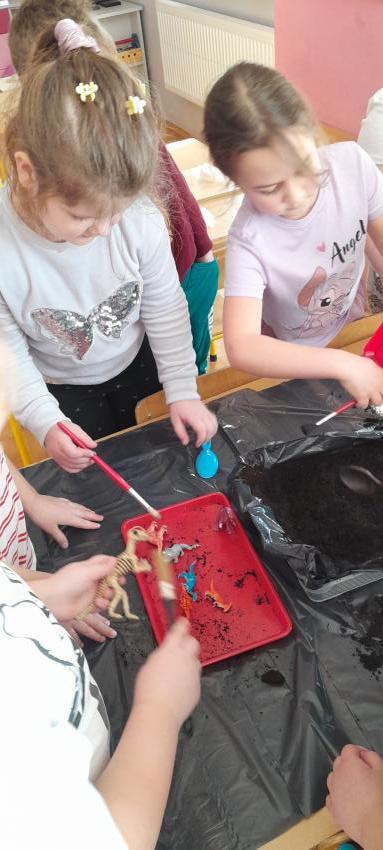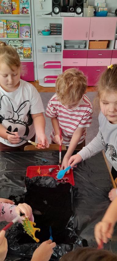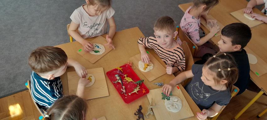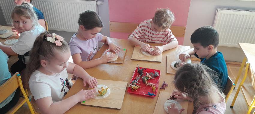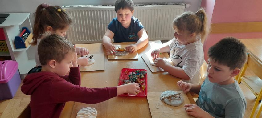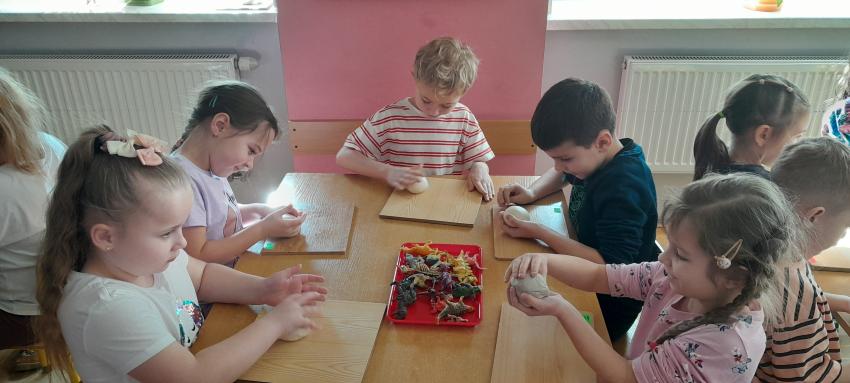 Dzień Dinozaura w grupie "Skrzaty" był pełen ekscytujących i edukacyjnych zabaw. Dzieci brały udział w segregacji dinozaurów, ucząc się o różnych gatunkach i ich cechach. Starszaki miały także okazję ćwiczyć liczenie, porównując liczbę dinozaurów w różnych grupach. Kolejną atrakcją było szukanie "kości dinozaurów" zakopanych w ziemi, co sprawiło dzieciom ogromną radość i pozwoliło na rozwijanie umiejętności poszukiwania. Na koniec, przedszkolaki odbijały skamieliny w masie solnej, tworząc własne "dinozaury". Dzień pełen kreatywnych aktywności pozwolił przedszkolakom na naukę przez zabawę, rozwijając ich wyobraźnię oraz zainteresowanie prehistorią.