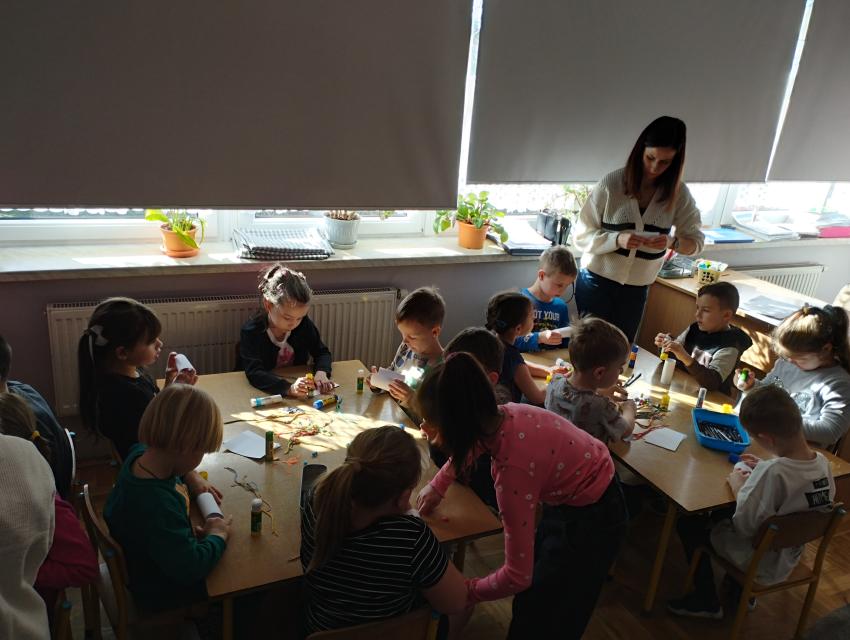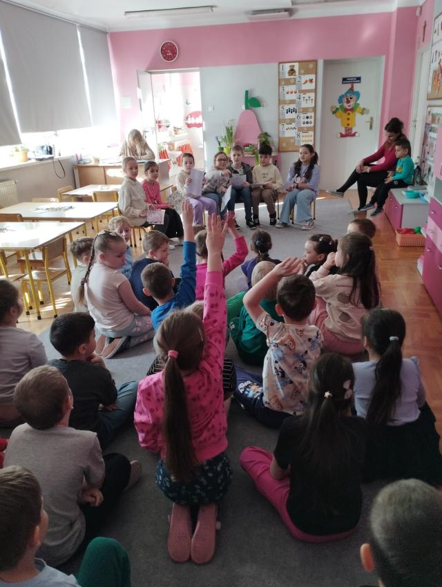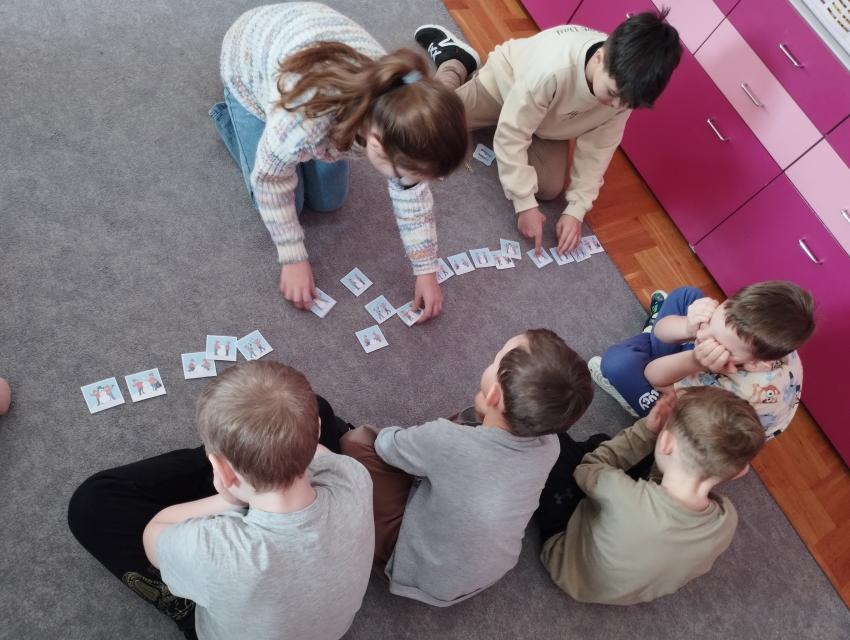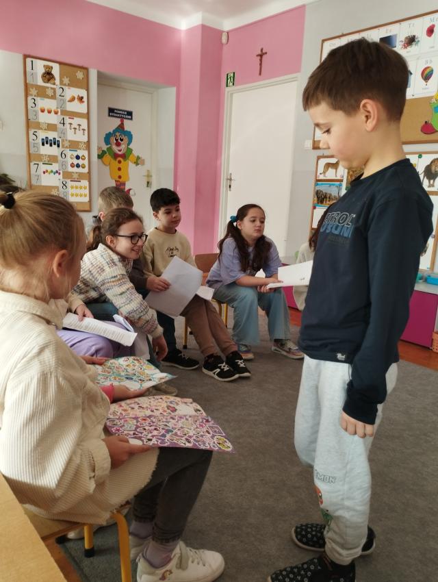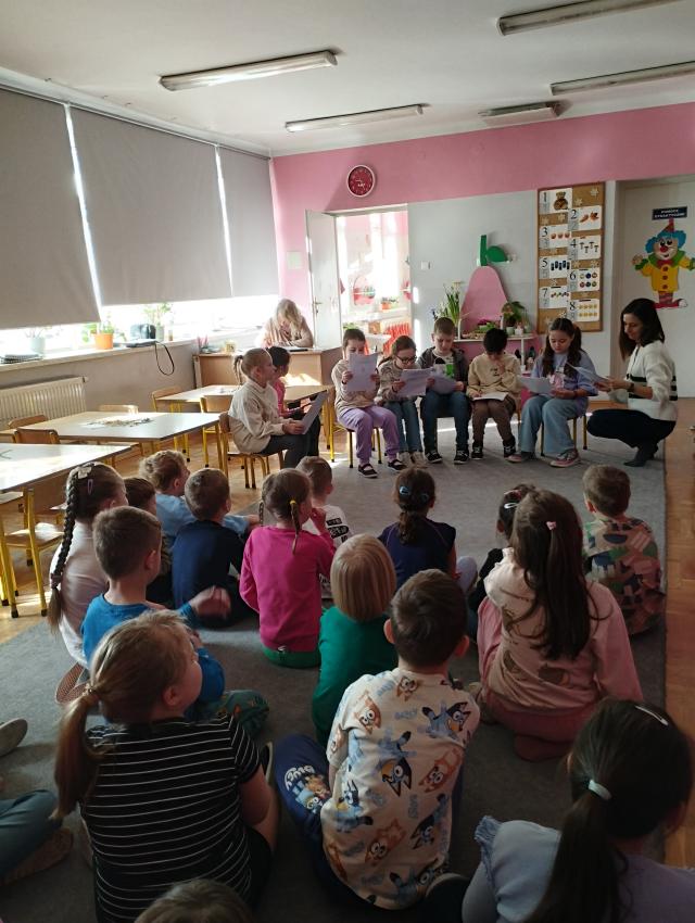 Piąty marca był dla gr. IV i V dniem pełnym emocji. Uczniowie drugiej klasy sąsiedniej szkoły podstawowej z wychowawczynią Panią Magdaleną przeprowadzili zajęcia czytelnicze dla najstarszych przedszkolaków. Mimo wiosennej aury – wciąż trwa zima, stąd pierwszym zadaniem okazały się zimowe zagadki. Następnie uczniowie klasy drugiej przeczytali opowiadanie o zimowych przygodach Misia Kuleczki. Dzięki niezwykłym umiejętnościom drugoklasistów przedszkolaki były bardzo zaciekawieni czytanym opowiadaniem,a także niezwykle aktywni. Dzieci wykonały bałwanka z rolki papieru, nie zapominając o ciepłym ubiorze: kapeluszu i wełnianym szaliku. Bałwanek ulepiony przez tytułowego Misia Kuleczkę na długo zagości w serduszkach i wspomnieniach przedszkolaczków.