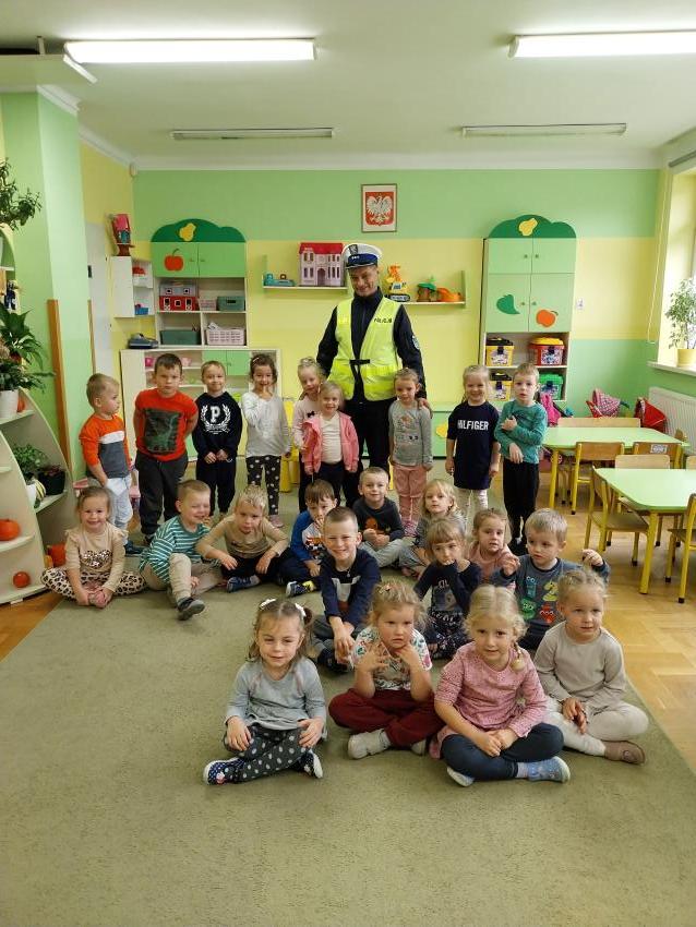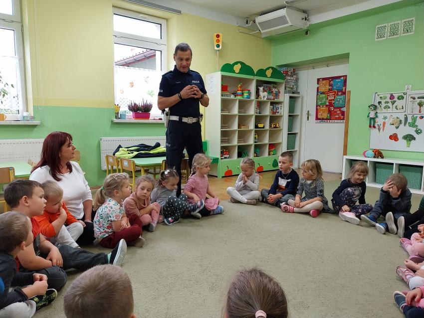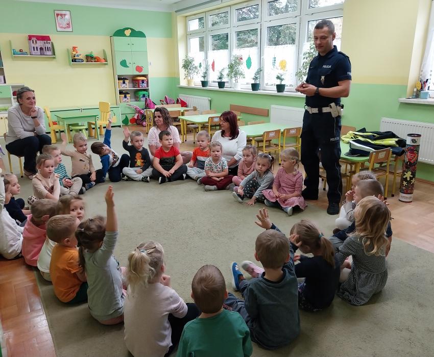 14 października w naszym przedszkolu gościliśmy pana policjanta.Podczas spotkania pan policjant przypomniał o podstawowych zasadach podczas przechodzenia przez ulicę i prawidłowym zachowaniu się w foteliku podczas jazdy samochodem. Następnie wytłumaczył jak należy zachować się w kontaktach z obcymi ludźmi, jak dbać o bezpieczeństwo własne i innych oraz do kogo zwracać się o pomoc w sytuacji zagrożenia. Dzieci z dużym zainteresowaniem słuchały rad i wskazówek zaproszonego gościa.