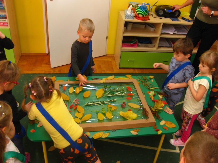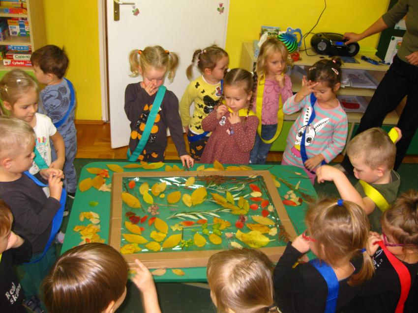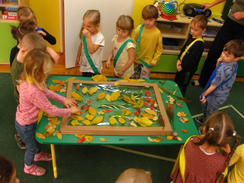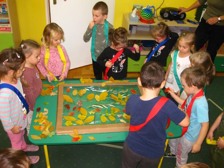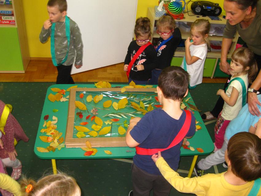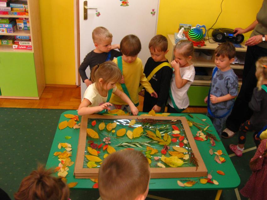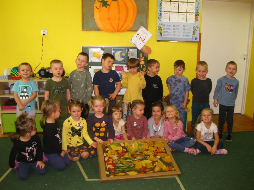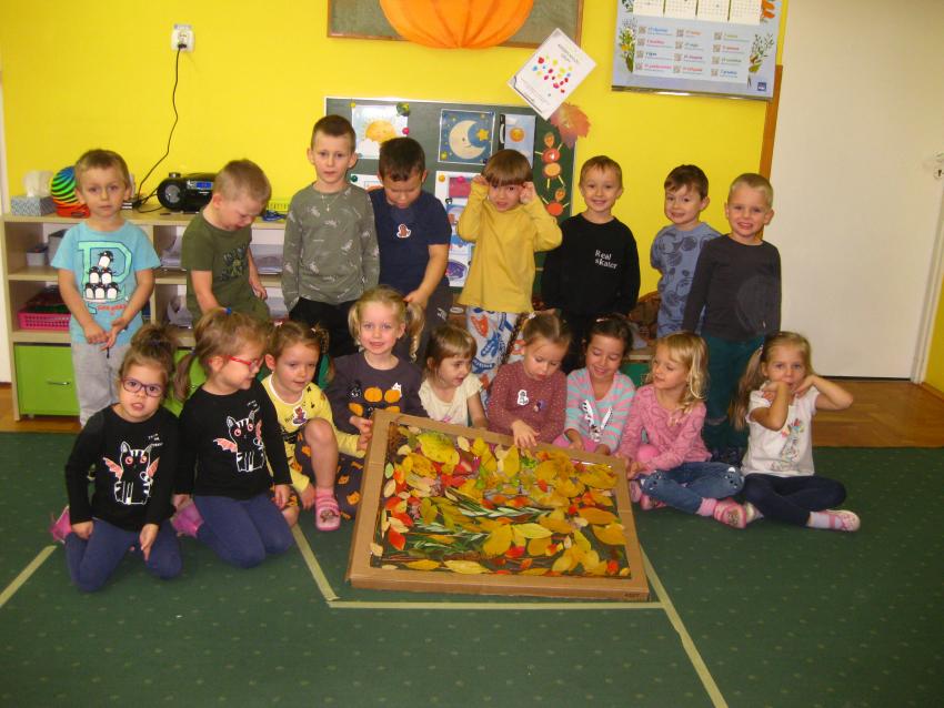 Z kolorowych skarbów przyrody, przy dźwiękach wesołej muzyki, "Jeżyki" tworzyły wspólnie "Jesienny obraz".Prawdziwe dzieło sztuki!