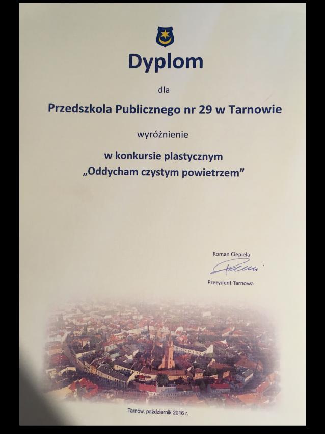 12 października 2016 roku odbyło się uroczyste podsumowanie konkursu plastycznego pt. „Oddycham czystym powietrzem” organizowanego przez Urząd Miasta Tarnowa. Nasze przedszkolaki z grupy V otrzymały wyróżnienie i atrakcyjne nagrody. Gratulujemy jeszcze raz i życzymy dalszych sukcesów!