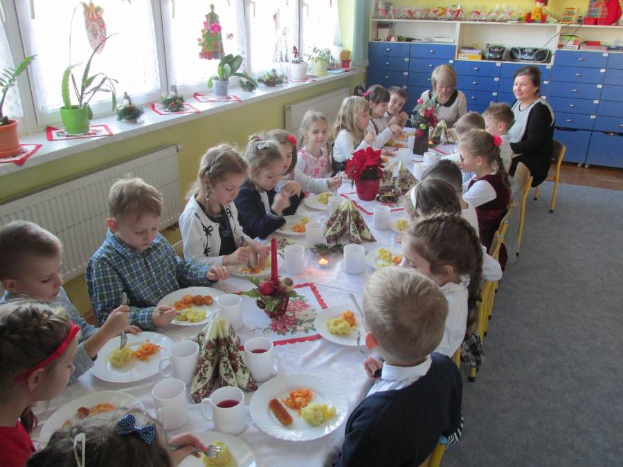 W dniu 21.12.2016r. odbyła sie w naszym przedszkolu Wigilia. Święta Bożego Narodzenia kryją w sobie niepowtarzalną magię, radość i niecierpliwe oczekiwanie na pierwszą wigilijną gwiazdkę. Dla wielu jest to czas spotkań w rodzinnym gronie, dzielenia się opłatkiem, składania życzeń najbliższym, wspólnego kolędowania. Także u nas nastał ten cudowny czas . Wspaniałym momentem było dzielenie się opłatkiem i składanie świątecznych życzeń. Dzieci smakowały barszczyk z uszkami, smażoną rybkę i i inne smakołyki. Takie podniosłe chwile nie tylko utrwalają dzieciom znajomość tradycji i zwyczajów świątecznych, lecz również, co najważniejsze wzmacniają bliskie i serdeczne relacje.