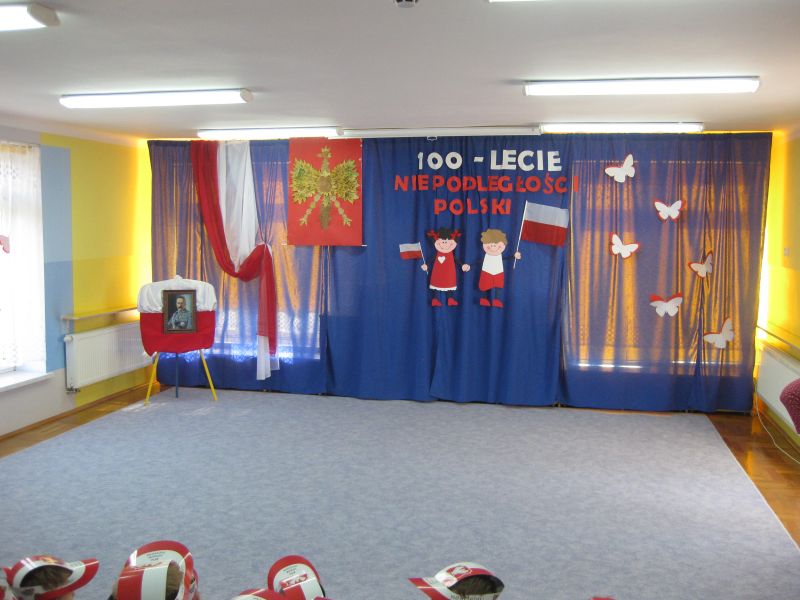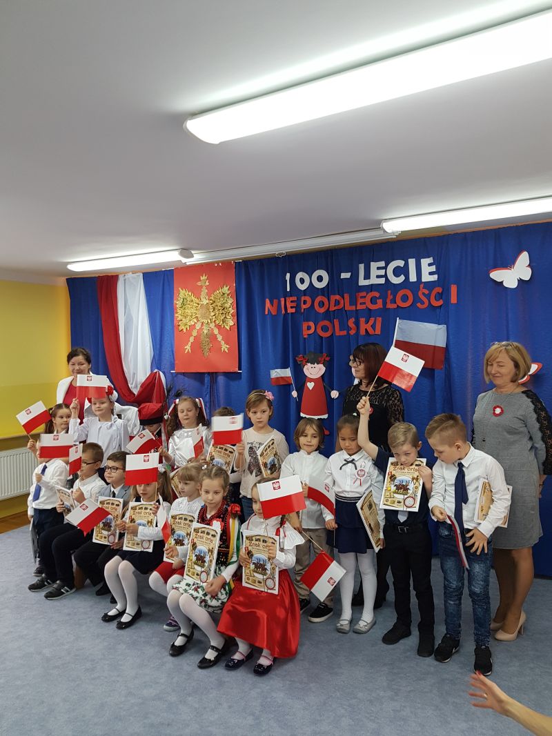 9 listopada 2018 roku z okazji 100 lecia Niepodległości Polski wszystkie dzieci z naszego przedszkola wzięły udział w uroczystej Akademii przygotowanej przez grupy starsze.W czasie uroczystości o godzinie 11.11 przedszkolaki z należytym szacunkiem odśpiewały w całości Hymn Polski.Starszaki z grup IV i V zaprezentowały wiersze i piosenki o tematyce patriotycznej ,a finałem tej podniosłej uroczystości był nasz narodowy taniec- Polonez w wykonaniu dzieci z grupy VI.