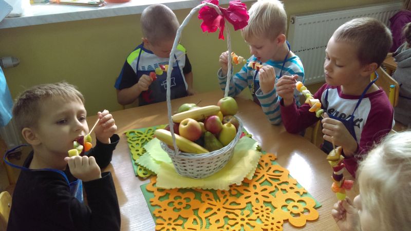 Zdrowo się odżywiamy, wszystkie owoce i warzywa znamy i bardzo chętnie w naszym przedszkolu je zjadamy.