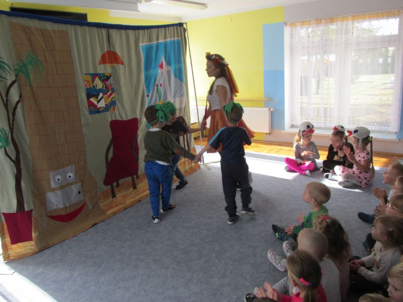 W poniedziałek 29 października odbyło się przedstawienie pt "Cztery mile za piec" wystawione przez aktorów teatru "Skrzat". Była to ciepła i pełna humoru opowieść o przygodach Zosi, która poszukiwała swojej zaginionej laleczki Petroneli. Musiała udać się do baśniowej krainy, aby ją odnaleźć. Na drodze Zosia spotykała różne postacie, które jej w tym pomagały. Przedszkolaki aktywnie uczestniczyły w przedstawieniu wcielając się w role różnych postaci.Brawa, jakimi dzieci nagrodziły aktorów świadczą o tym, że spektakl bardzo się im podobał.