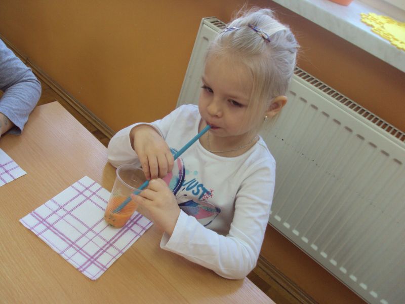 Z myślą o witaminkach dzieci z grupy IV postanowiły zrobić tzw. smoothie owocowo-warzywne, bo każdy przedszkolak wie,że należy spożywać owoce i warzywa. Przed przystąpieniem do pracy dzieci zapoznały się w jaki sposób działa urządzenie do robienia koktajlu – blender. Przygotowanie napojów było niezwykle proste,a one same okazały się prawdziwą „bombą witaminową”. Uśmiech na twarzach dzieci gościł przez cały czas procesu przyrządzania koktajli, a jeszcze szerzej uśmiechnięte buzie pojawiły się po wypiciu pysznych, a jednocześnie zdrowych napojów.