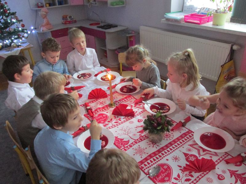 20 grudnia 2018 roku w naszym przedszkolu wspólnie obchodziliśmy Wigilię Bożego Narodzenia.Przedszkolaki w tym dniu wspólnie kolędowały, dzieliły się opłatkiem składając sobie życzenia oraz zasiadły do świątecznie udekorowanego stołu, przy którym zjadły ze smakiem wigilijny obiad.