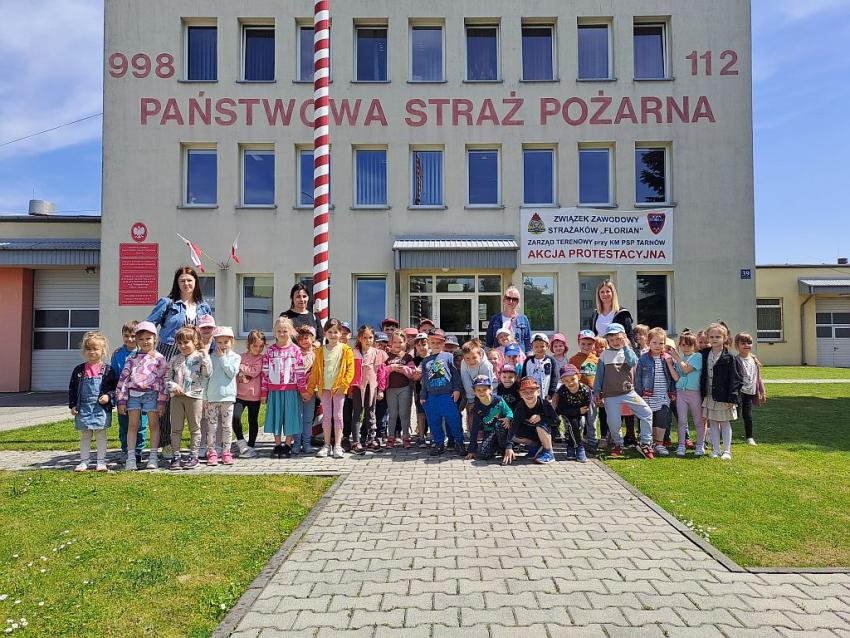 W poniedziałek 22.05.2023 r. przedszkolaki z grupy III i IV odwiedziły Jednostkę Straży Pożarnej w Tarnowie. Dzięki życzliwości Panów Strażaków przedszkolaki mogły z bliska obejrzeć samochody i sprzęt pożarniczy. W trakcie rozmowy ze strażakami dowiedziały się dużo o trudnej, odpowiedzialnej i niebezpiecznej pracy.Składamy serdeczne podziękowania Pracownikom Straży Pożarnej za umożliwienie naszym dzieciom poznania zawodu strażaka z bliska. W ramach podziękowań dzieci przygotowały laurkę za poświęcony nam czas. Tak zdobyta wiedza zachowa się na długo w ich pamięci.