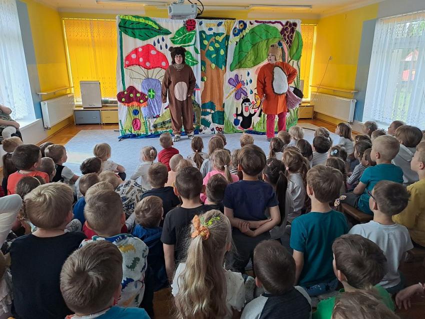 We wtorek w naszym przedszkolu odbył się spektakl teatru Canon, pt. -Wiosenna pobudka. dla dzieci ze wszystkich grup wiekowych. Podczas występu dzieci nauczyły się jak dbać o środowisko, omówiły z aktorami zmiany zachodzące w przyrodzie podczas wiosny oraz wiele innych ciekawych rzeczy. W przedstawieniu wystąpili Bociek, który wrócił z ciepłych krajów, Sójka modnisia, która jak to bywa w powiedzeniu -Wybiera się Sójka za morze, ale wybrać się nie może- , Wiewiórka Baśka, która uwielbia porządek oraz zaspany po Zimie Miś Maciek. Przy wesołym śpiewie aktorów dzieci mogły się poruszać. Radości nie było końca!