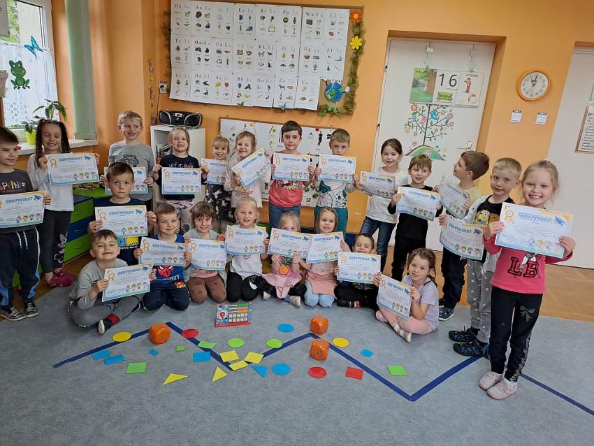 W miesiącu kwietniu grupa IV otrzymała zaproszenie z zaprzyjaźnionego przedszkola w Gałązczycach (woj. Opolskie) do wzięcia udziału w programie -Baw się razem z nami matematyką .Do wzięcia udziału w programie skłoniło nas bardzo duże zainteresowanie dzieci zagadnieniami matematycznymi. Celem programu było rozwijanie zainteresowań i nabywania umiejętności związanych z naukami ścisłymi, a także rozwijanie motywacji do nauki jako źródła wiedzy, a także: wspieranie ciekawości, aktywności i samodzielności w toku podejmowanych działań z zakresu edukacji matematycznej. Program realizowany był w grupie dzieci 5 - letnich od kwietnia do maja 2023 r. W ramach programu realizowane były zabawy i ćwiczenia z zakresu matematycznego. Każdy dzień skupiał się na innym obszarze tematycznym: orientacja przestrzenna, rozwijanie umiejętności liczenia, zbiory, wielkość, kolor, kształt ? figury geometryczne, ćwiczenie spostrzegawczości, pamięci i koncentracji uwagi, ćwiczenie logicznego myślenia i analizowania danych, gry i zabawy z wykorzystaniem komputera lub tablicy interaktywnej. Aby poznać się bliżej dzieci mogły porozmawiać ze sobą poprzez spotkania online ? prowadząc video konferencje, podczas których grupy na przemian zadawały sobie zagadki, pytania wspólnie się bawiąc i rozmawiając jak radziły sobie w potyczkach matematycznych. To był bardzo fajny czas i miłe doświadczenie.