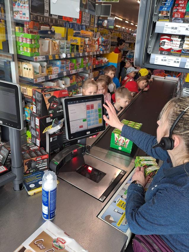 Zgodnie z realizacją bloku tematycznego -Poznajemy zawody, dzieci z grupy IV wybrały się na wycieczkę po najbliższej okolicy. Dzieci zwiedzały kuchnię przedszkolną, gdzie przyglądały się pracy pań kucharek, które właśnie przygotowywały dla nas pyszny obiadek:) Następnie wybraliśmy się do pobliskiego sklepu spożywczego zobaczyć jak wygląda praca sprzedawcy , a przy okazji zrobiliśmy małe zakupy.