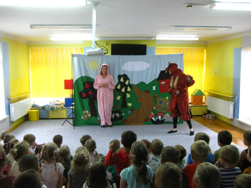 Do naszego przedszkola  zawitali aktorzy Teatru Skrzat, którzy przedstawili dzieciom spektakl pt. „O Prosiaczku Brudasku”. Głównym bohaterem był Prosiaczek ,który nie dbał o higienę,a wszystko co jadł było umazane w błotku.Zwierzątka z okolicy nazwały go Brudaskiem.Prosiaczek lubił przekąski typu: chipsy, cukierki i cola,które nie wpłynęły dobrze na jego zdrowie. Dzięki postaci Prosiaczka dzieci miały okazję przekonać się, jakie są skutki niezdrowego trybu życia oraz utrwalić wiedzę na temat higieny i właściwego sposobu odżywiania.