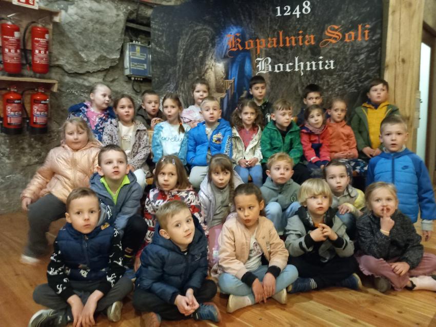 W dniu 16.05 2025 roku grupa „Skrzaty” uczestniczyła w wycieczce autokarowej do Kopalni soli w Bochni. Przedszkolaki spotkały się ze Skarbnikiem - Duchem bocheńskiej kopalni, który opowiedział skąd się wzięła sól na ziemiach polskich oraz podarował każdemu woreczek soli.Dzieci odkrywały magiczny świat kopalni. Podziwiały solne komory z podziemną ekspozycją multimedialną, która przeniosła przedszkolaków w fascynującą podróż przez historię kopalni. Rozpoczęliśmy w średniowieczu, by dotrzeć aż do współczesności, spotykając polskich królów, żupników genueńskich oraz ducha Cystersa. Część trasy pokonaliśmy górniczą kolejką. Zwiedzając kopalnię spędziliśmy również czas w Komorze Ważyn – największej z bocheńskich komór, gdzie znajduje się boisko sportowe oraz plac zabaw dla dzieci. Wróciliśmy bezpiecznie do przedszkola zmęczeni, ale bardzo zadowoleni.