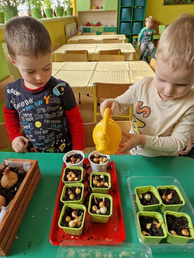 Wiosna zbliża się dużymi krokami, dlatego dzieci z grupy V założyły w sali hodowlę szczypiorku i rzeżuchy. Przedszkolaki opiekowały sie hodowlą każdego dnia:z cebulek wyrósł piekny szczypior,a z nasion dorodna rzeżucha.Wychodowane pyszności "Liski"skonsumowały jako dodatek do kanapek.