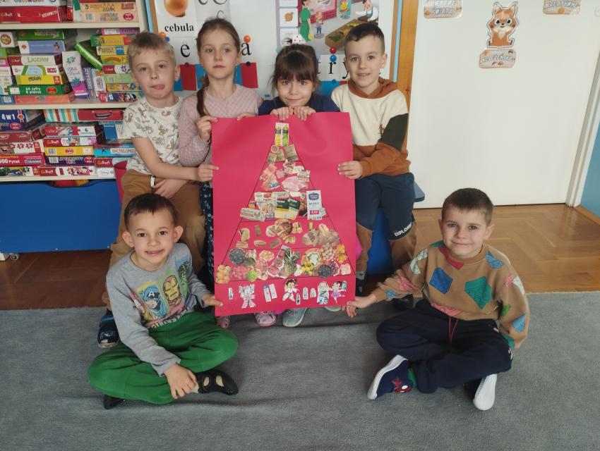 Realizując temat "Dbam o zdrowie", grupa V przypomniała sobie zasady zdrowego odżywiania.Dzieci aktywnie wykonywały piramidę żywienia oraz przygotowywały pyszny i zdrowy sok cytrynowo-pomarańczowy.