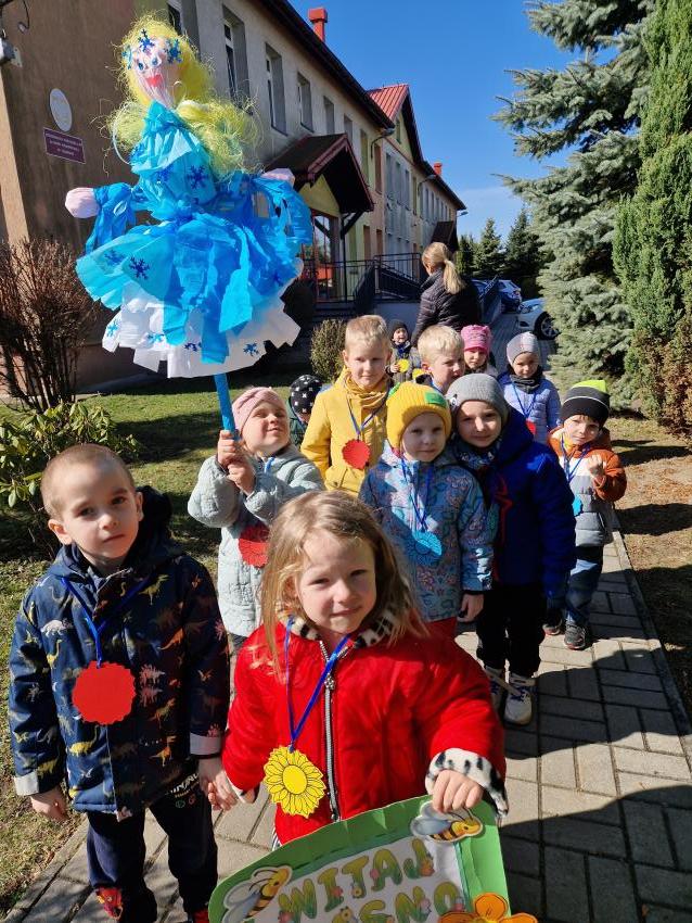 21 marca wszystkie dzieci z naszego przedszkola świętowały nadejście wiosny. Dzień rozpoczęliśmy od rozmów o nowej porze roku oraz od wesołych zabaw przy muzyce. Uśmiechnięci, wszyscy wyruszyliśmy do naszego ogrodu ,w którym śpiewając głośno piosenki o wiośnie odstraszaliśmy zimną porę roku.Wiosennym pochodem wraz z Marzannami po pobliskim osiedlu, pożegnaliśmy zimę.Cieszymy się, że w taki sposób mogliśmy w pełni przywitać wiosnę, która obdarowała nas ciepłymi promieniami słońca.