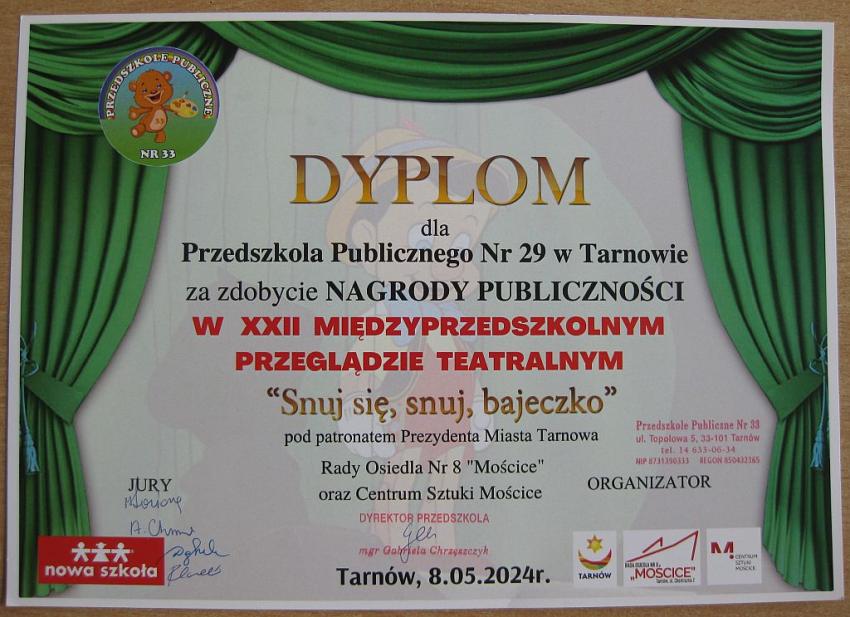 Grupa V -JEŻYKI-brała udział w XXII Międzyprzedszkolnym Konkursie Teatralnym -SNUJ SIĘ,SNUJ BAJECZKO. Dzieci z grupy V przedstawiły bajkę -Szewczyk Dratewka-za którą otrzymały Nagrodę Publiczności.Wręczenie nagród odbyło się na scenie Centrum Sztuki Mościce w Mościcach. Indywidualne nagrody otrzymali: za rolę Czarownicy -Nina S., za rolę Szewczyka Dratewki -Maks Cz. Wszystkim młodym aktorom serdecznie gratulujemy!