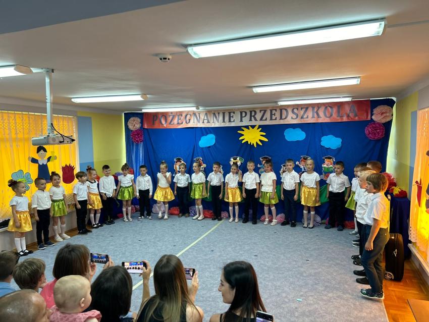 20 czerwca 2024r na Uroczystości Pożegnania Przedszkola starszaki z grupy V -JEŻYKI - wystąpiły po raz ostatni.Cztery lata wspólnych zabaw i nauki minęły bardzo szybko.Pamiętając spędzone chwile, przedszkolaki wracały  wspomnieniami do minionych lat,prezentując piosenki, wiersze i tańce.Narodowym tańcem polskim- Polonezem- Jeżyki symbolicznie wkroczyły na kolejny etap edukacji w szkole.