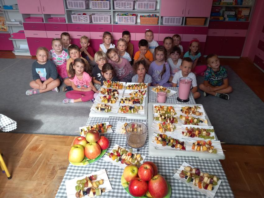 W tygodniu poświęconym zdrowemu żywieniu grupa Skrzaty wykonała owocowe smakołyki. Dzieci z wielkim zaangażowaniem oraz zachowaniem bezpieczeństwa i higieny kroiły, blendowały i wyciskały przyniesione różnorodne owoce. Skrzaty poznały zasady działania urządzeń, takich jak: blender,czy elektryczna wyciskarka do owoców.Dzięki zgodnej współpracy powstały: sok, sałatka, smoothie, szaszłyczki wieloowocowe oraz pyszny koktajl. Wspólna praca zakończyła się degustacją. Szaszłyczki były dodatkiem do gofrów podczas podwieczorku.