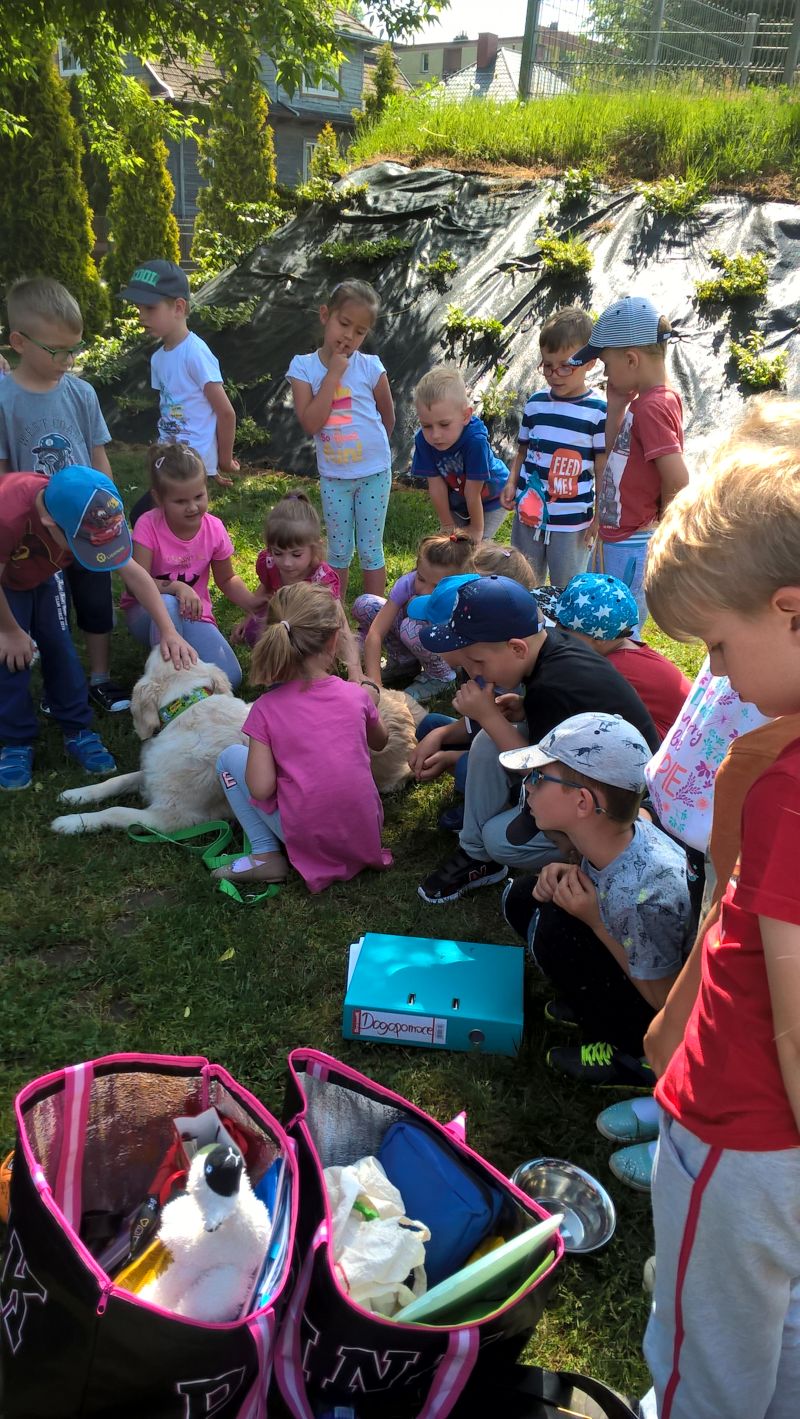 Dnia 8.05.2018r. przedszkolaków odwiedził specjalny gość pies Sorgo wraz ze swoim opiekunem. W czasie spotkania dzieci miały okazję dowiedzieć się jaką rolę odgrywa pies w społeczeństwie. Uczyły się jak bezpiecznie i odpowiedzialnie postępować z psem .Dzieci miały okazję przełamać lęk przed czworonogami i pogłębić kontakt przez podejście do psa i pogłaskanie. Bezpośredni kontakt ze zwierzętami przełamuje lęk, nieśmiałość , buduje poczucie bezpieczeństwa . Zajęcia te dostarczyły dzieciom wiele pozytywnej energii. Bardzo miło będziemy wspominać to spotkanie.