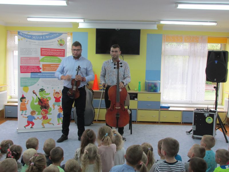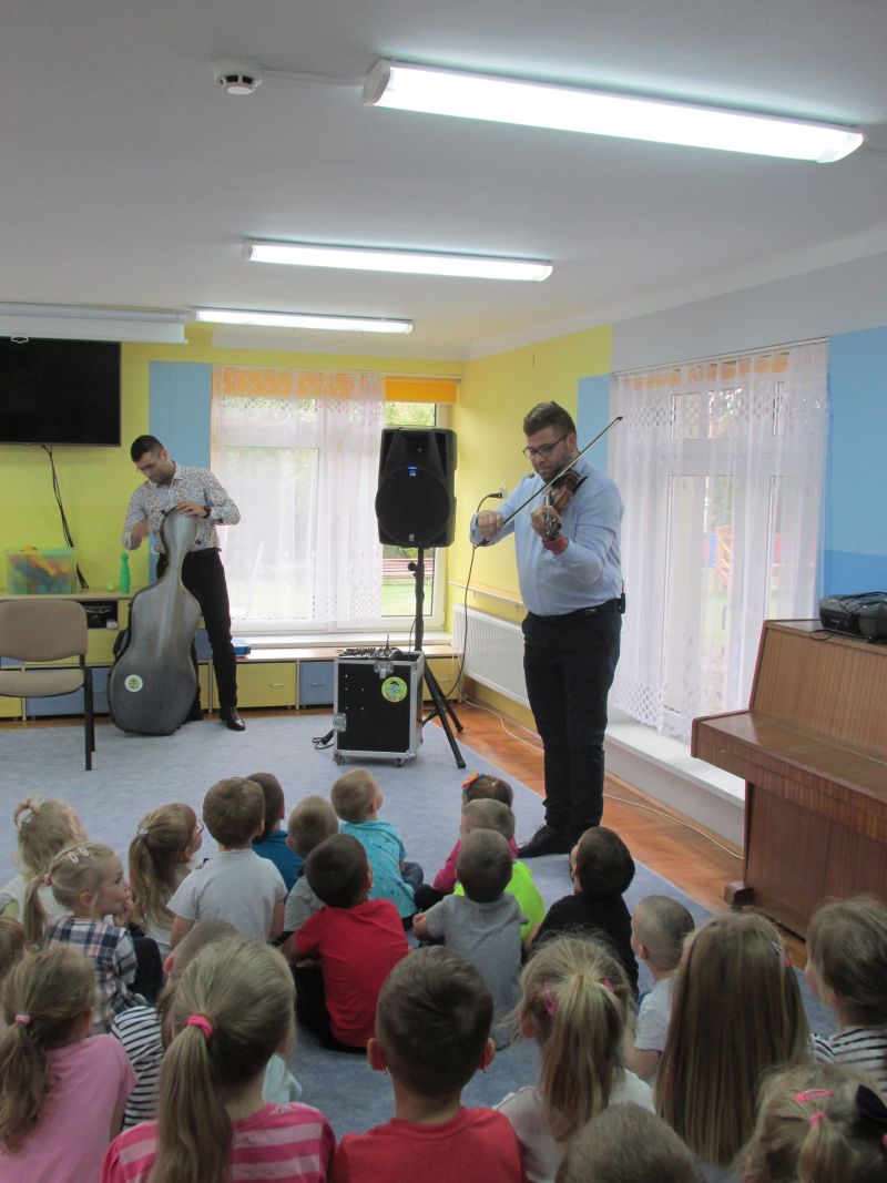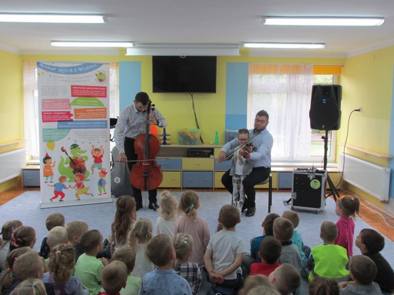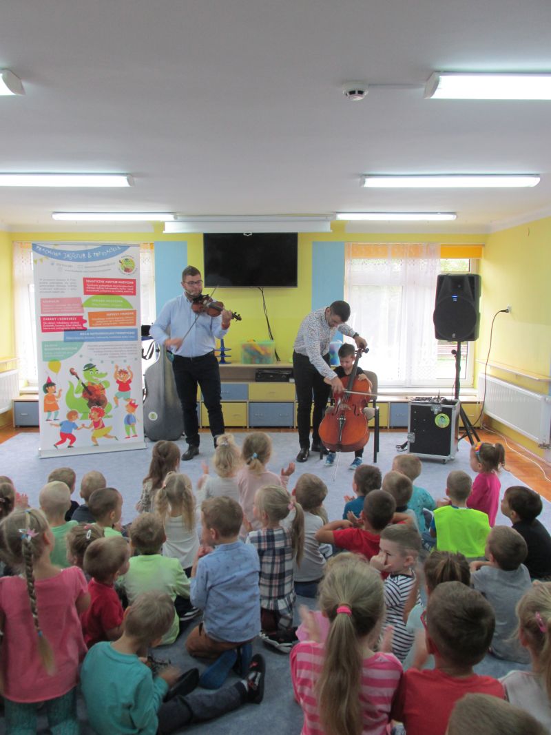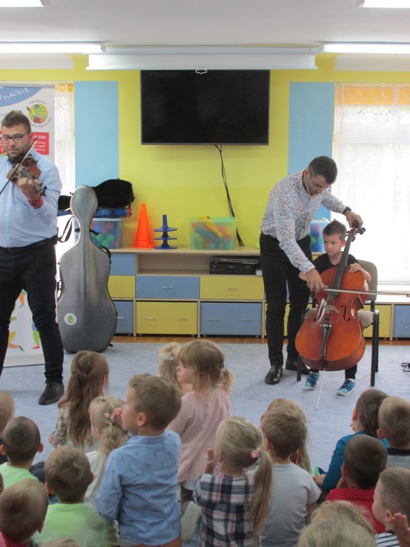 27 września 2018r do naszego przedszkola przyjechali muzycy z Pracowni Jaszczur & Przyjaciele.Dzieci poznały budowę i brzmienie instrumentów smyczkowych :skrzypiec i wiolonczeli. Zabawa była wyśmienita!