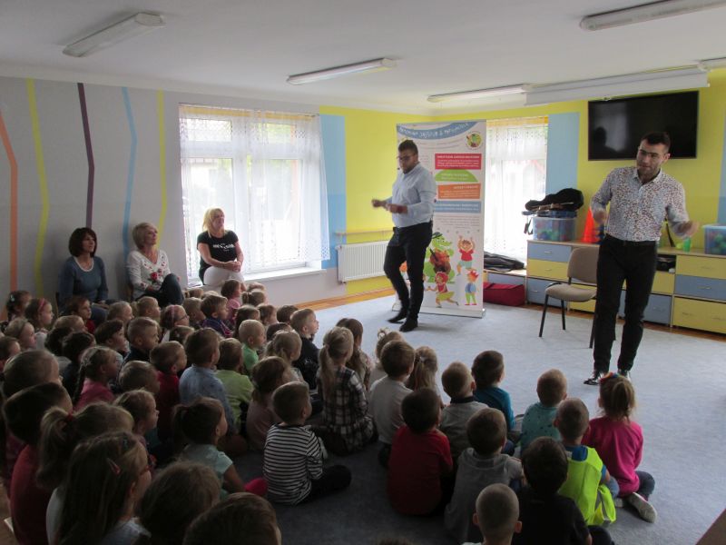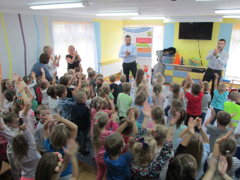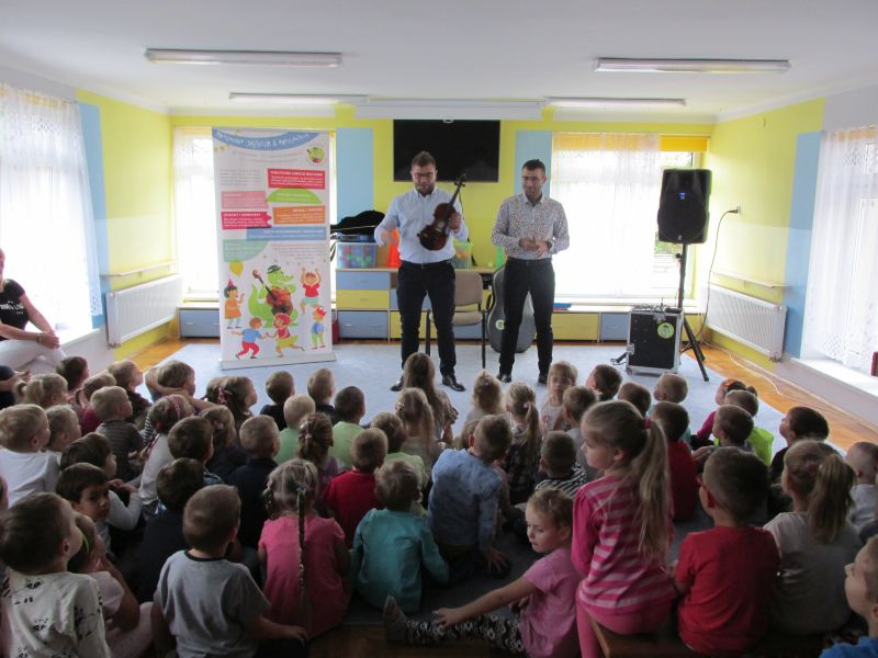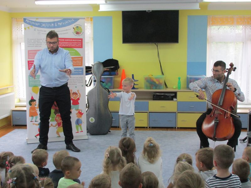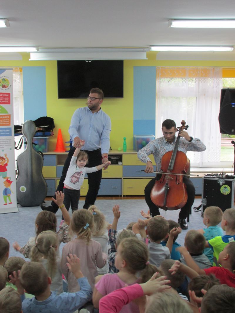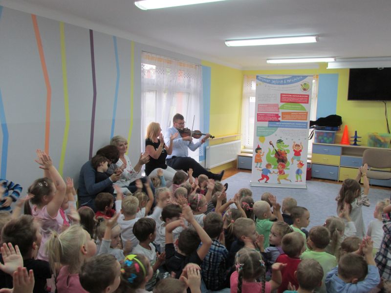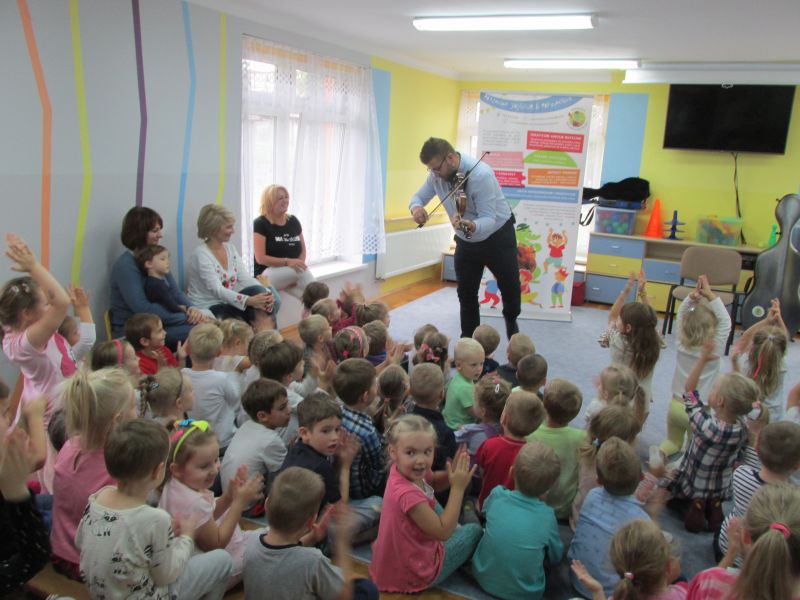 27 września 2018r do naszego przedszkola przyjechali muzycy z Pracowni Jaszczur & Przyjaciele.Dzieci poznały budowę i brzmienie instrumentów smyczkowych :skrzypiec i wiolonczeli. Zabawa była wyśmienita!