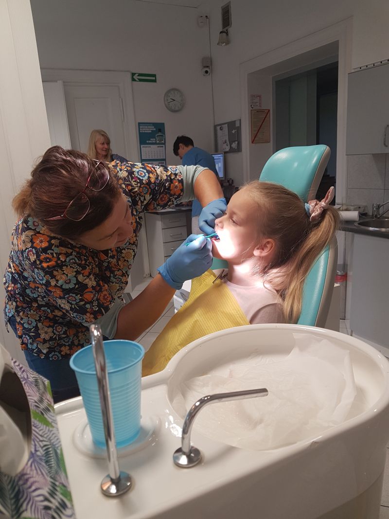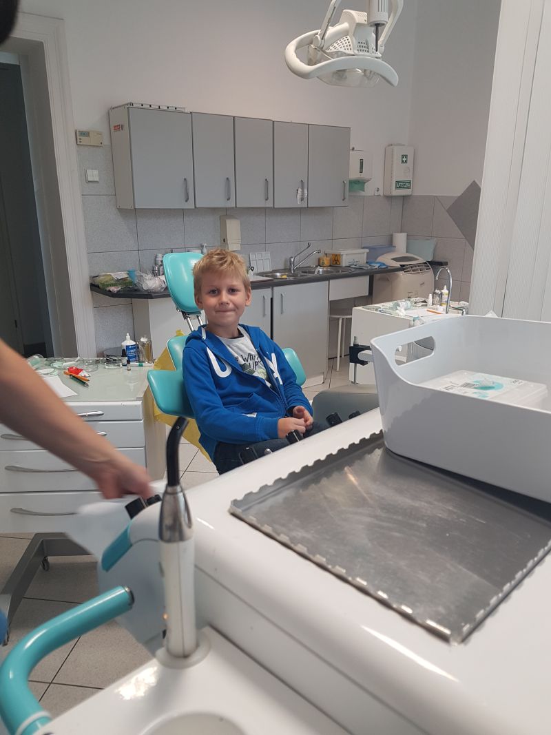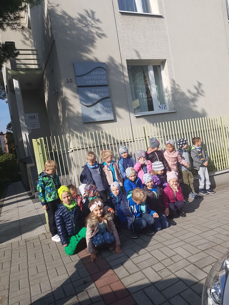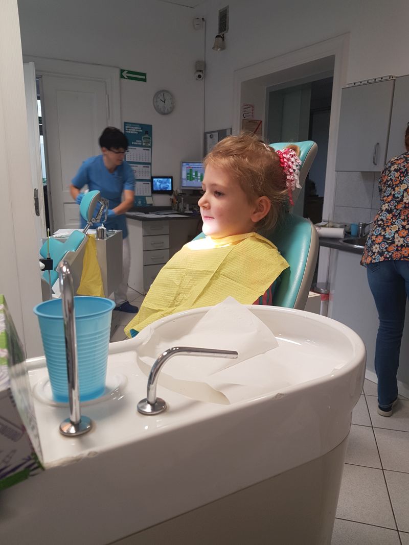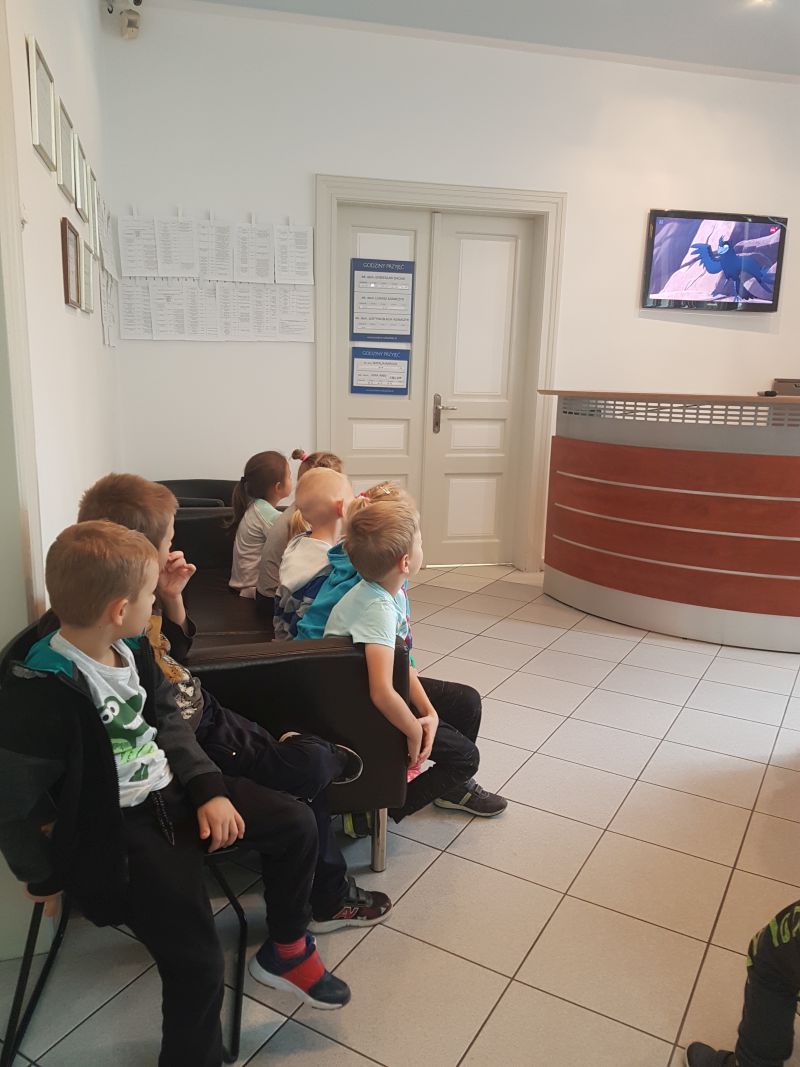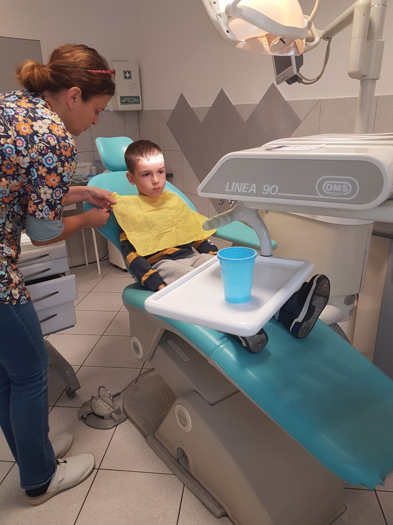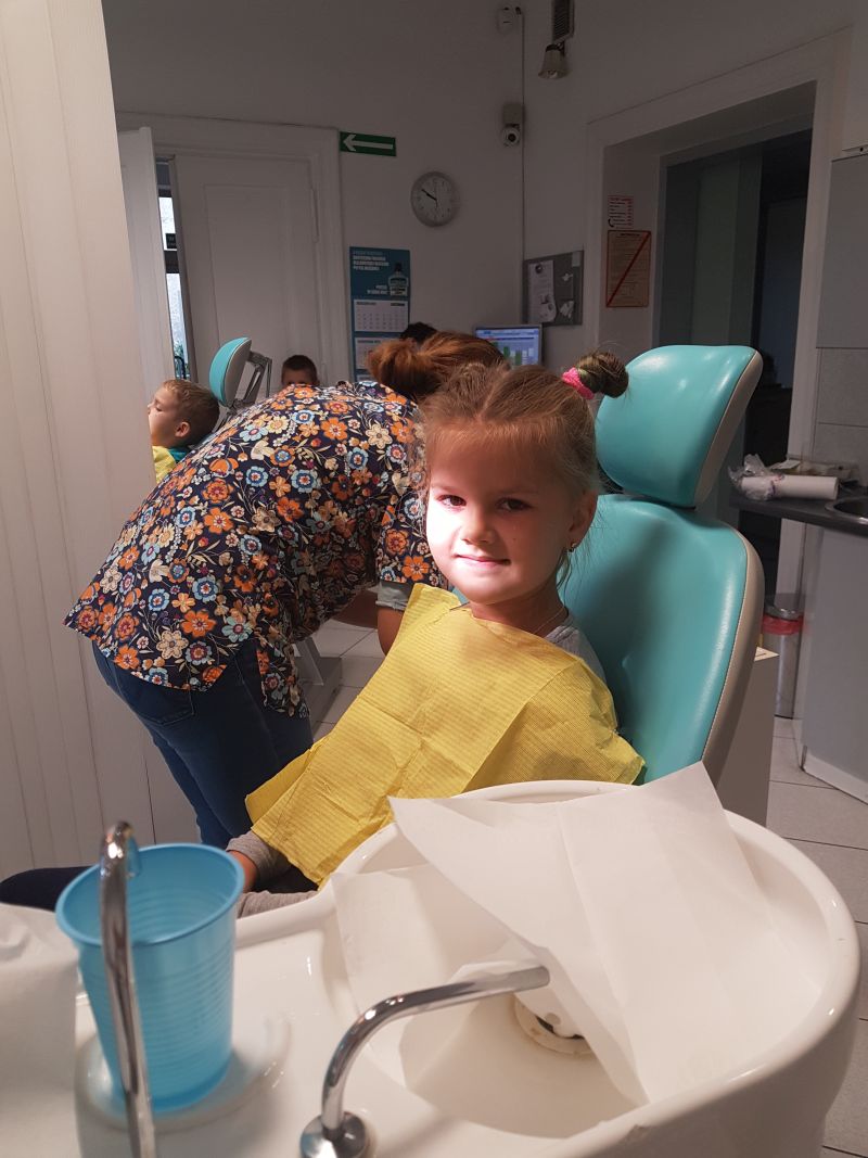 W październiku 2018 r grupy starszaków udały się do gabinetu stomatologicznego .Pani stomatolog podczas przeglądu małych ząbków,doradzała dzieciom jak należy o zęby dbać: jak i czym je czyścić ,jak płukać wodą i gdzie się udać gdyby z ząbkiem zaczęło się dziać coś niedobrego.Mali pacjenci uważnie słuchali rad i z uśmiechem wrócili do przedszkola.