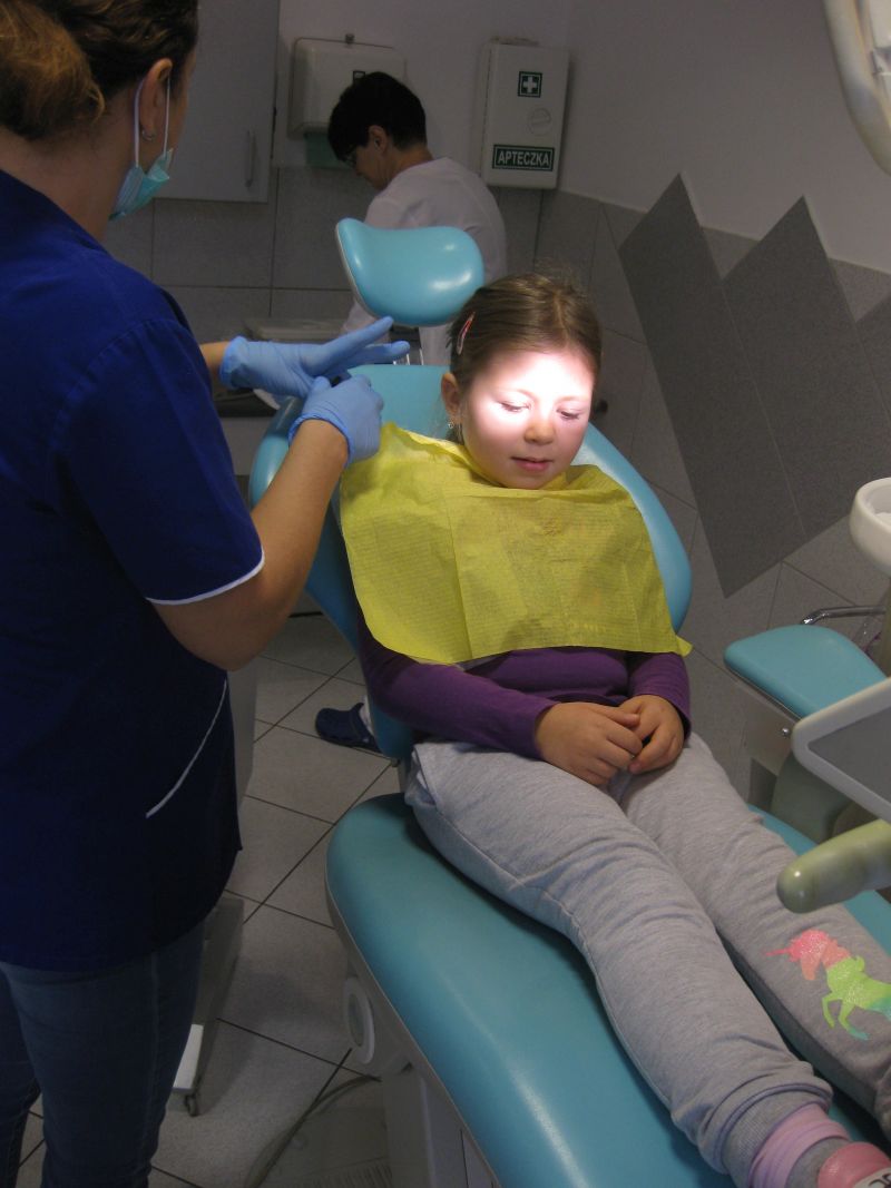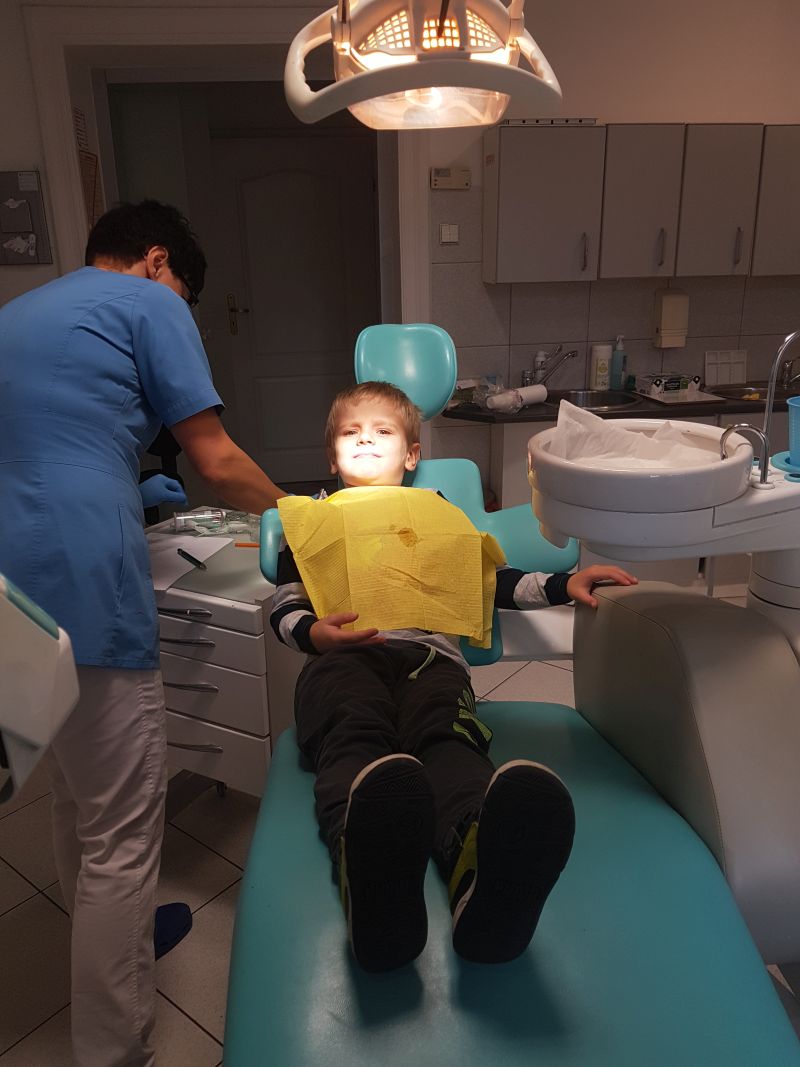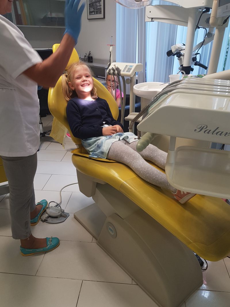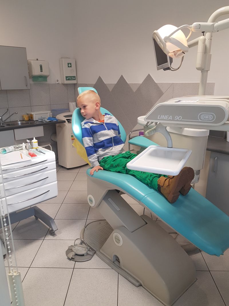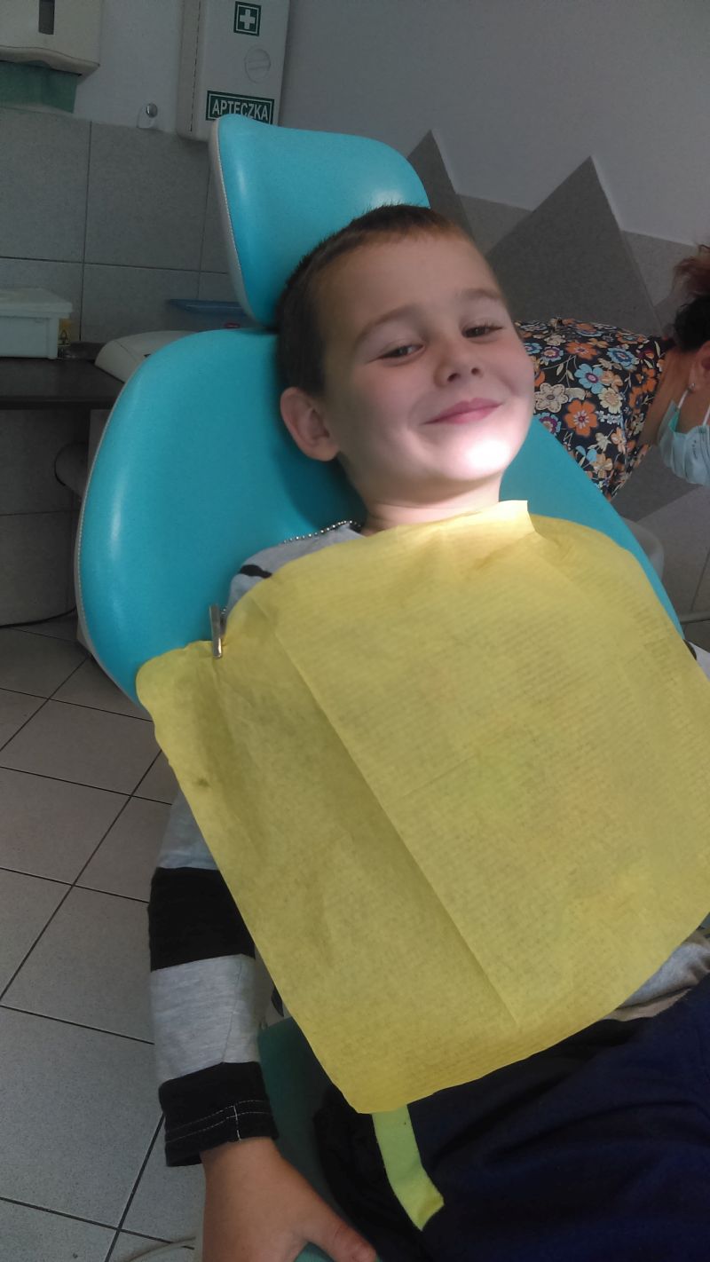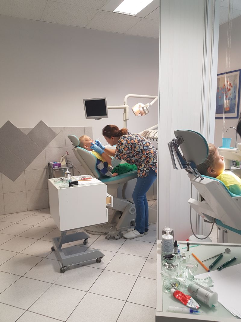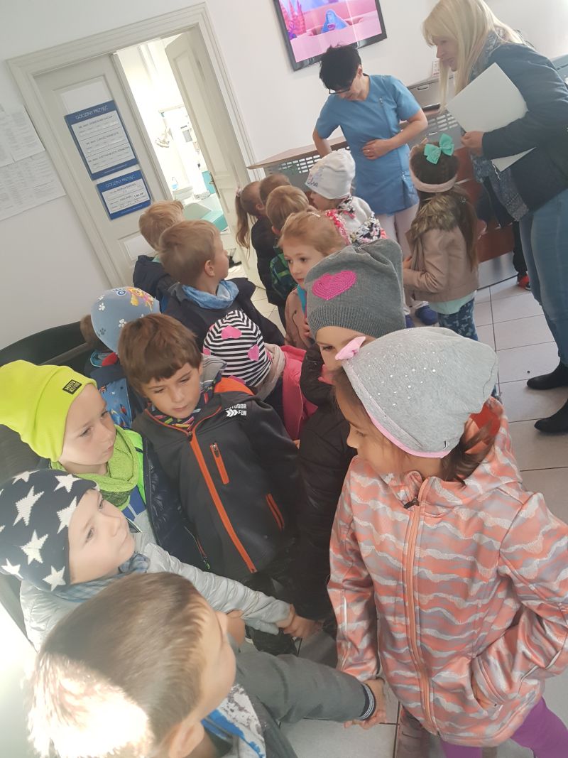 W październiku 2018 r grupy starszaków udały się do gabinetu stomatologicznego .Pani stomatolog podczas przeglądu małych ząbków,doradzała dzieciom jak należy o zęby dbać: jak i czym je czyścić ,jak płukać wodą i gdzie się udać gdyby z ząbkiem zaczęło się dziać coś niedobrego.Mali pacjenci uważnie słuchali rad i z uśmiechem wrócili do przedszkola.
