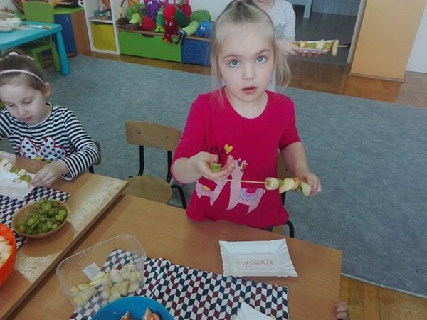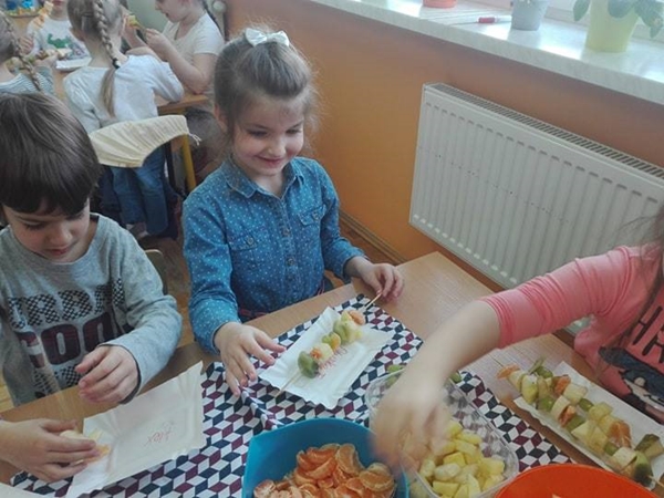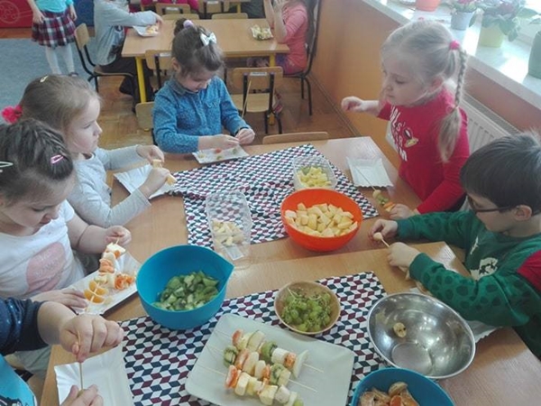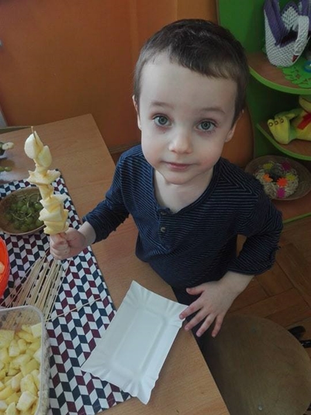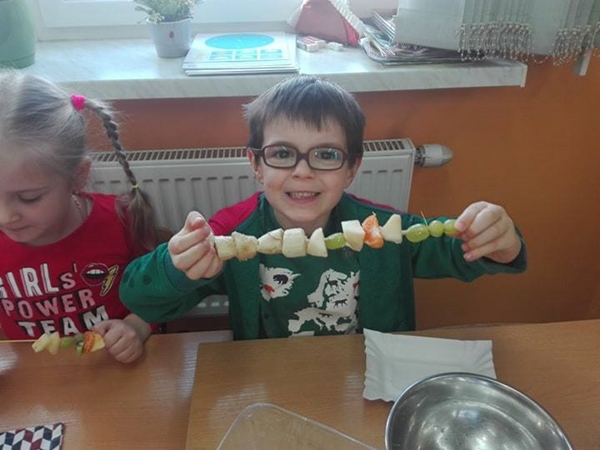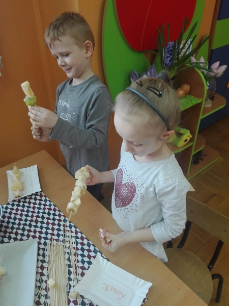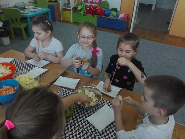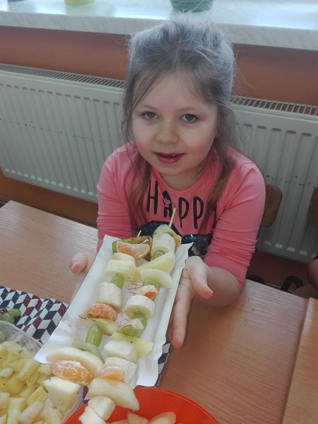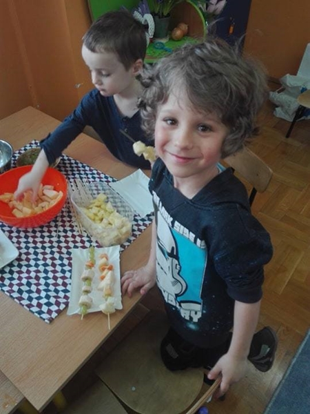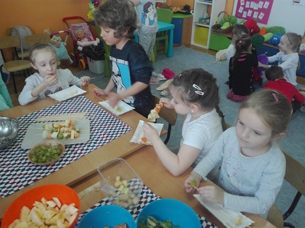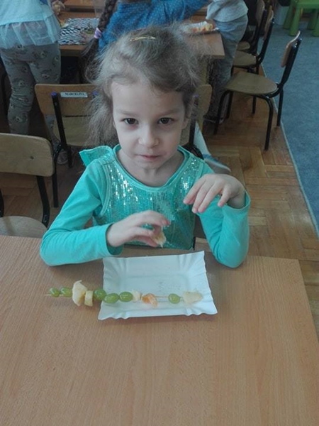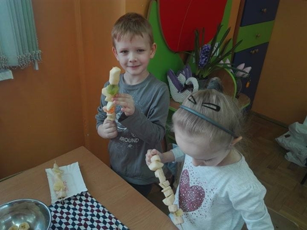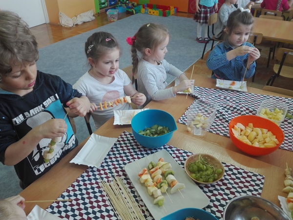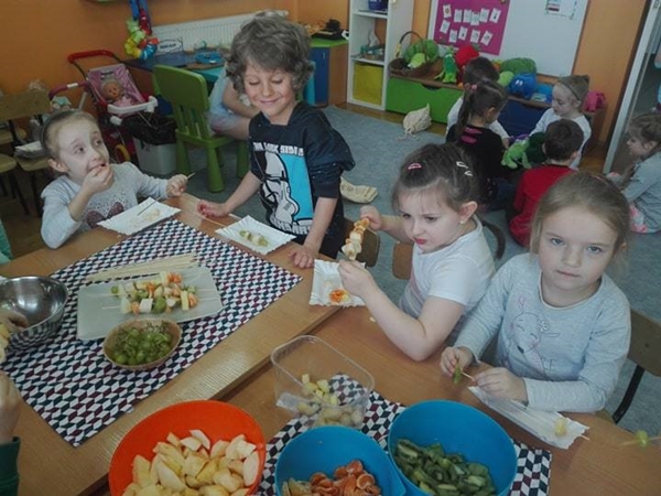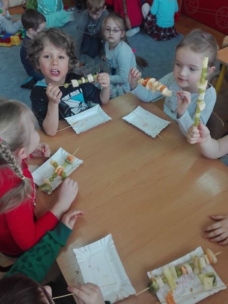 Owoce są źródłem witamin, dlatego na zajęciach zachęcamy dzieci do ich spożywania. Najlepszym sposobem na przekonanie przedszkolaków do spożywania owoców są działania praktyczne, dzięki którym "SKRZATY" z grupy IV zrobiły pyszne owocowe szaszłyki. Była to również okazja do porównywania wyglądu i smaku wybranych owoców. Po skończonej pracy wszystkie dzieci ze smakiem zjadły owocowe przysmaki. Przedszkolakom bardzo smakowała własnoręcznie wykonana potrawa. Przygotowanie szaszłyków dało dzieciom wiele satysfakcji i radości.