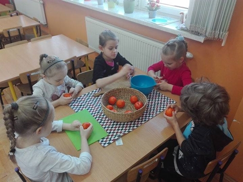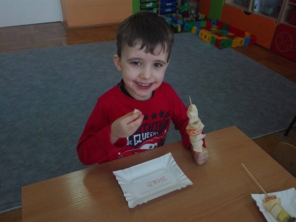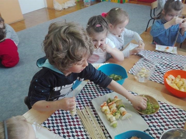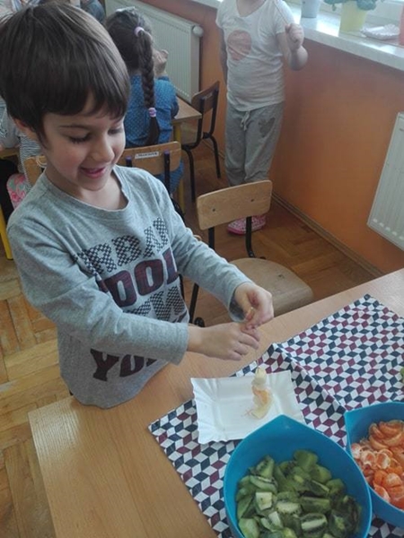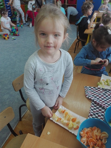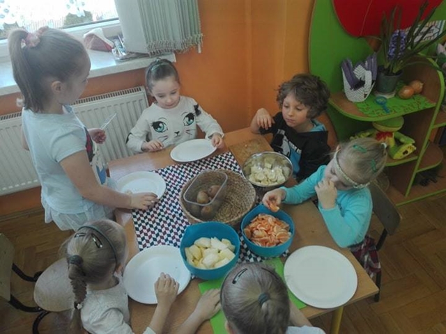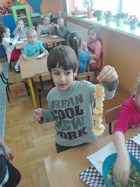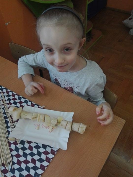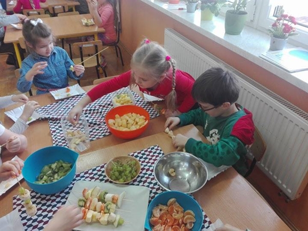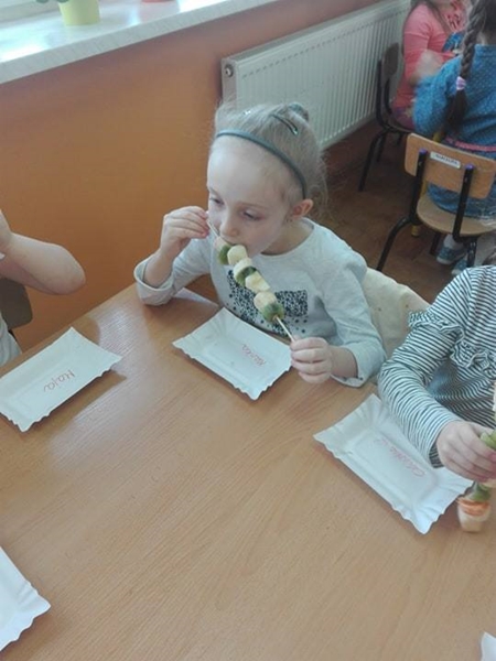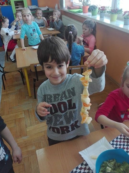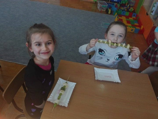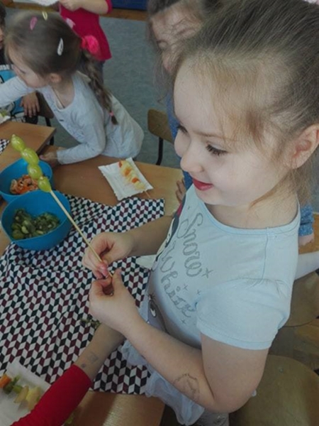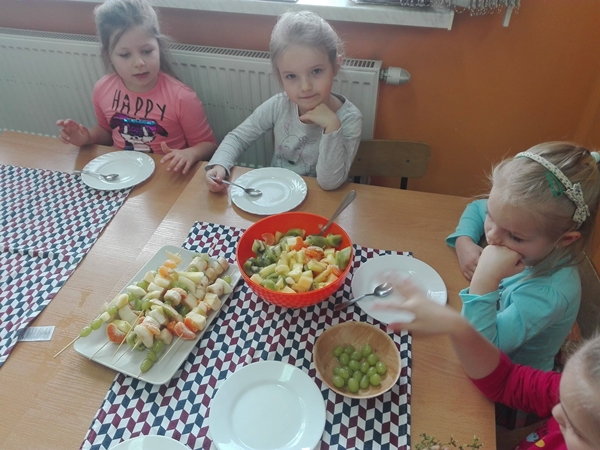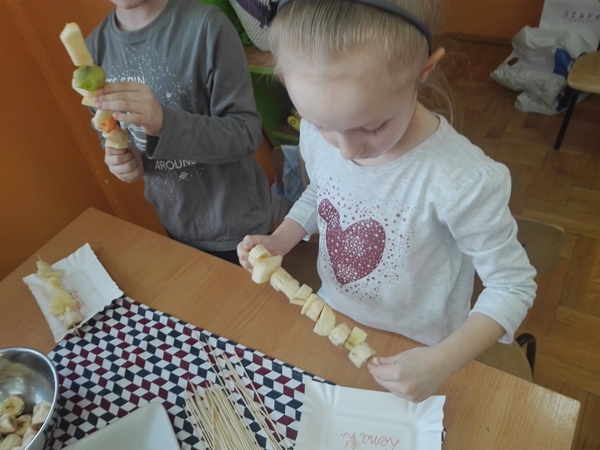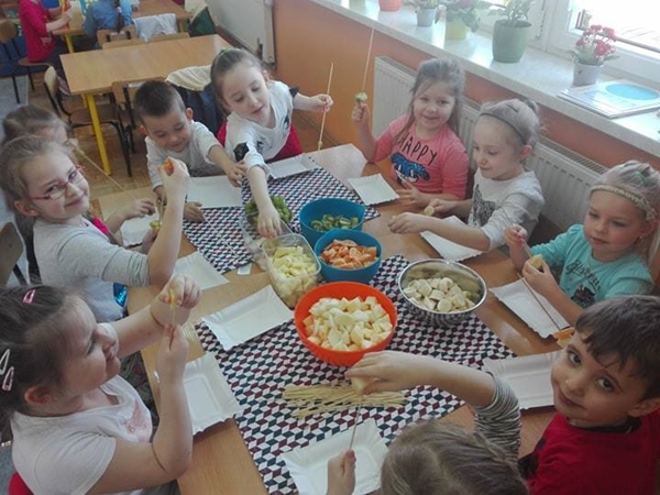 Owoce są źródłem witamin, dlatego na zajęciach zachęcamy dzieci do ich spożywania. Najlepszym sposobem na przekonanie przedszkolaków do spożywania owoców są działania praktyczne, dzięki którym "SKRZATY" z grupy IV zrobiły pyszne owocowe szaszłyki. Była to również okazja do porównywania wyglądu i smaku wybranych owoców. Po skończonej pracy wszystkie dzieci ze smakiem zjadły owocowe przysmaki. Przedszkolakom bardzo smakowała własnoręcznie wykonana potrawa. Przygotowanie szaszłyków dało dzieciom wiele satysfakcji i radości.