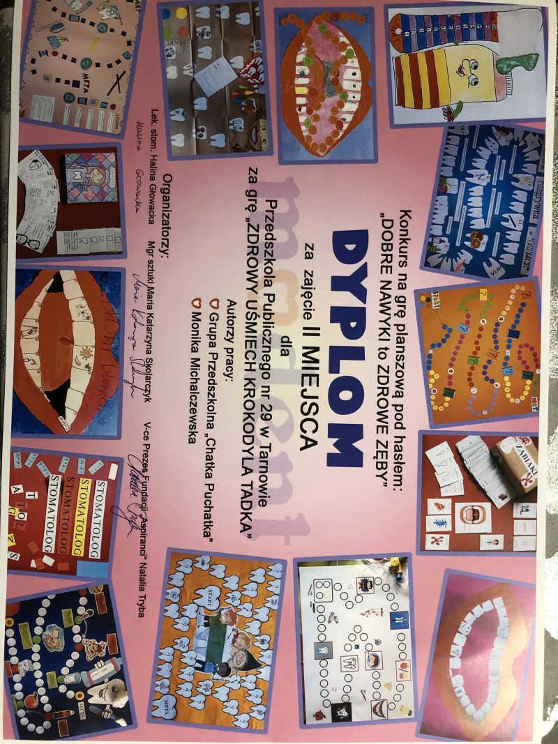 Z radością informujemy, że nasze przedszkolaki z oddziału "Chatka Puchatka" zajęły II miejsce w konkursie organizowanym przez gabinet stomatologiczny Modent na grę planszową pod hasłem "Dobre nawyki to zdrowe zęby". Dzieci stworzyły grę planszową pt. "Zdrowy uśmiech krokodyla Tadka", która na gali rozdania nagród cieszyła się dużą aprobatą. Gratulujemy i życzymy dalszych sukcesów!