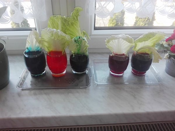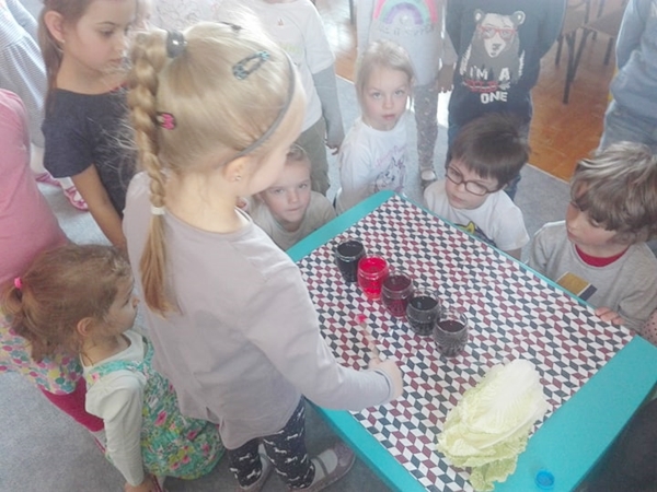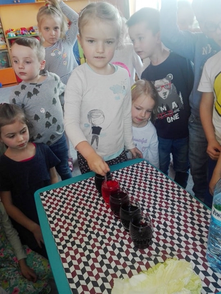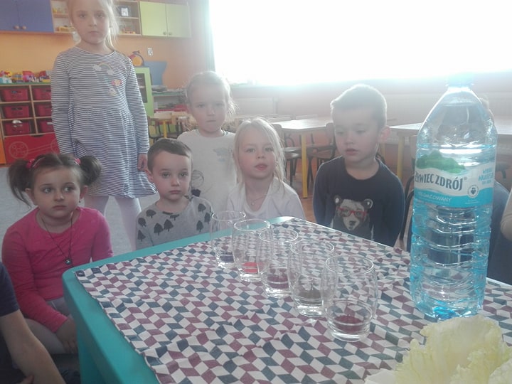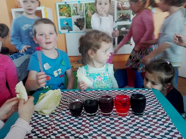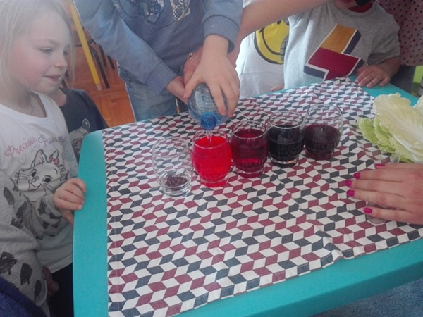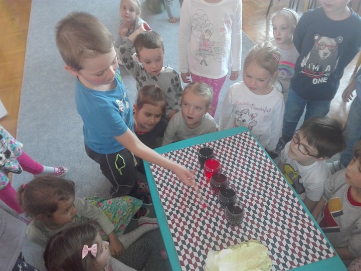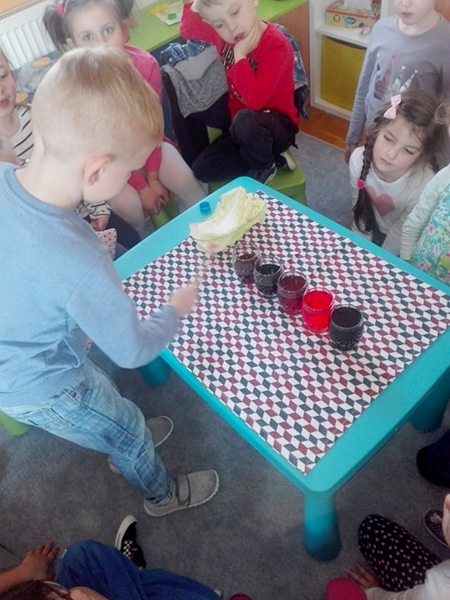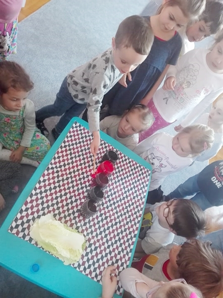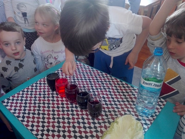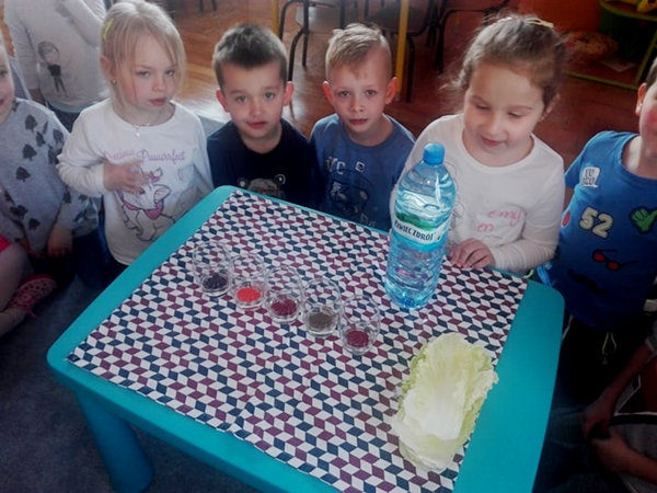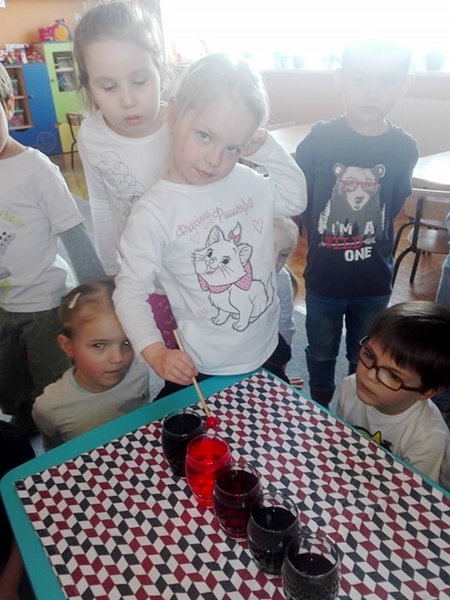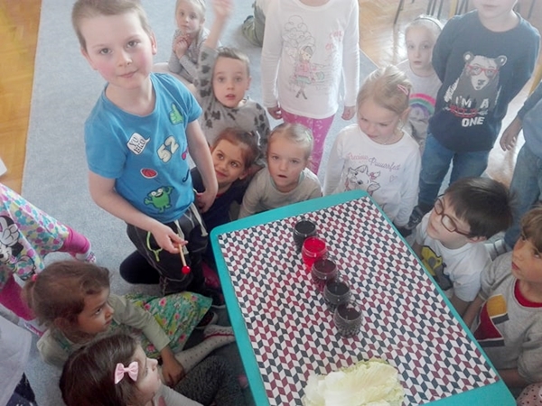 Czy woda gra? Przedszkolaki z grupy IV przeprowadzały eksperymenty z wodą. Na początku dzieci zabarwiły wodę na różne kolory po czym bawiły się wesoło w zabawę kolorowe dźwięki wody. Każdy miał szansę odtworzyć własną, wymyśloną melodię. Dowiedziały się pewnej ciekawostki-kiedy wlejemy więcej wody do szklanki, ta będzie miała niższy dźwięk, a kiedy wlejemy mniej wody, dźwięk będzie wyższy. Na zakończenie do wody z barwnikiem w każdej ze szklanek umieściliśmy jednego liścia kapusty pekińskiej. Ze zniecierpliwieniem wyczekiwaliśmy jaki będzie efekt... Już po kilku minutach widać było jak liście zaczynają przybierać kolorowe barwy. Dzieci były zachwycone i zdecydowanie mogły stwierdzić, że roślinki tak jak człowiek potrzebują wody do picia.