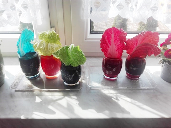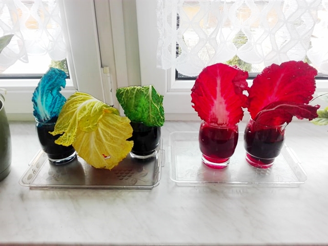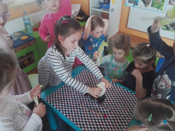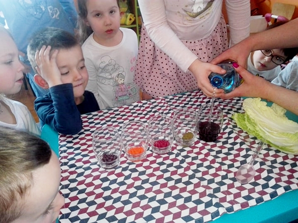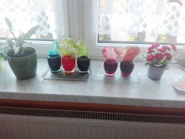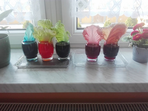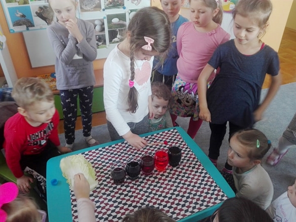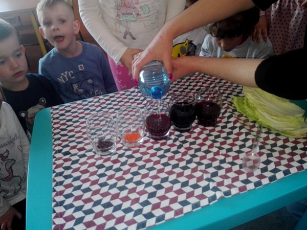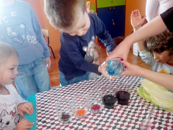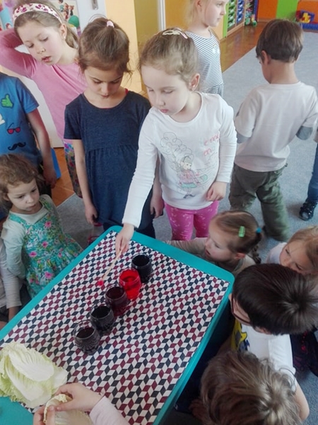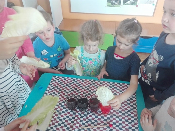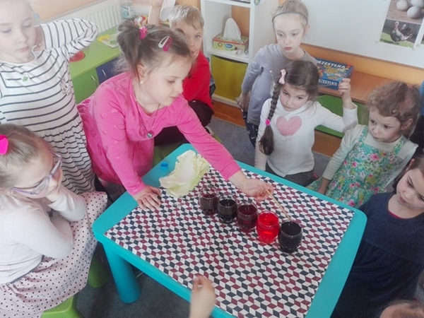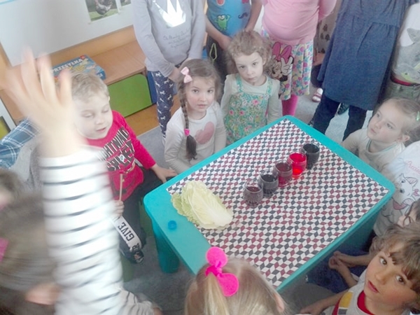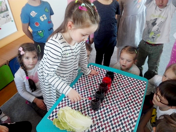 Czy woda gra? Przedszkolaki z grupy IV przeprowadzały eksperymenty z wodą. Na początku dzieci zabarwiły wodę na różne kolory po czym bawiły się wesoło w zabawę kolorowe dźwięki wody. Każdy miał szansę odtworzyć własną, wymyśloną melodię. Dowiedziały się pewnej ciekawostki-kiedy wlejemy więcej wody do szklanki, ta będzie miała niższy dźwięk, a kiedy wlejemy mniej wody, dźwięk będzie wyższy. Na zakończenie do wody z barwnikiem w każdej ze szklanek umieściliśmy jednego liścia kapusty pekińskiej. Ze zniecierpliwieniem wyczekiwaliśmy jaki będzie efekt... Już po kilku minutach widać było jak liście zaczynają przybierać kolorowe barwy. Dzieci były zachwycone i zdecydowanie mogły stwierdzić, że roślinki tak jak człowiek potrzebują wody do picia.